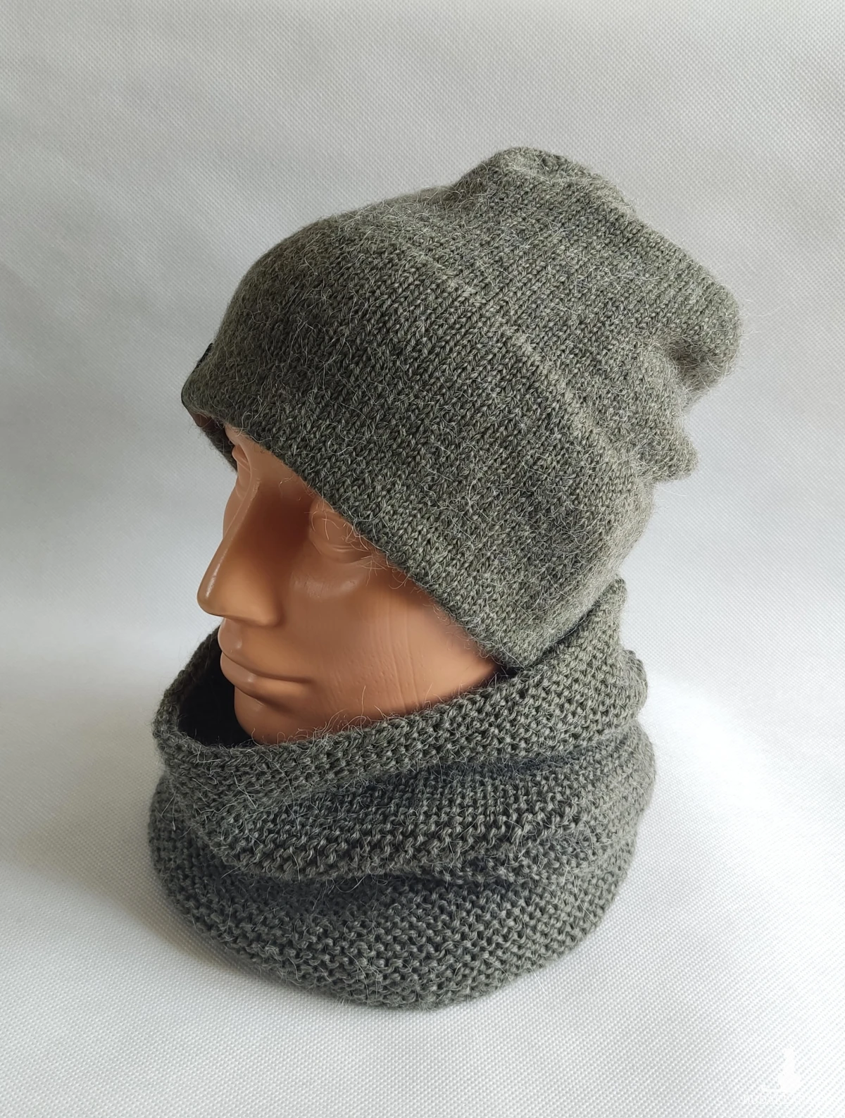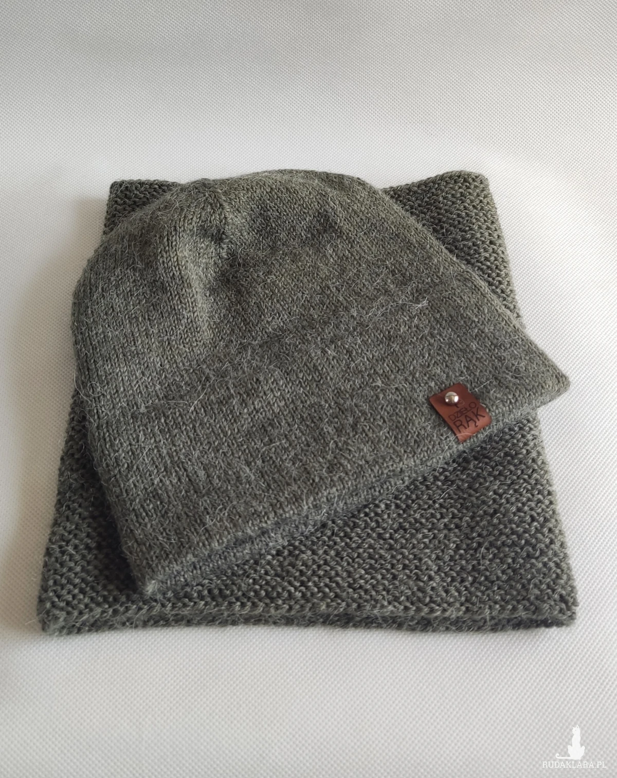 W skład zestawu wchodzi komin tuba i czapka o klasycznym fasonie, na szerokim podwójnym podwinięciu, dopasowującym się do kształtu głowy.
