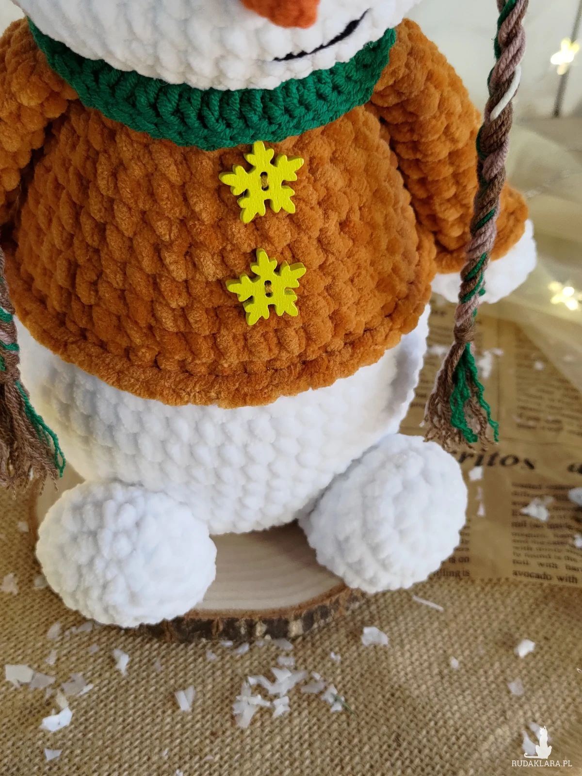 • Bałwanek jest ubrany w sweterek (niezdejmowany) ceglasto-pomarańczowy z żółtymi drewnianymi guzikami w kolorze żółtym. Na szyje ma szalik zielony z włóczki półbawełnianej.