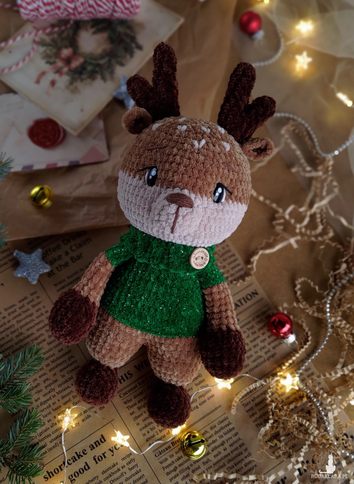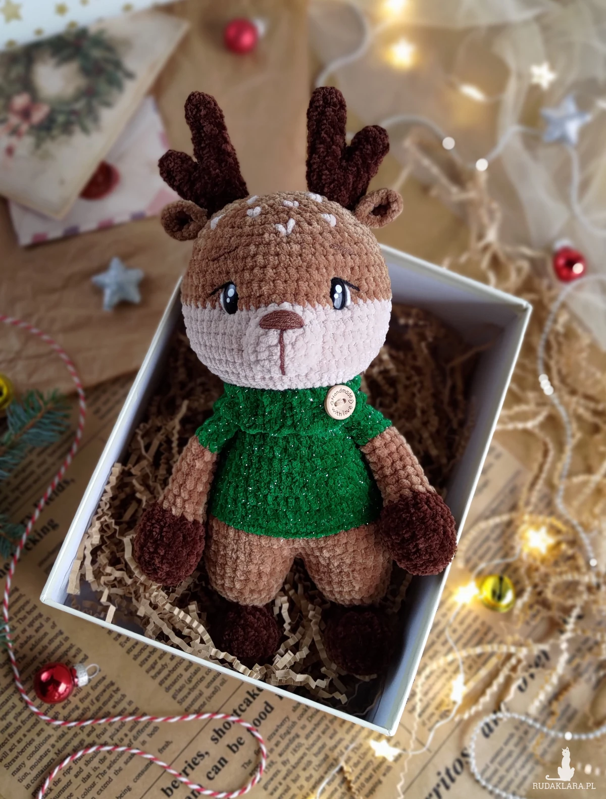 • Renifer jest ubrany w sweterek (nie jest zdejmowany) w kolorze szmaragdowym z błyszczącą nicią.