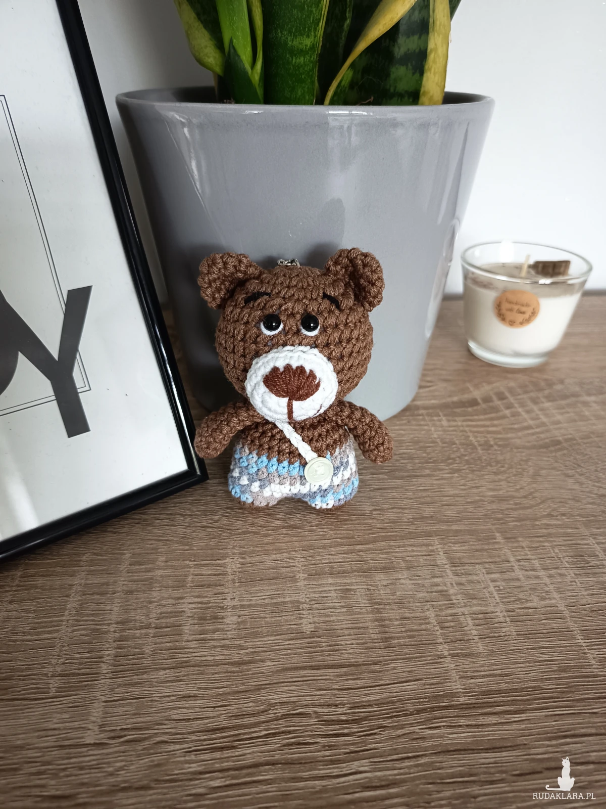 Miś szydełkowy w niebieskich spodenkach brelok zawieszka