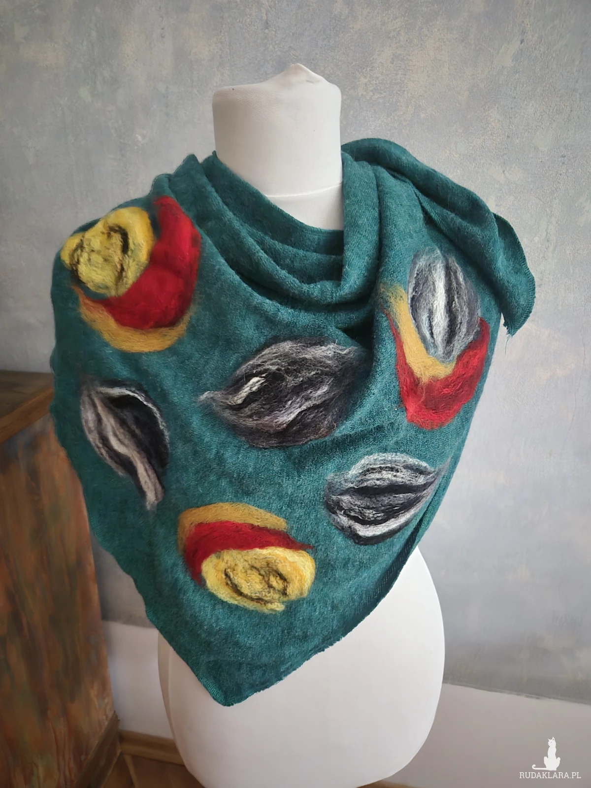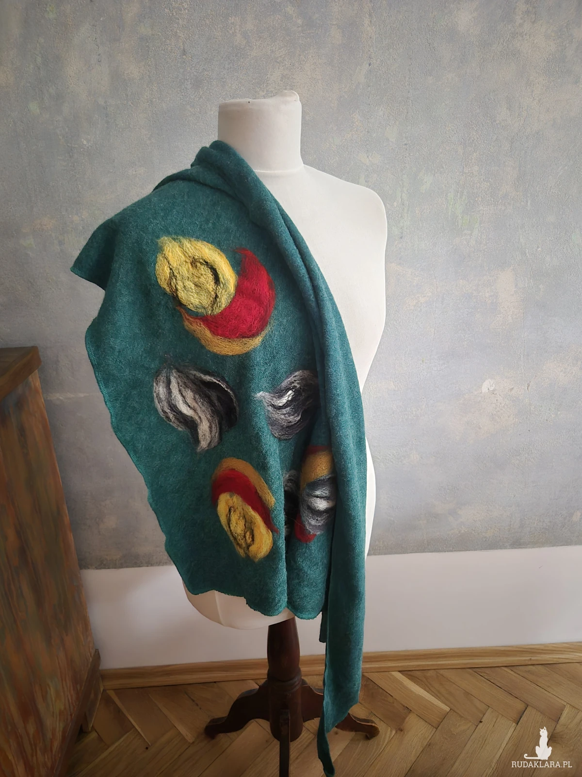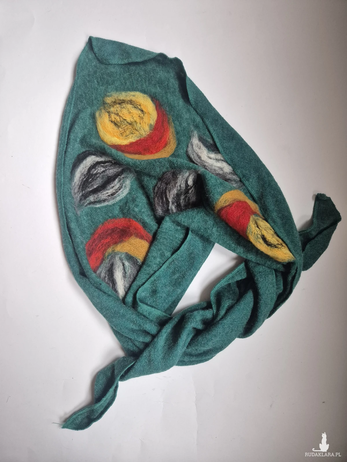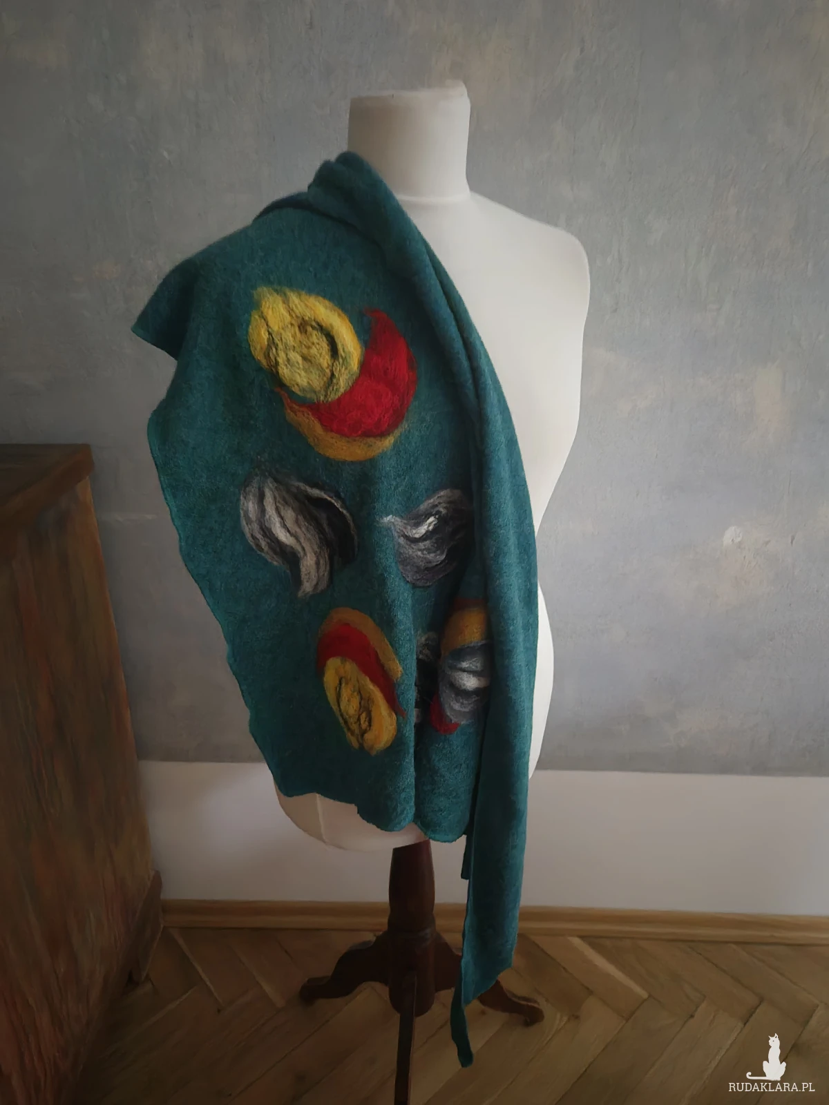 Turkus chusta handmade wełniana, elementy filcowane to wełna merynosów, produkt wysokiej jakości, chusta miła i ciepła, doskonała na chłodne dni, idealna na prezent, wspaniała na codzienne noszenie, zwraca uwagę swą oryginalnością, miękko układa się wokół szyi, absolutny bestseller polecam czas oczekiwania tydzien box a1