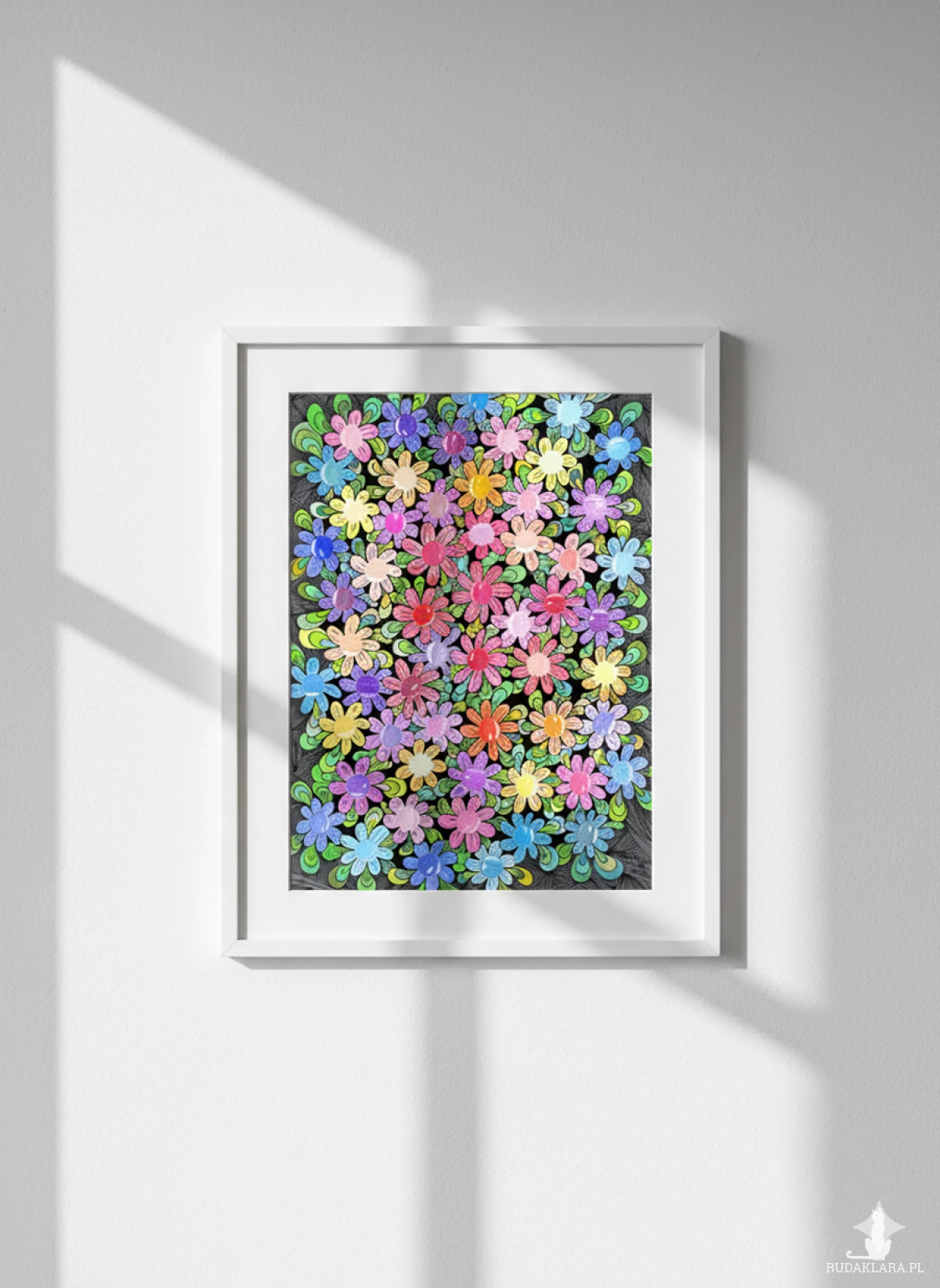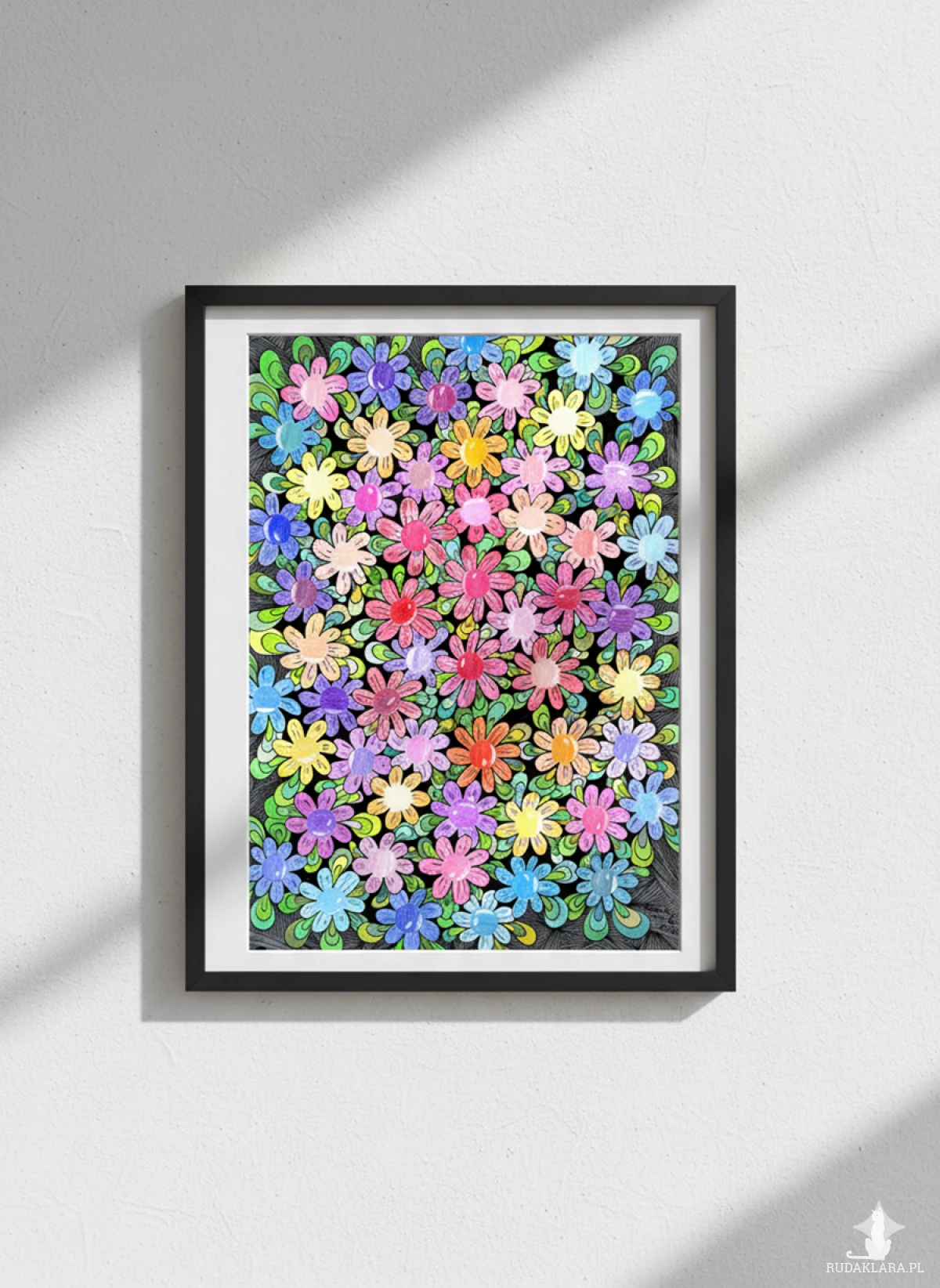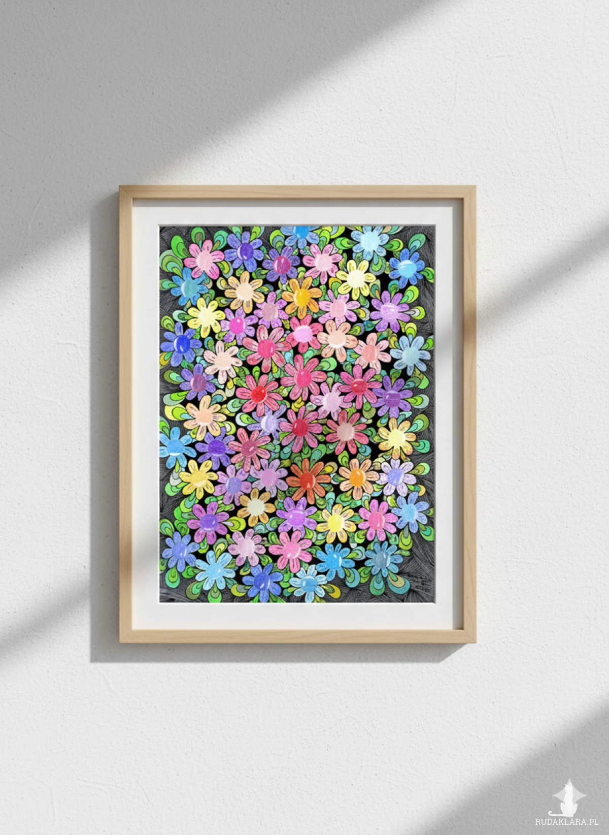 Intensywna, dekoracyjna ilustracja przedstawiająca gęsty, niekończący się dywan stylizowanych kwiatów w pełnym rozkwicie. Kompozycja charakteryzuje się paletą soczystych, cukierkowych kolorów (róże, błękity, fiolety, żółcie), które kontrastują z mrocznym, chaotycznym tłem z gęstych, czarnych linii. Kwiaty mają uproszczoną formę, ale są nasycone jasnymi akcentami, tworząc wrażenie wibrującej, niemal psychodelicznej obfitości.