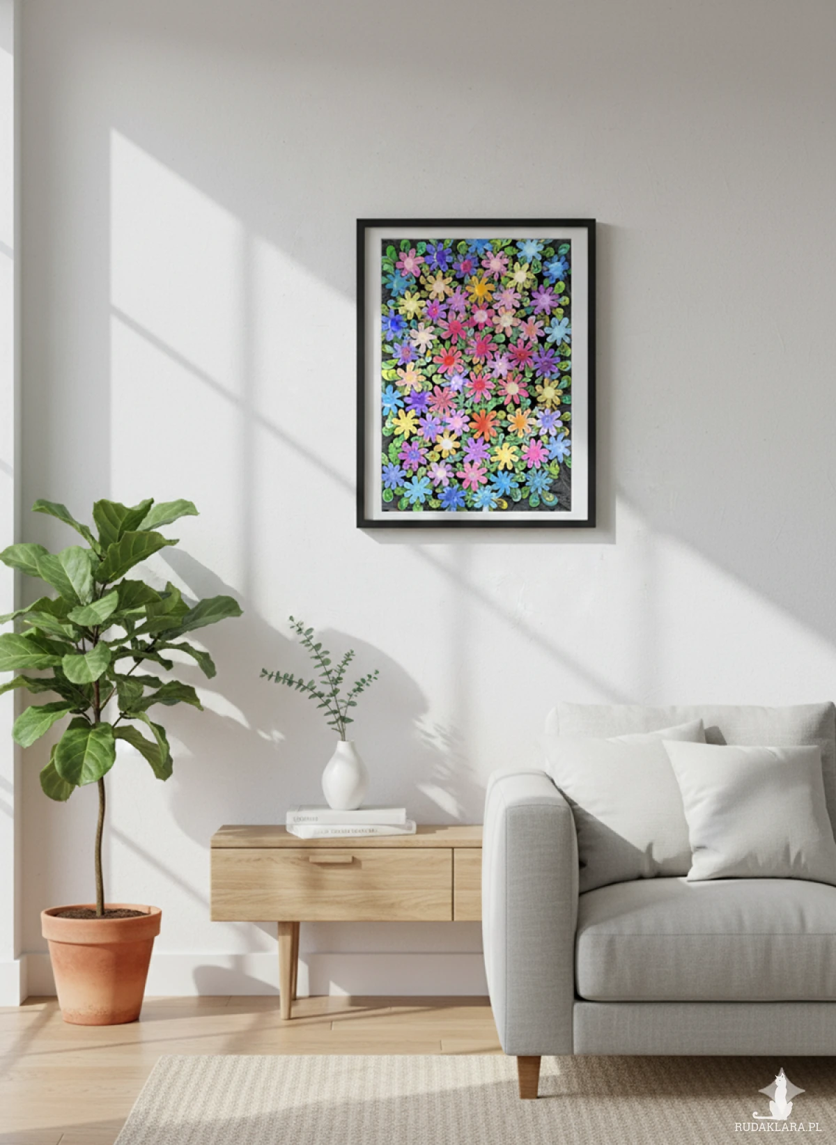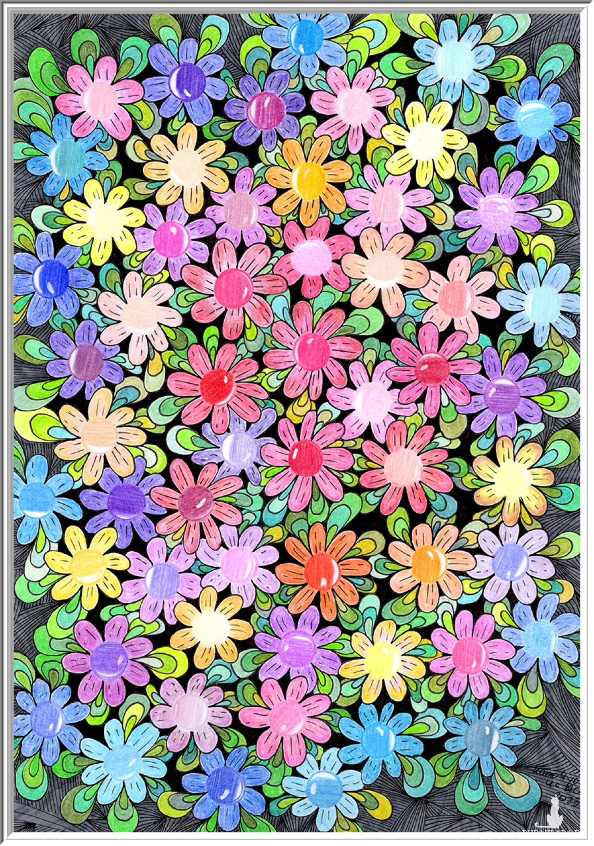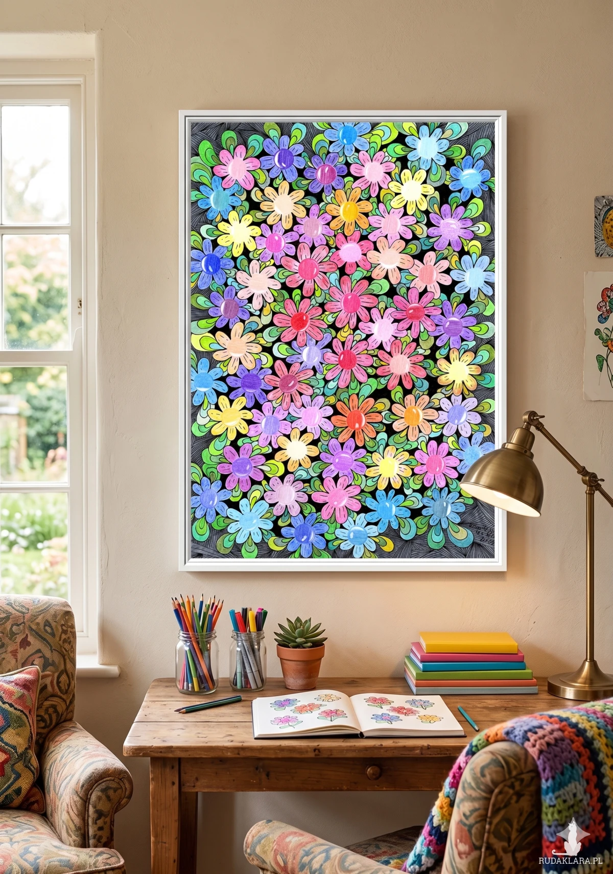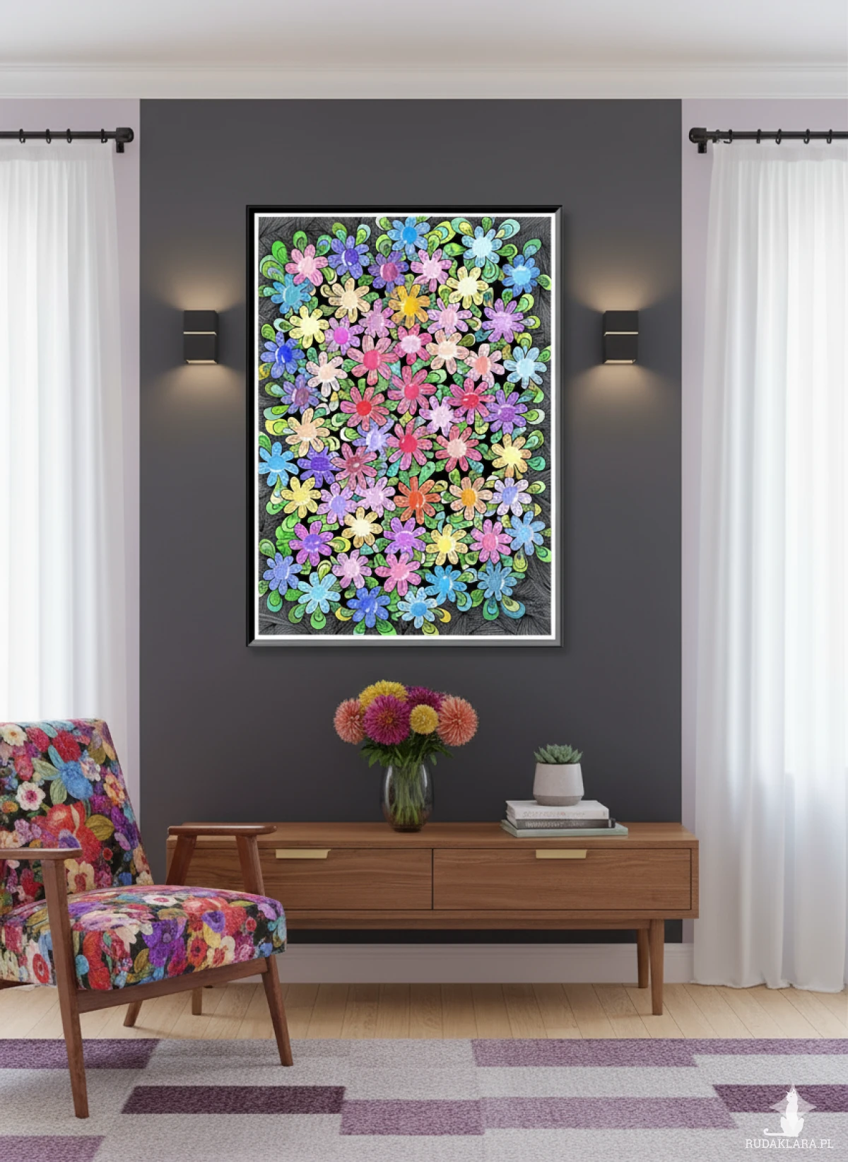 Intensywna, dekoracyjna ilustracja przedstawiająca gęsty, niekończący się dywan stylizowanych kwiatów w pełnym rozkwicie. Kompozycja charakteryzuje się paletą soczystych, cukierkowych kolorów (róże, błękity, fiolety, żółcie), które kontrastują z mrocznym, chaotycznym tłem z gęstych, czarnych linii. Kwiaty mają uproszczoną formę, ale są nasycone jasnymi akcentami, tworząc wrażenie wibrującej, niemal psychodelicznej obfitości.
