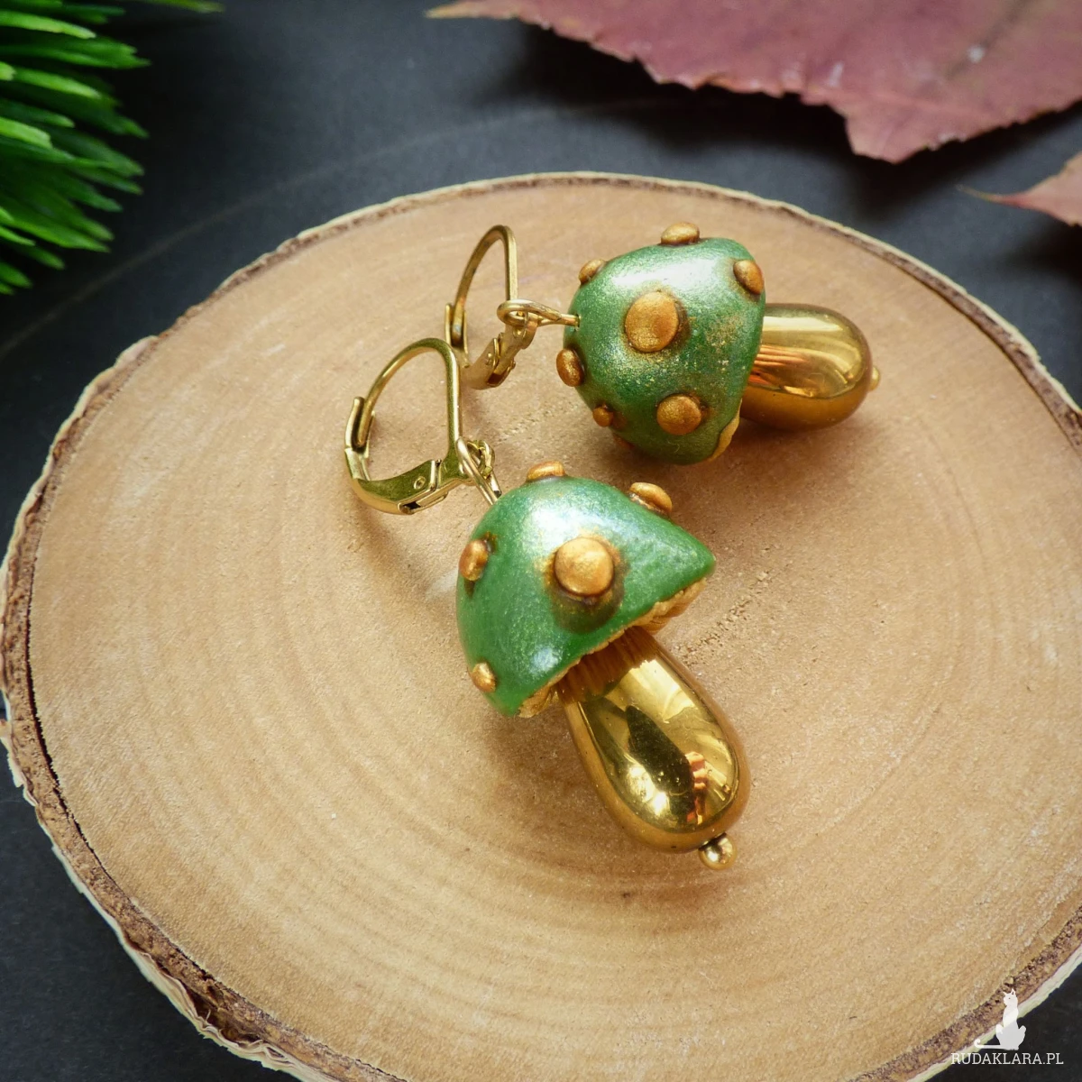 Ręcznie rzeźbione i modelowane kolczyki z glinki polimerowej w kształcie małych grzybków. Kapelusze w kolorze leśnej zieleni zdobią wypukłe złote kropeczki, a „nóżka” to szklana kropla w kolorze złotym, która ładnie odbija światło. Lekkie, wygodne i bardzo efektowne – idealne na prezent dla miłośniczek lasu i starych baśni, a także wyjątkowej biżuterii.