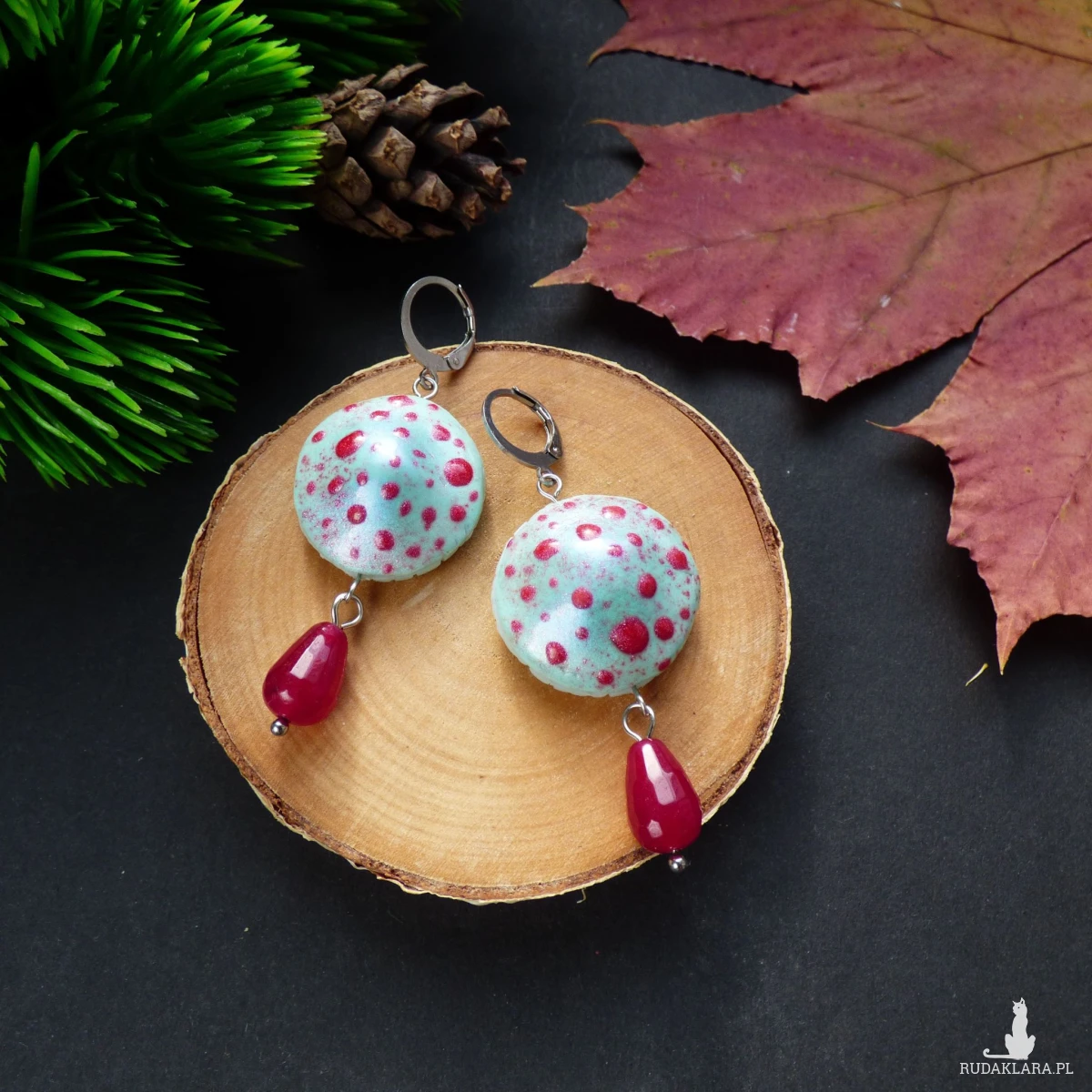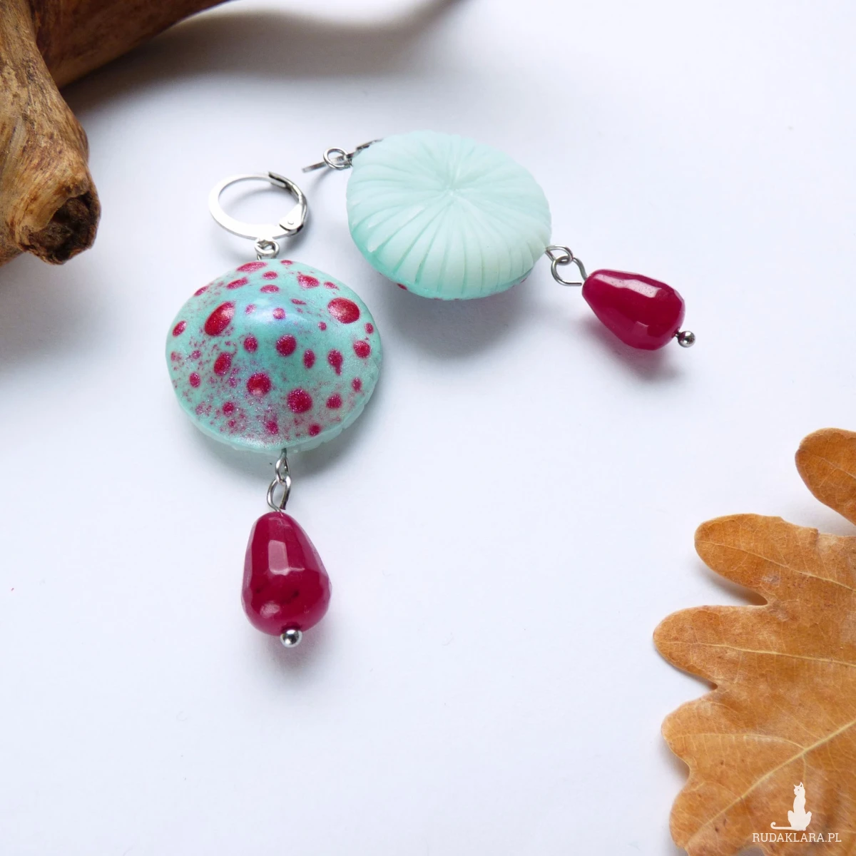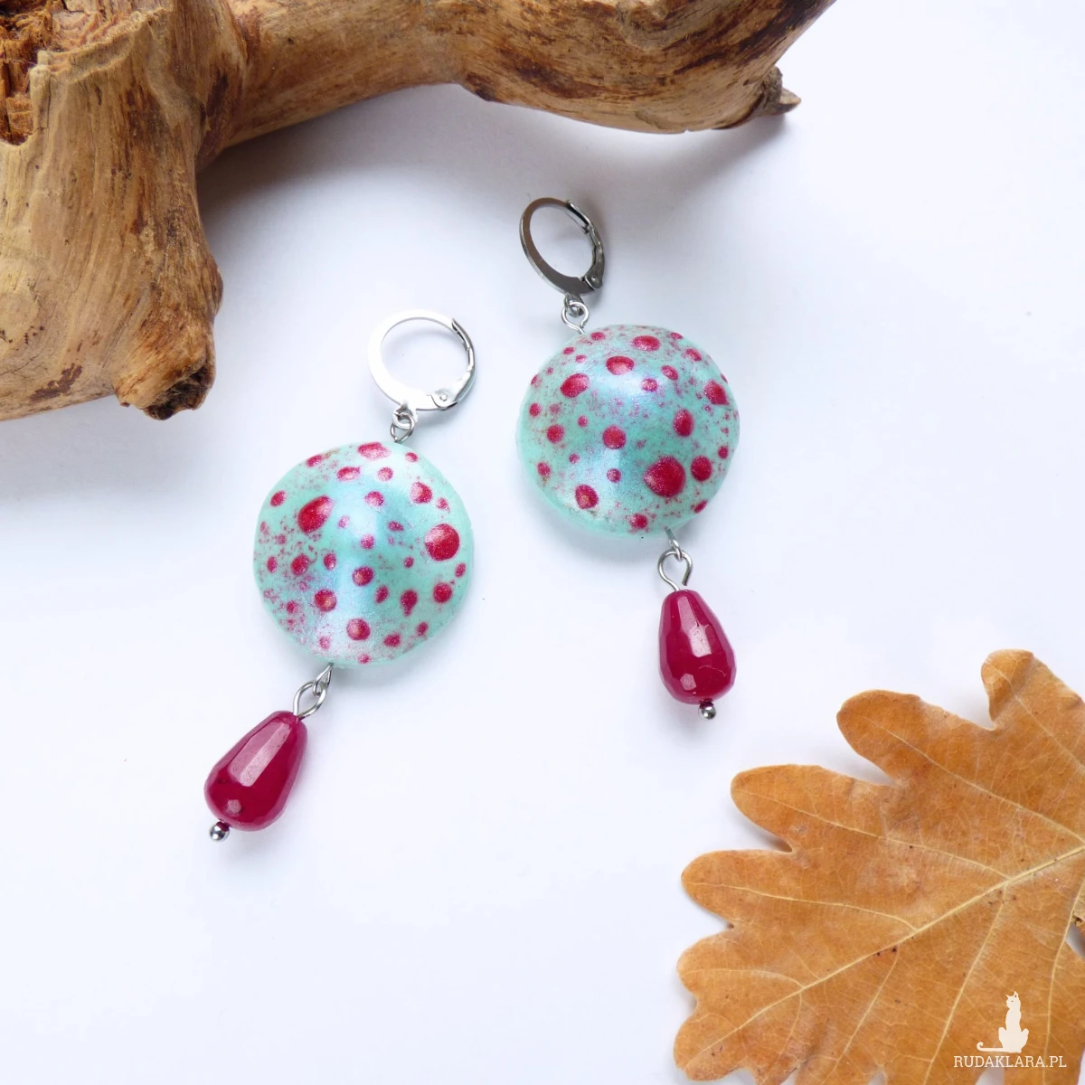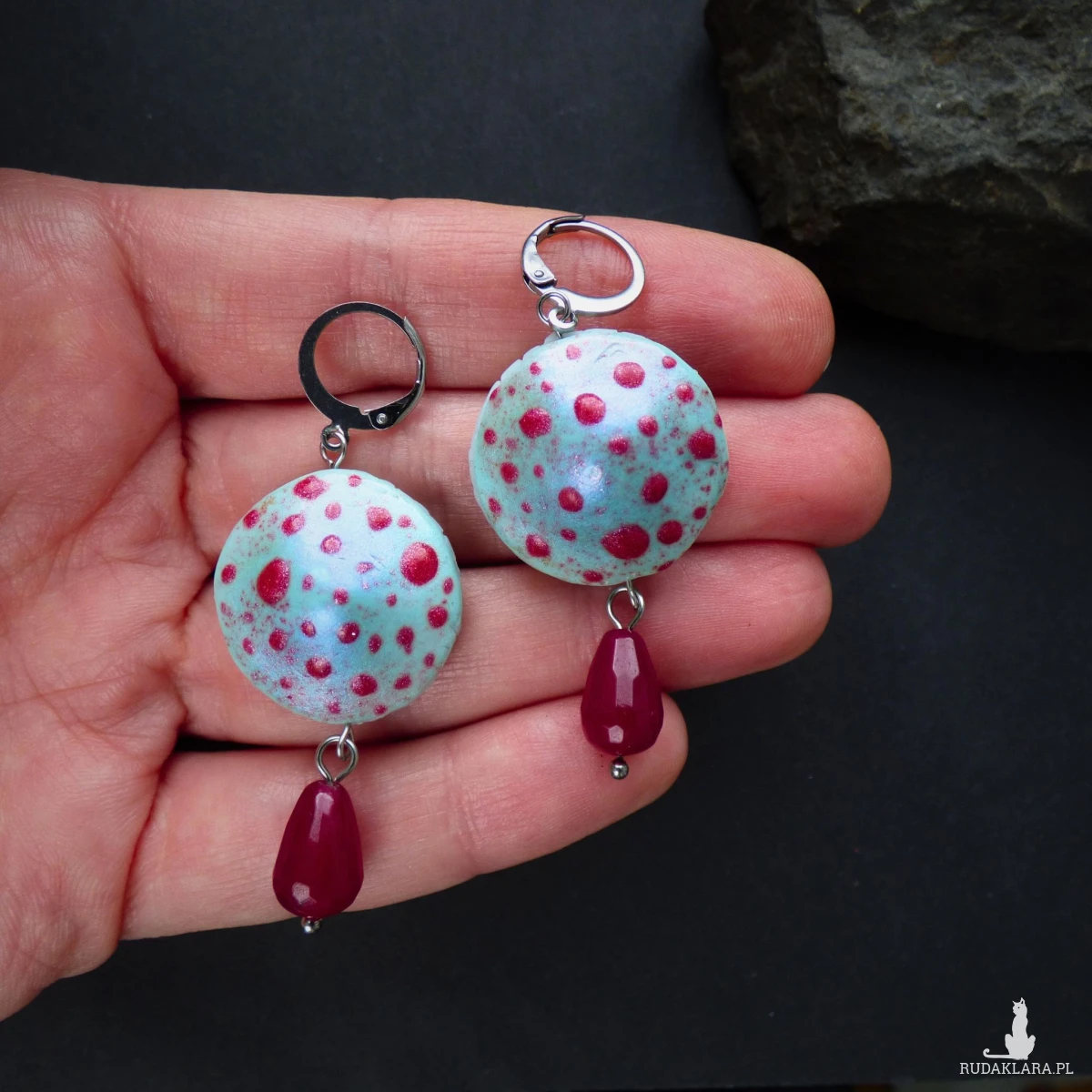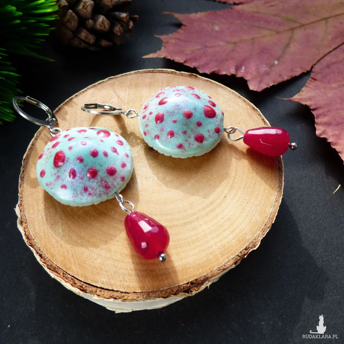 Ręcznie rzeźbione i modelowane kolczyki z glinki polimerowej w formie wypukłych „kapeluszy” grzybków. Miętowa baza z niebieskim perłowym połyskiem ozdobiona jest czerwonymi delikatnie mieniącymi się kropeczkami. Od spodu wyrzeźbiłam delikatne „blaszki” w kolorze transparentnym miętowym. Całość dopełnia fasetowana kropla z malinowego jadeitu, która dodaje lekkości i pięknie pracuje w ruchu. Lekkie, przyciągające wzrok i delikatnie mieniące się kolczyki.