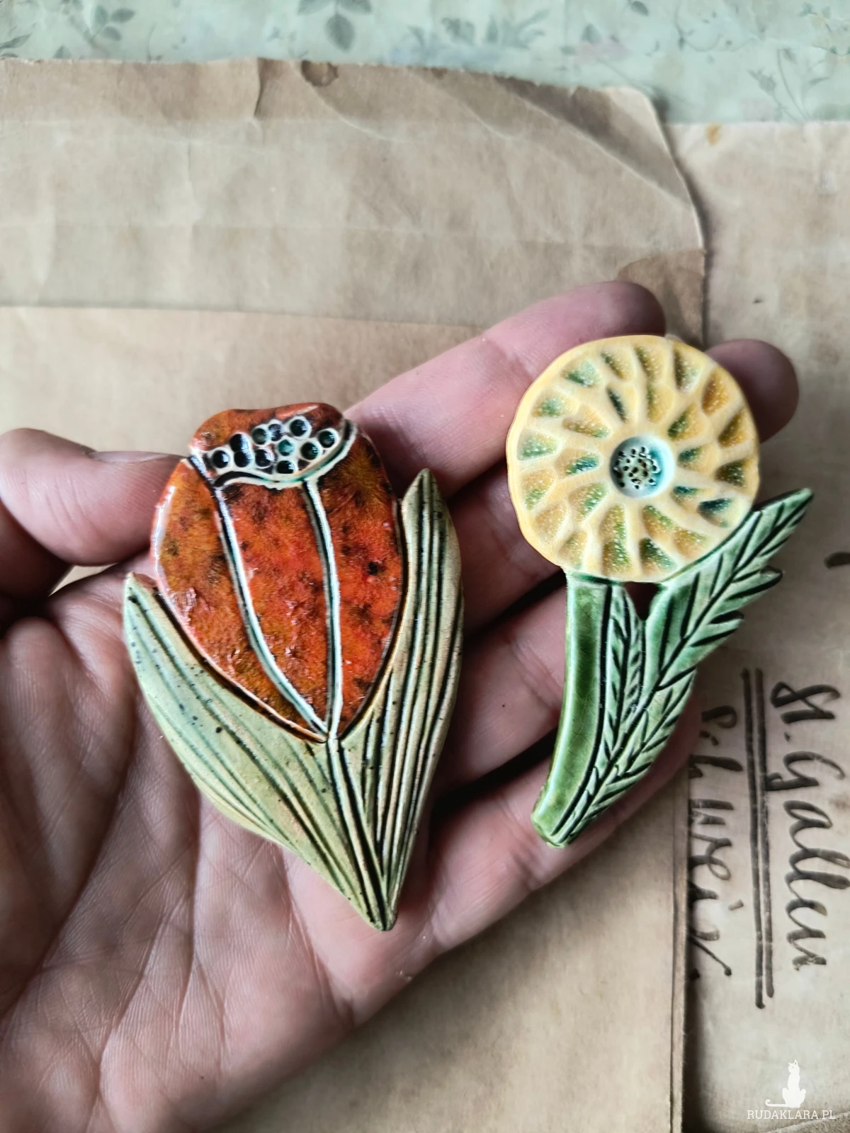 Broszki ceramiczne w postaci kwiatów o wymiarach ok 5 cm x 6,5 cm, wykonane z gliny szamotowej wypalona na biskwit, a następnie szkliwiona w temp ok 1260 stopni C. polecam serdecznie.