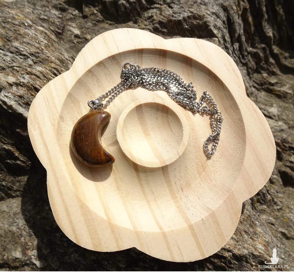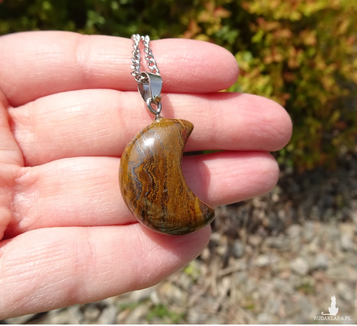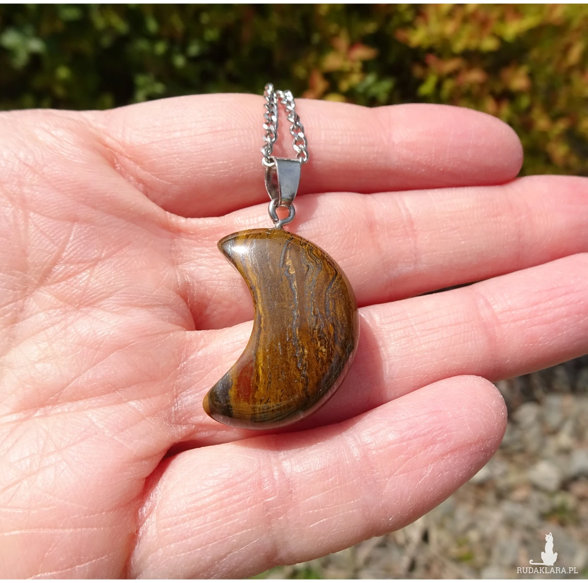 Wisiorek z łańcuszka ze stali szlachetnej i zawieszki w kształcie księżyca z tygrysiego żelaza o całkowitej długości ok. 3,2cm.