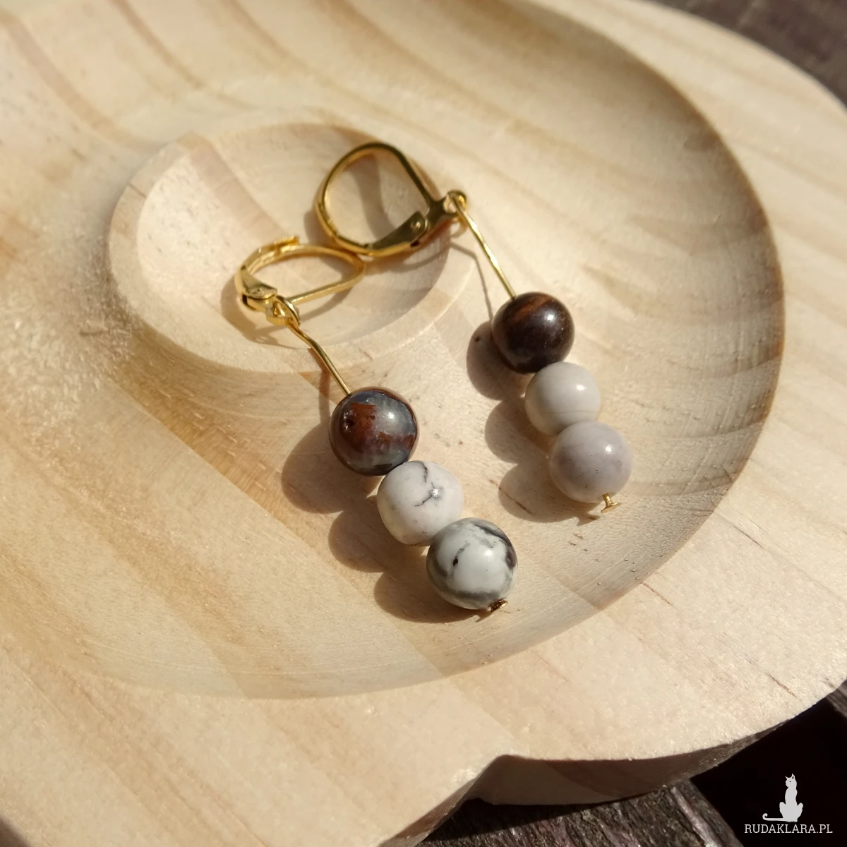 Kolczyki na stalowych biglach angielskich w kolorze złotym z jaspisu Picasso i opalu Boulder 6mm. Długość całkowita ok. 4,5cm. Na zdjęciach sprzedawana para.