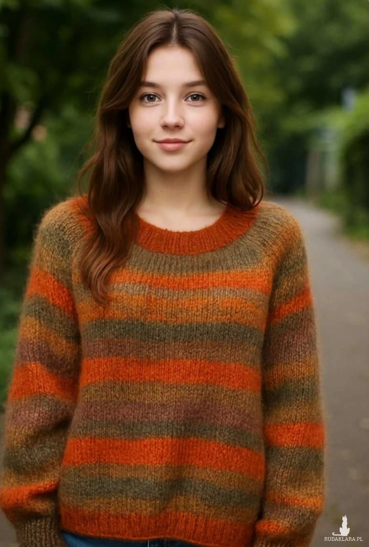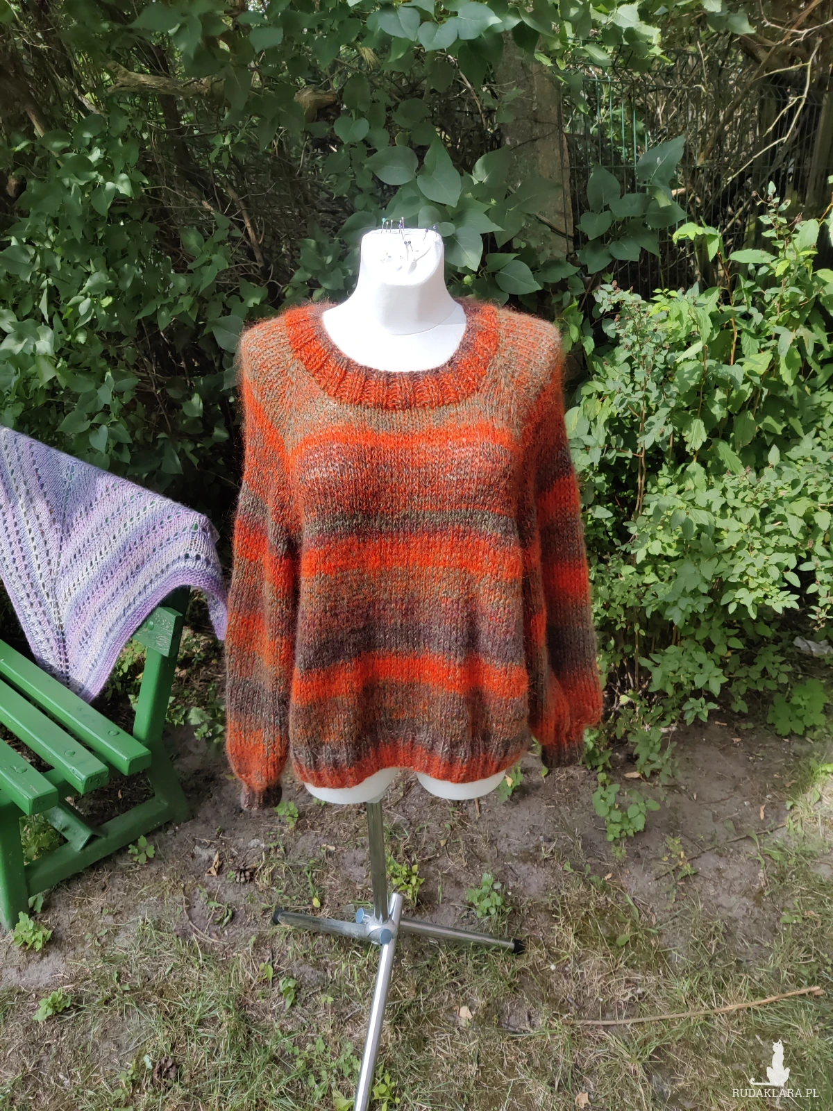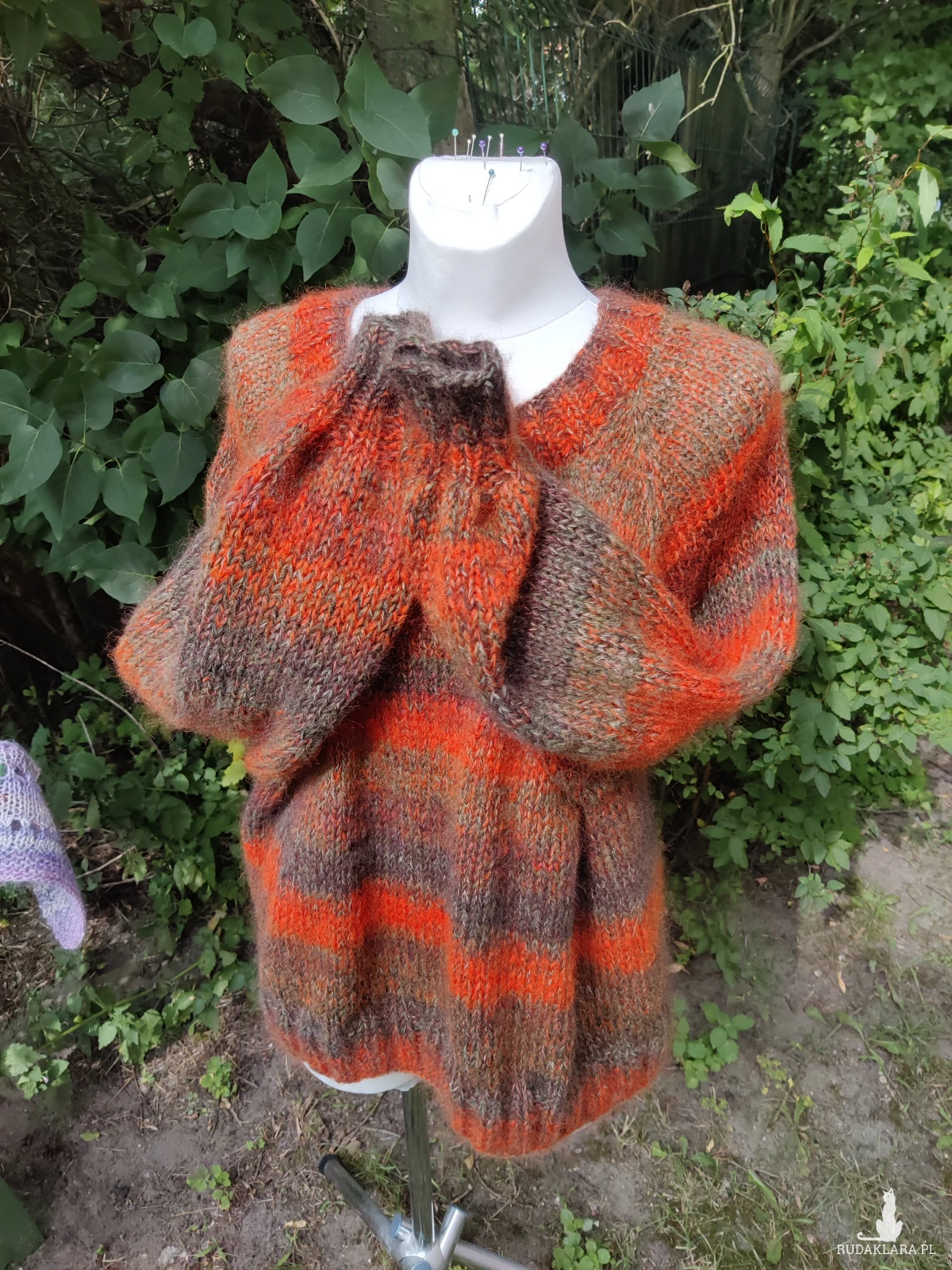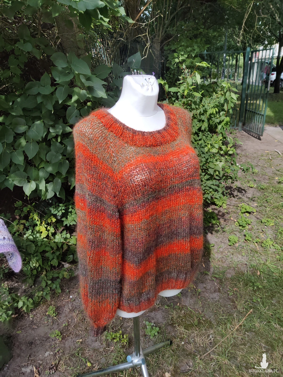 kolory oliwki i pomarańczy intuicyjnie zmieniane nitki wełny w tym swetrze dają niebywały efekt który trudno oddać poprzez fotografie