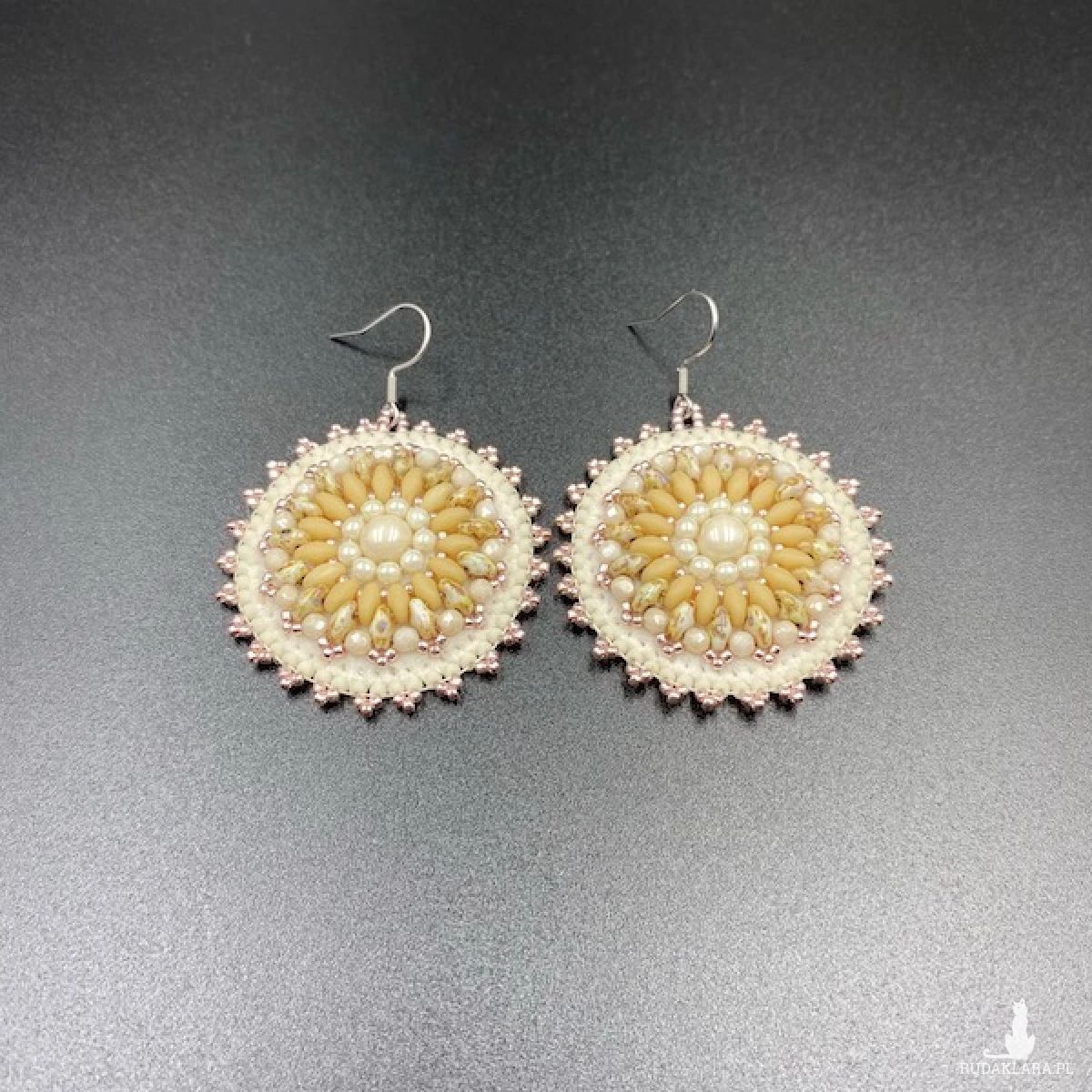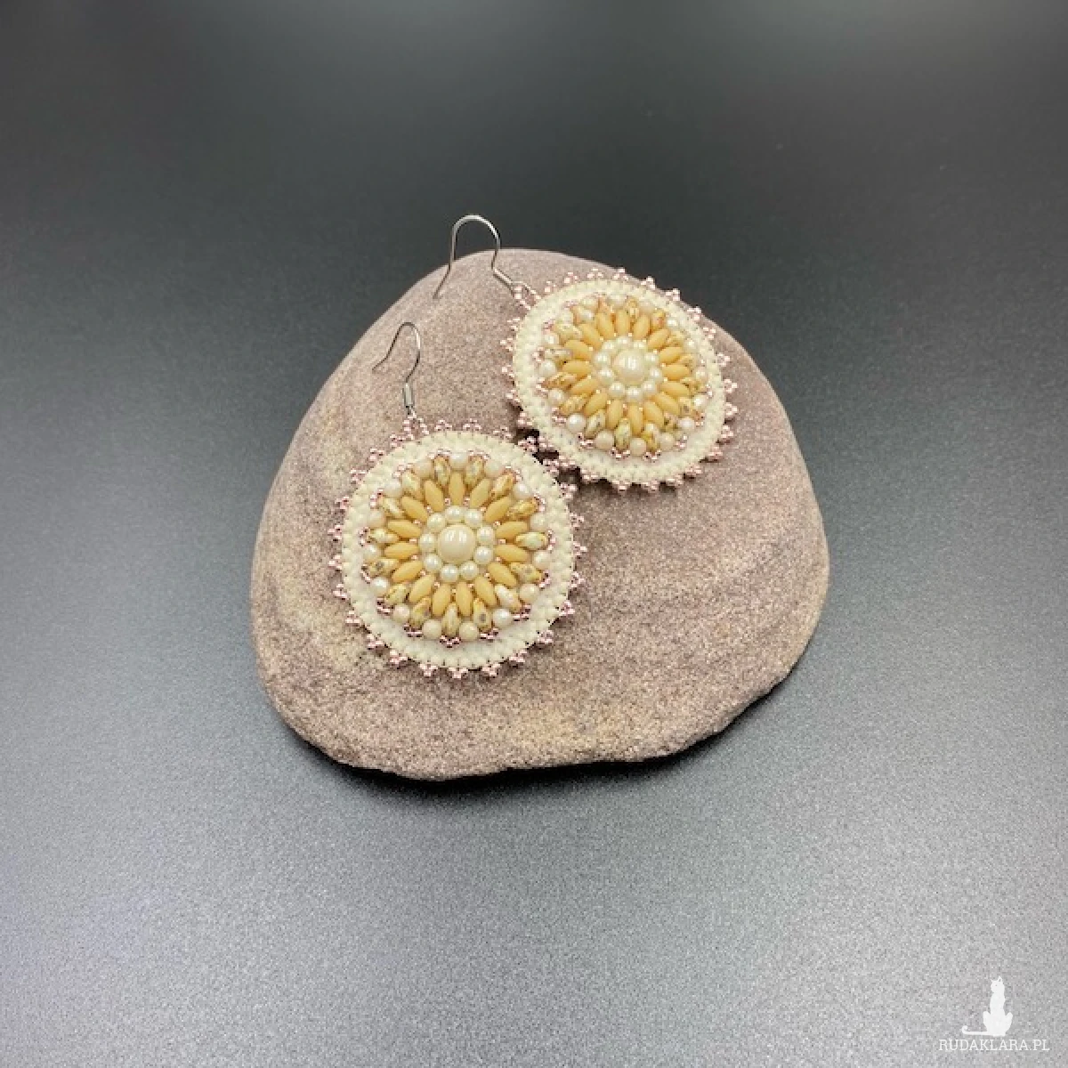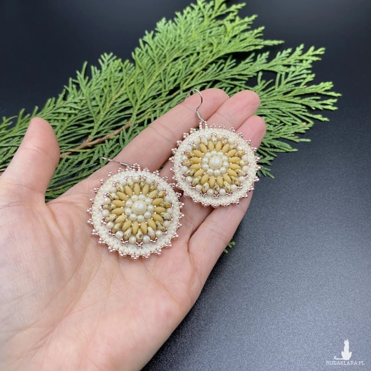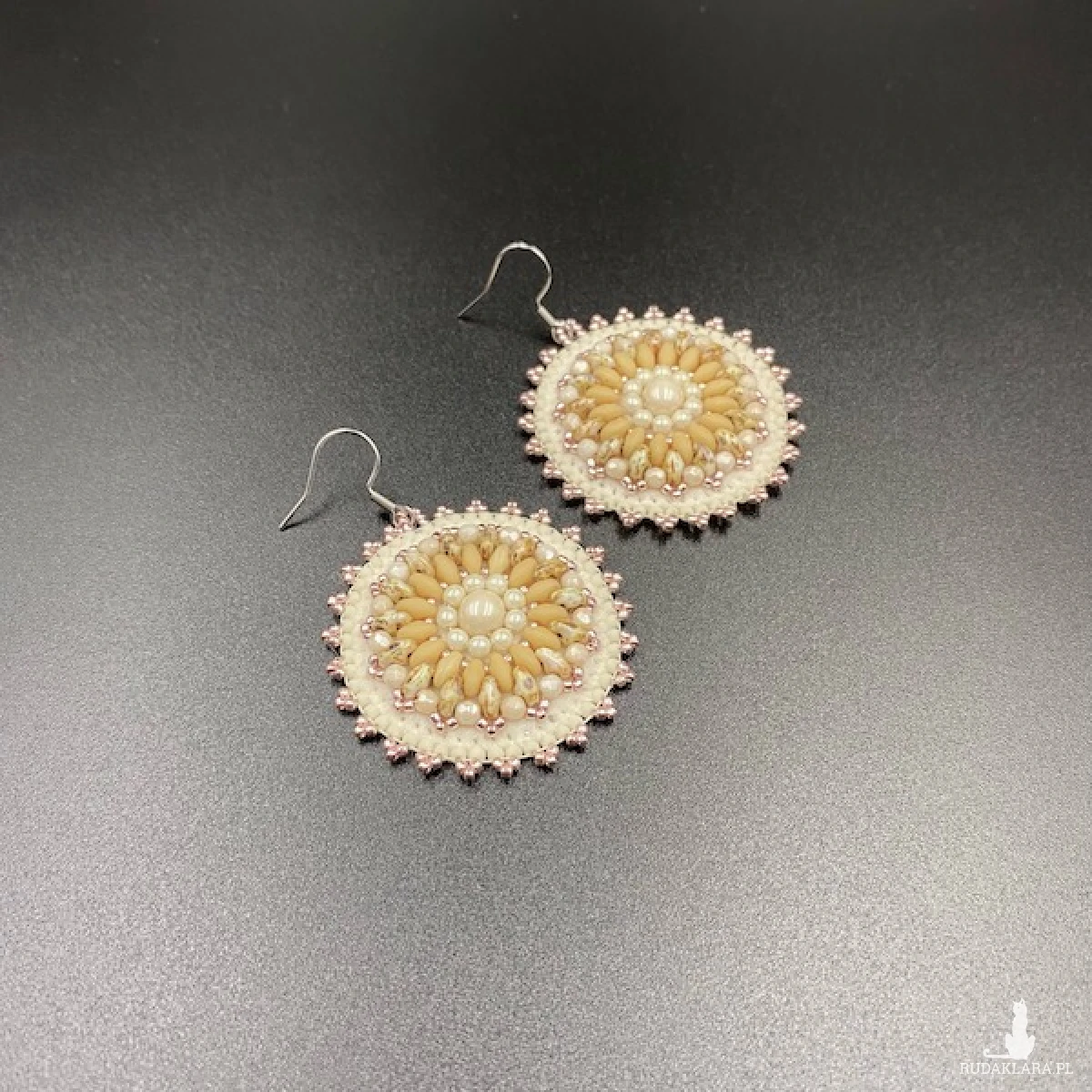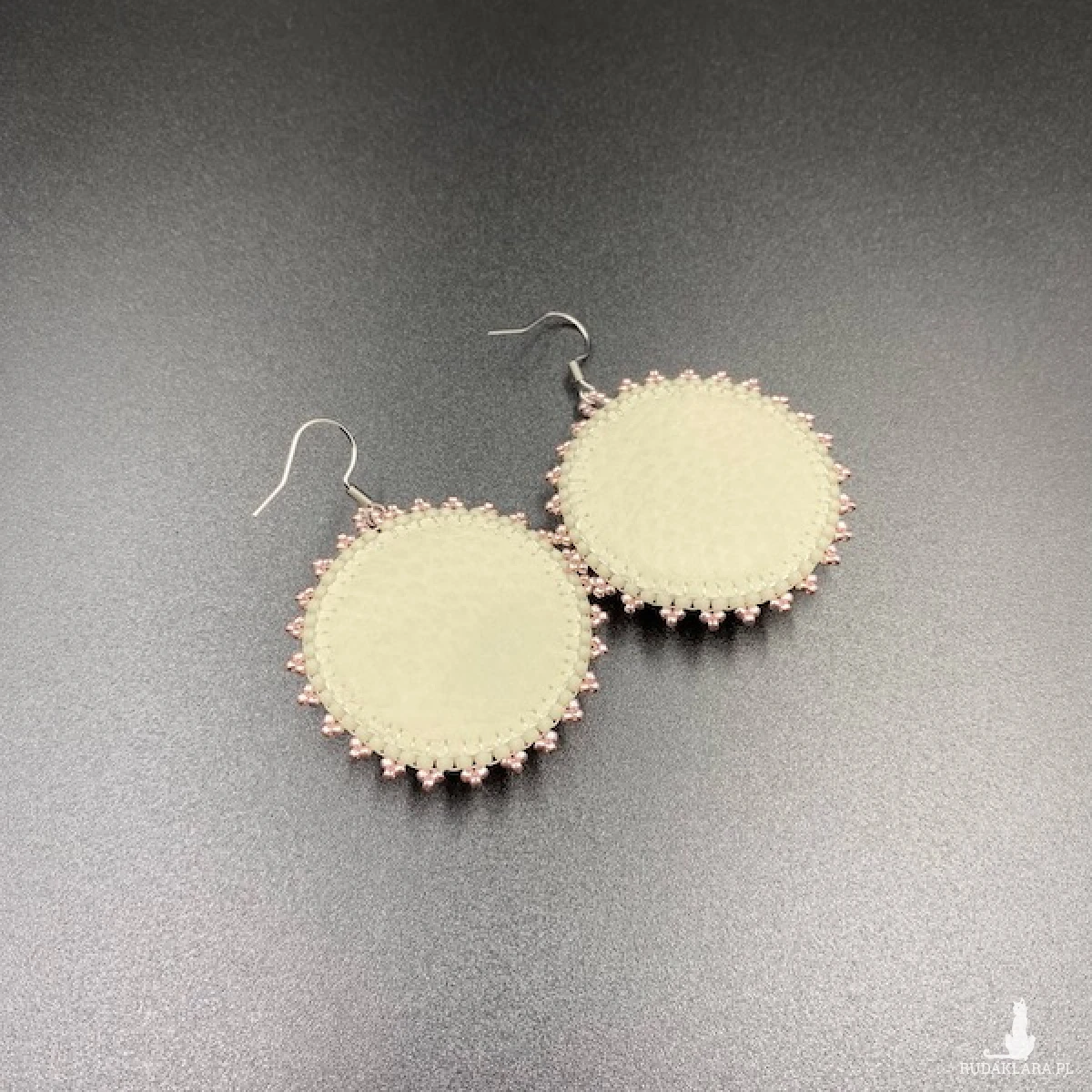 Okrągłe kolczyki wykonane zostały techniką haftu koralikowego z drobnych koralików Toho, Fire Polish i SuperDuo w 100% wyszyte ręcznie. Spód kolczyków podszyty jest jasno beżową eko skórką. Bigle otwarte ze stali chirurgicznej.