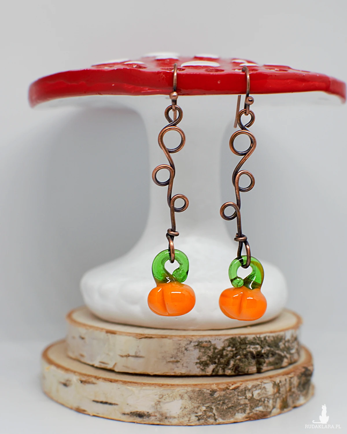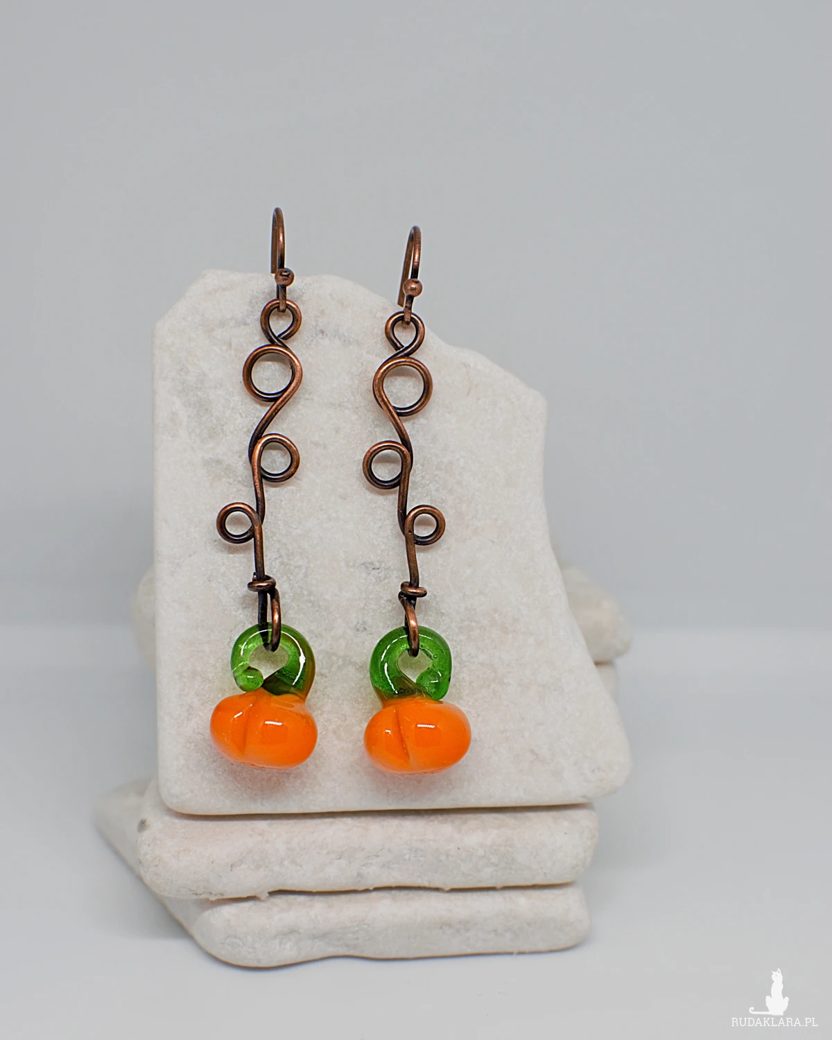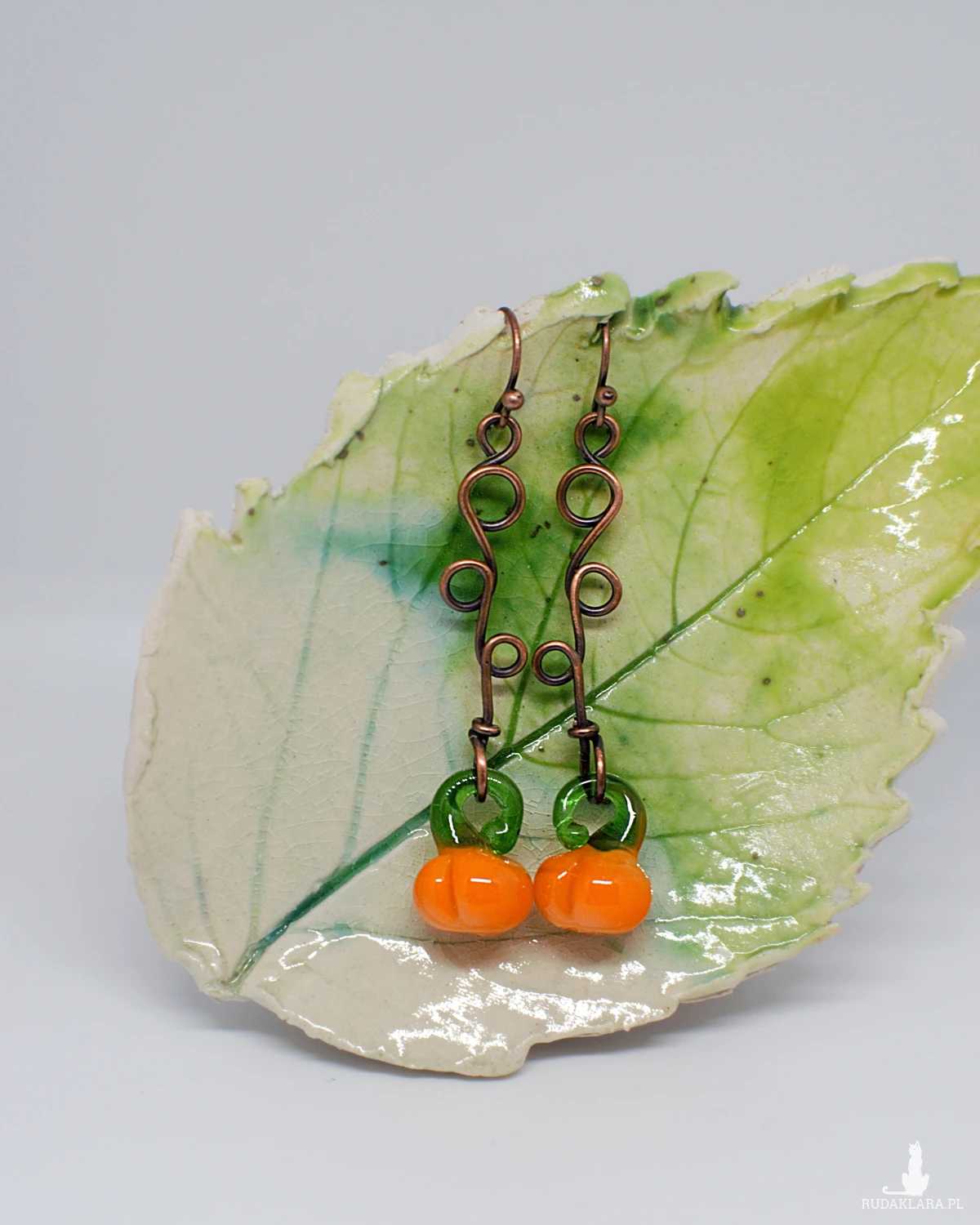 Przepiękne kolczyki ręcznie wykonane z użyciem naturalnej miedzi i szklanych zawieszek w kształcie dyni.