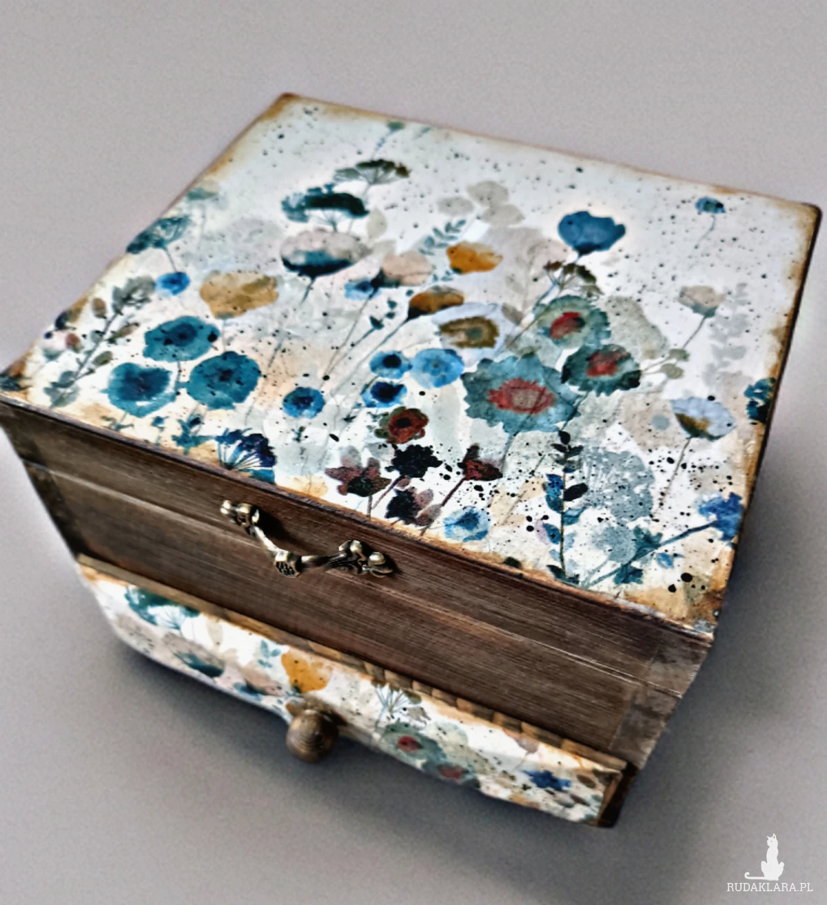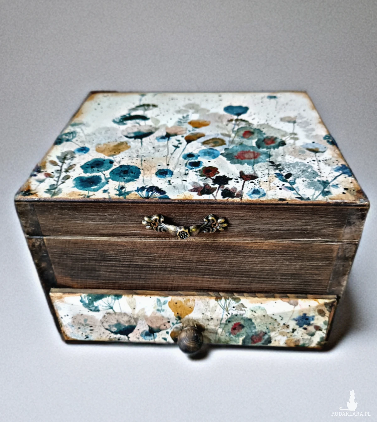 Drewniana skrzyneczka na biżuterię, z przegródkami, dodatkową szufladką i lusterkiem.