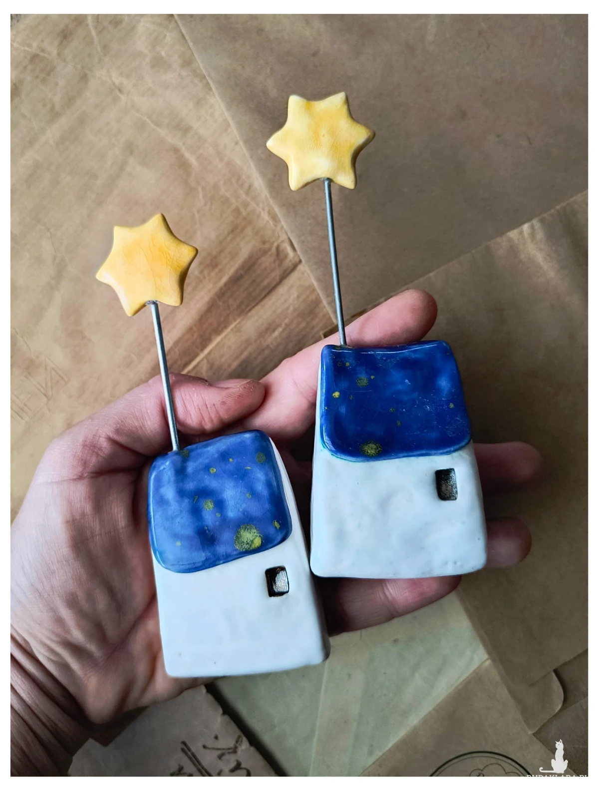 Domek z wiejskiej zagrody wykonany z gliny szamotowej wypalonych na biskwit, a następnie szkliwionych w temperaturze ok 1260 stopni C. Wymiary: 4,5 cm x 6 cm x 13 cm. Serdecznie polecam.