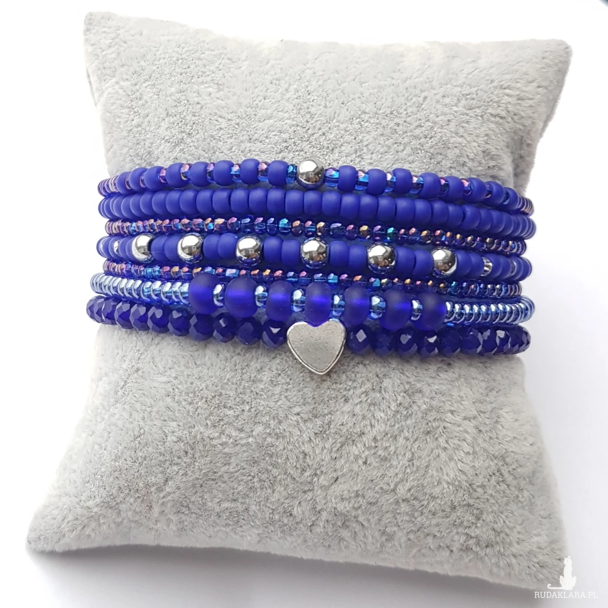 Zestaw siedmiu bransoletek z granatowych koralików z przekładkami z hematytu w kolorze srebrnym. Każdą bransoletkę można nosić oddzielnie lub komponować dowolnie z innymi bransoletkami. Bransoletki zrobione na sznurku jubilerskim, a zapięcie wyplecione ściegiem makramowym co pozwala na regulację objętości, przechodzi przed dłoń 20 cm, a zmniejszyć można do 12 cm objętości nadgarstka