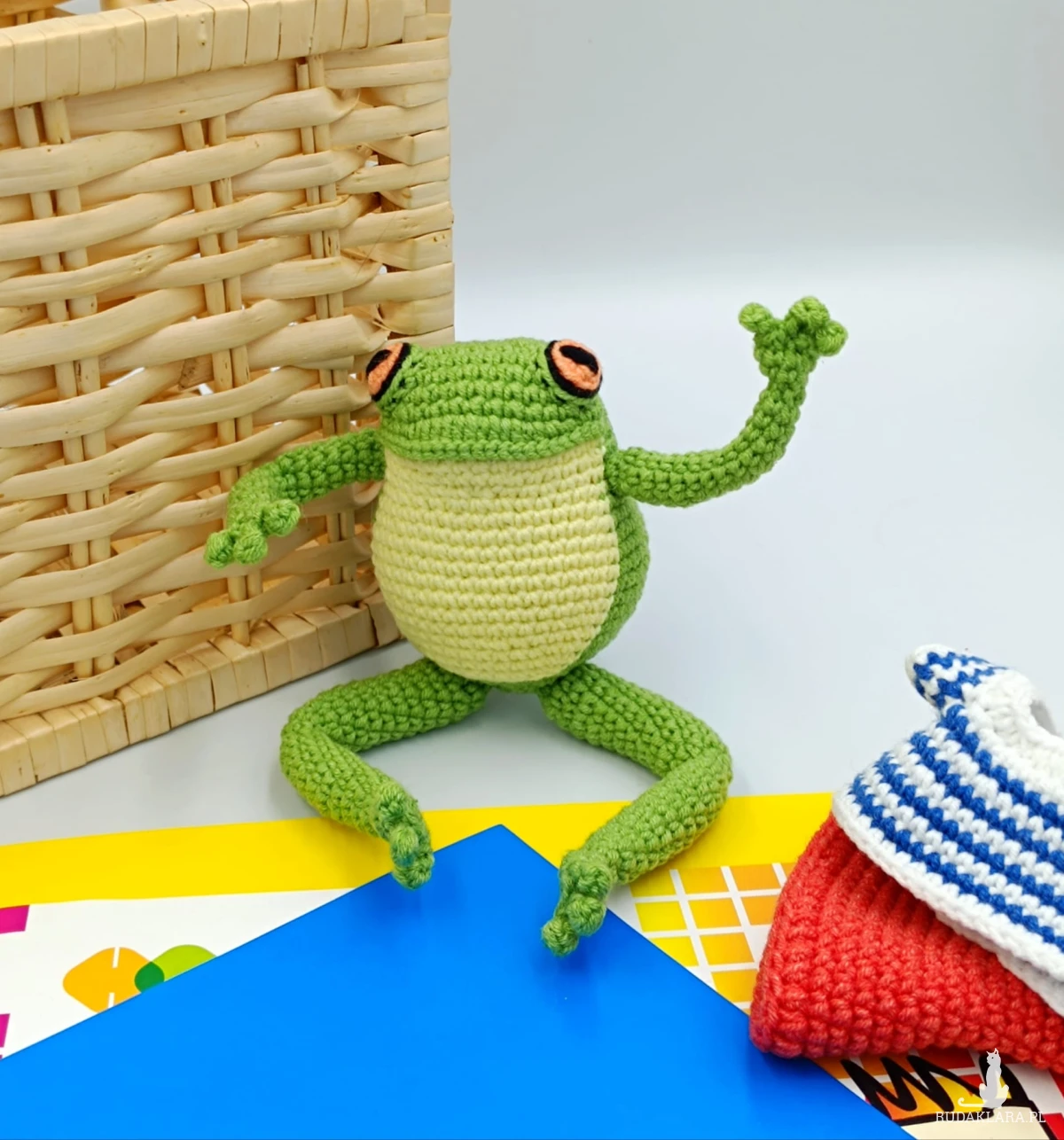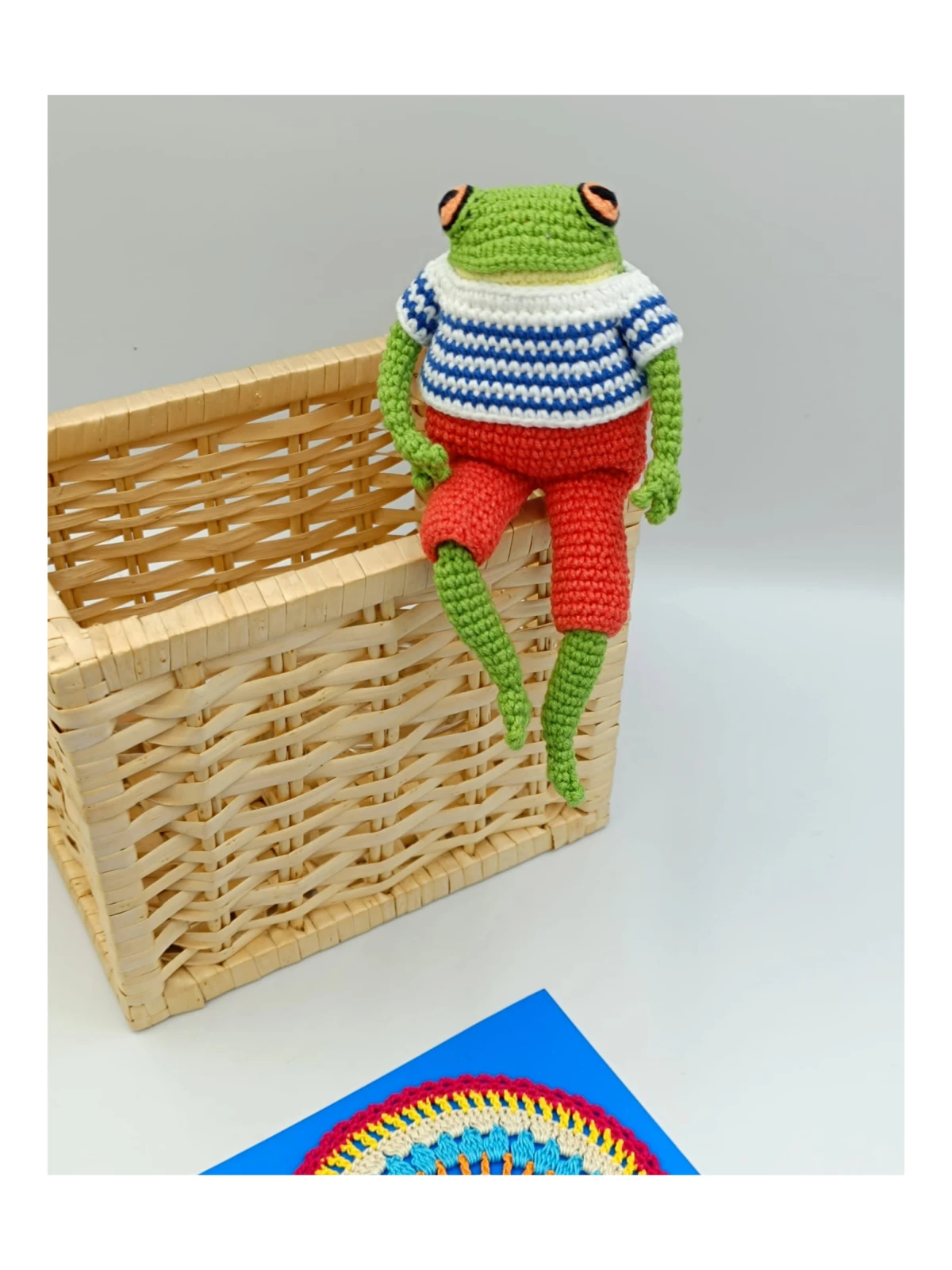 Żabka wykonana jest ręcznie szydełkiem. Bardzo równiutko, z dużą starannością, niezwykle precyzyjnie i z ogromną dbałością o każdy szczegół. Oczka są wyszyte ręcznie.