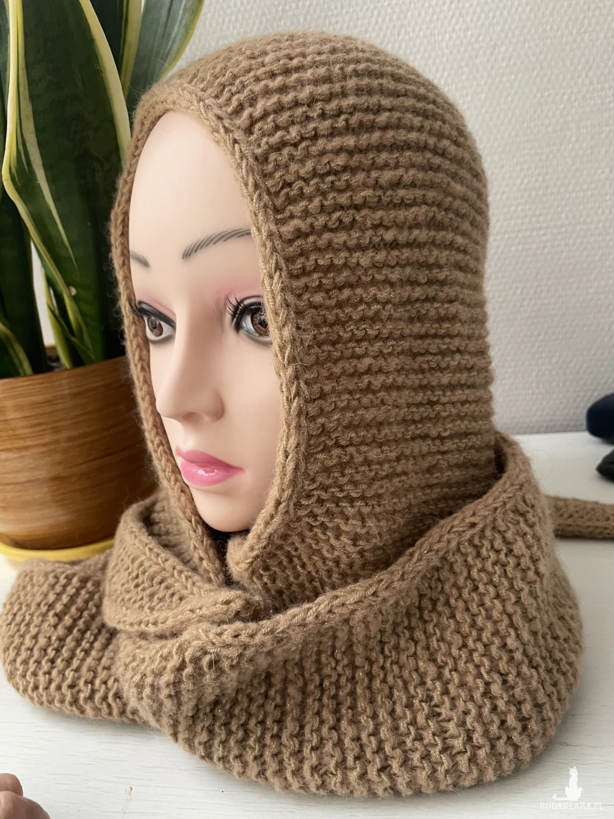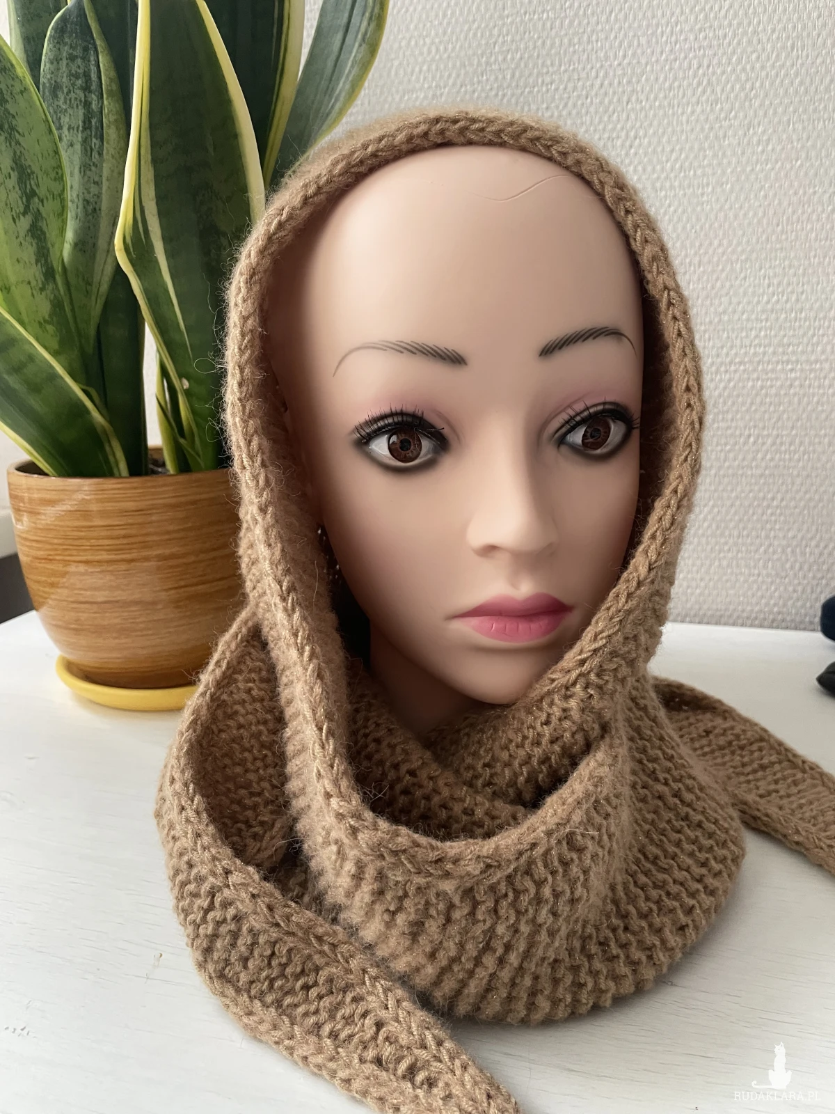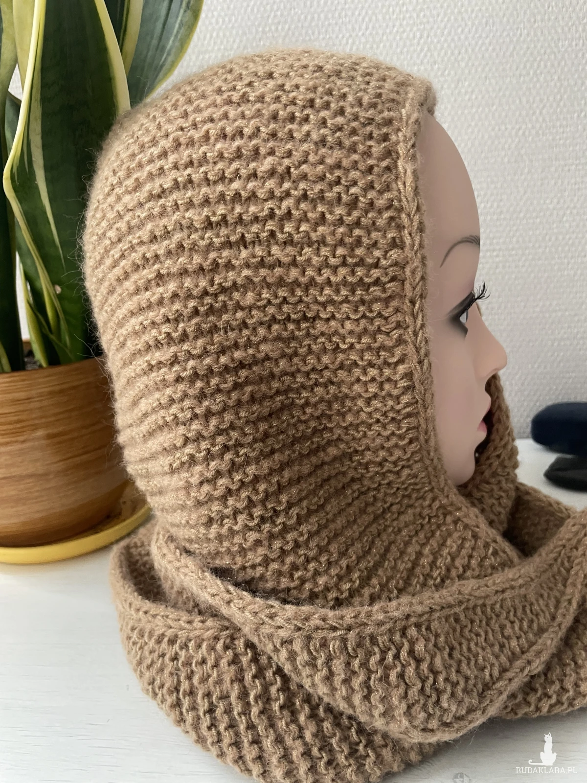 Nakrycie głowy w formie kaptura połączone z długim szalikiem. Wykonany na drutach z włóczki merino w połączeniu z alpaka z dodatkiem delikatnej złotej nitki. Jest możliwość wykonania w innym kolorze, propozycje kolorów na zdjęciu. Termin realizacji 7 dni.