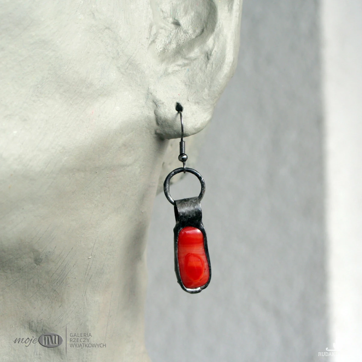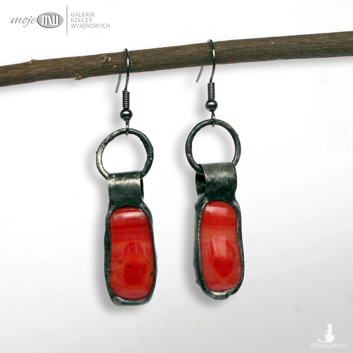 Kolczyki ze szklanego cynobrowo-czerwonego paluszka, wytopionego przeze mnie metodą fusingu w temperaturze min. 800 stopni. Całość oprawiona w miedź - cynowaną, patynowaną i przecieraną.