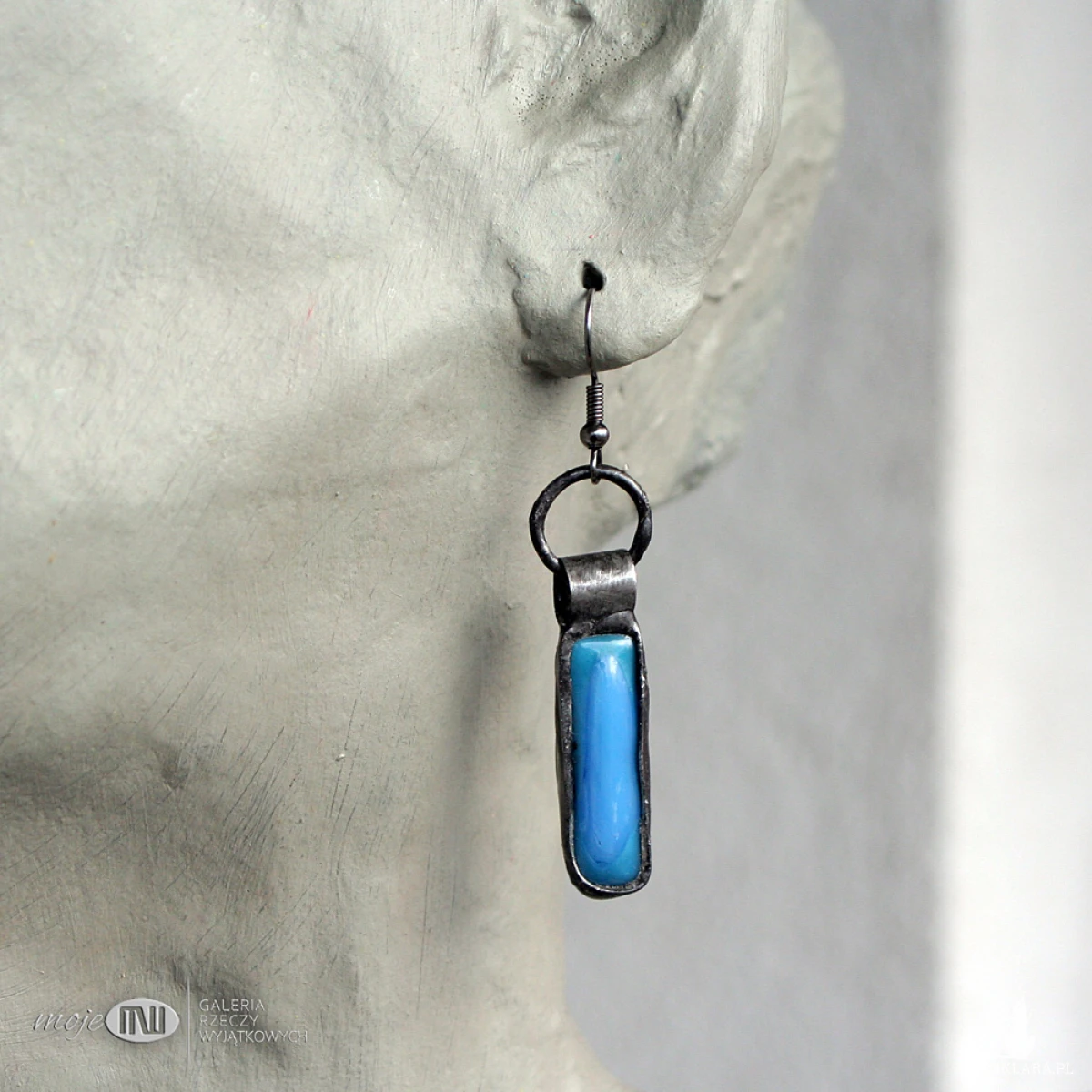 Kolczyki ze szklanego morsko-niebieskiego paluszka, wytopionego przeze mnie metodą fusingu w temperaturze min. 800 stopni. Całość oprawiona w miedź - cynowaną, patynowaną i przecieraną.