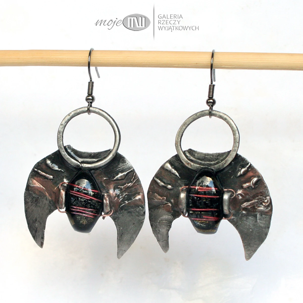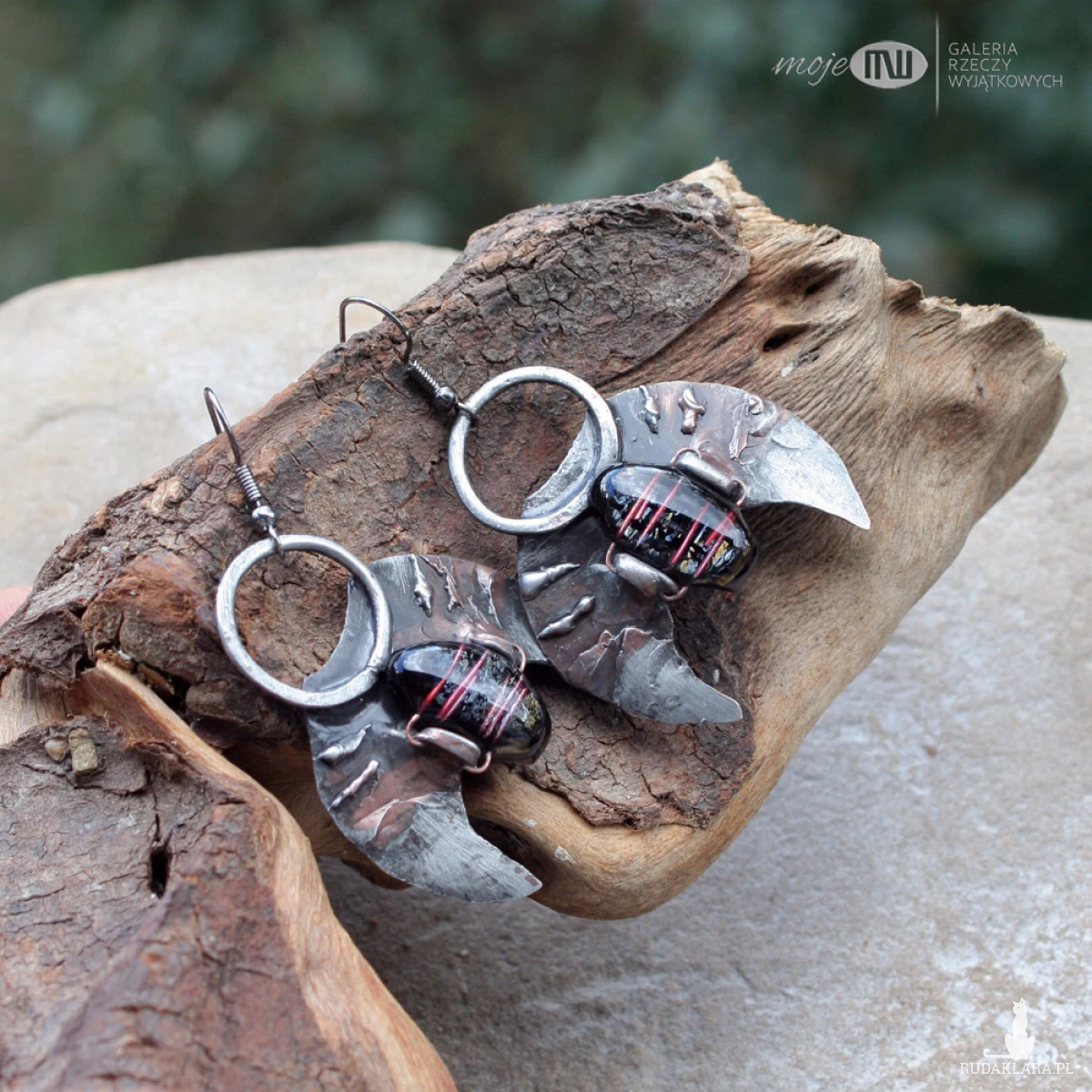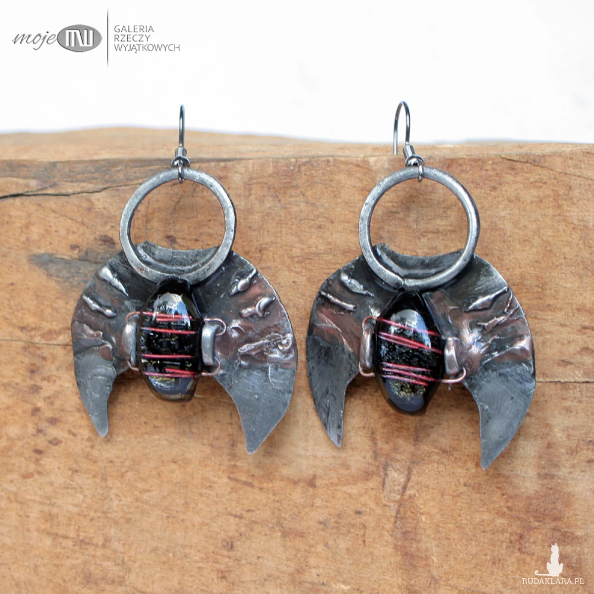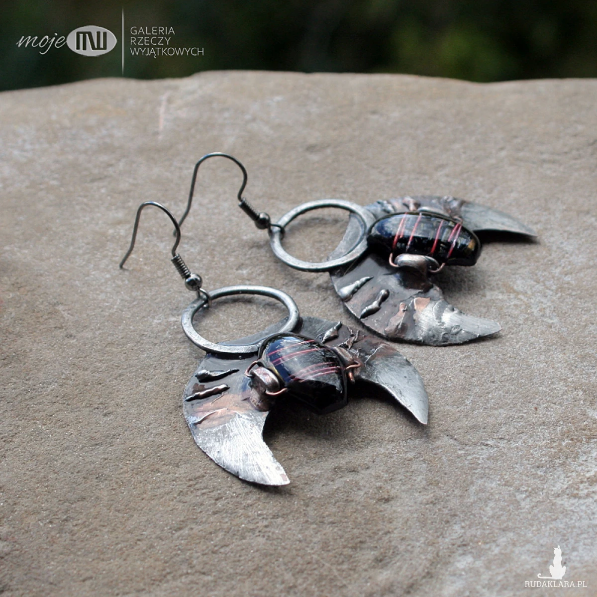 Księżycowe kolczyki z miedzi pokrytej cyną, patynowanej i przecieranej. Zdobią je kaboszony, które wytopiłam ze szkła dichroicznego, które delikatnie połyskuje wewnątrz. Zawieszone na metalowych biglach w kolorze grafitowym.