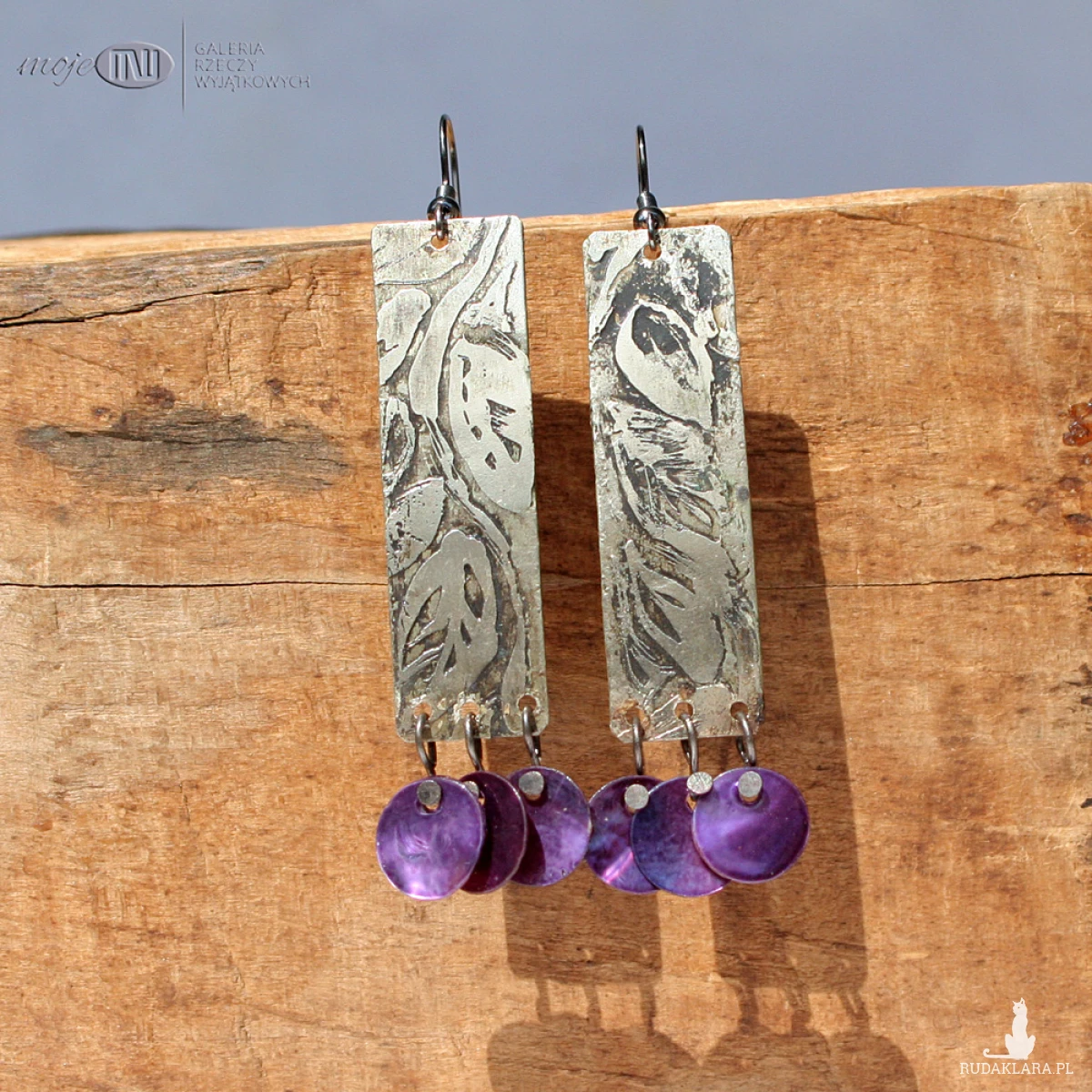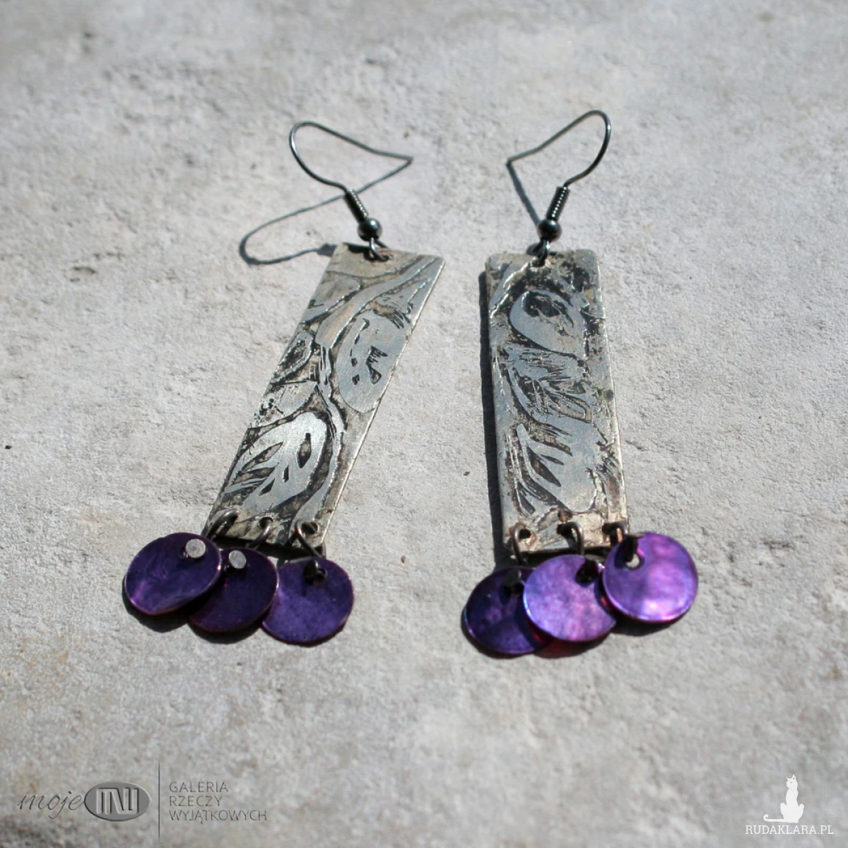 Długie kolczyki z prostokątnej blaszki z alpaki z wytrawionymi florystycznymi wzorami. Zdobią je plasterki fioletowej masy perłowej. Blaszka jest patynowana i częściowo polerowana dla wydobycia rysunku. Zawieszone są na metalowych biglach w kolorze grafitowym.