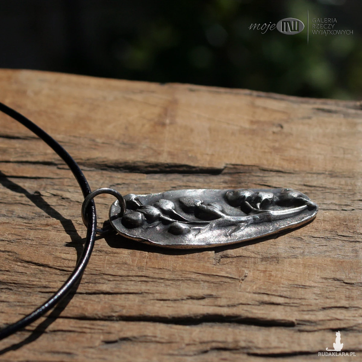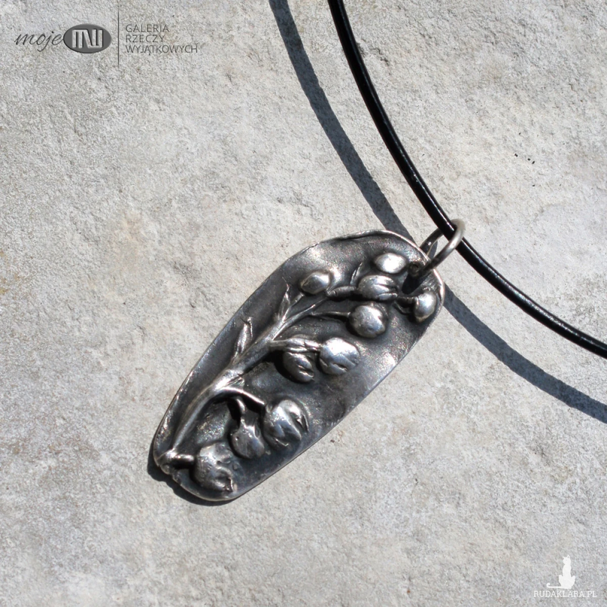 Wisior ze srebra wysokiej próby (nawet 999) z wizerunkiem wiosennych kwiatów konwalii. Srebro jest oksydowane i przetarte dla wydobycia rysunku, częściowo polerowane.