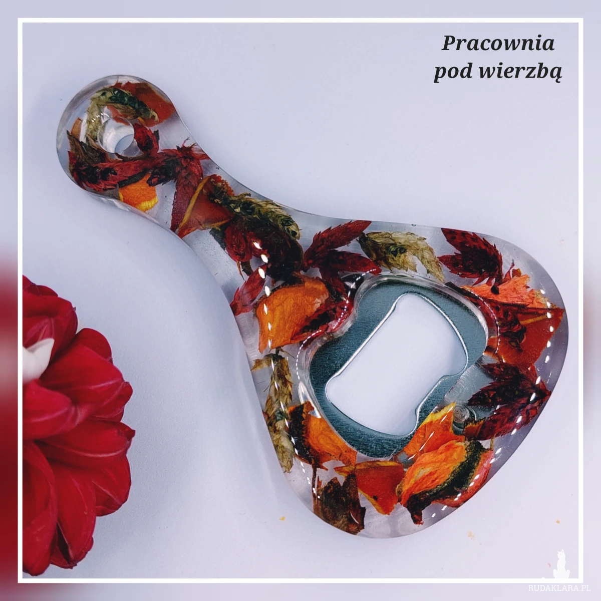 Otwieracz do butelek wielkości około 6cm x 11cm. Ręcznie wykonany z żywicy jubilerskiej i suszonych roślin w kolorze czerwonym.