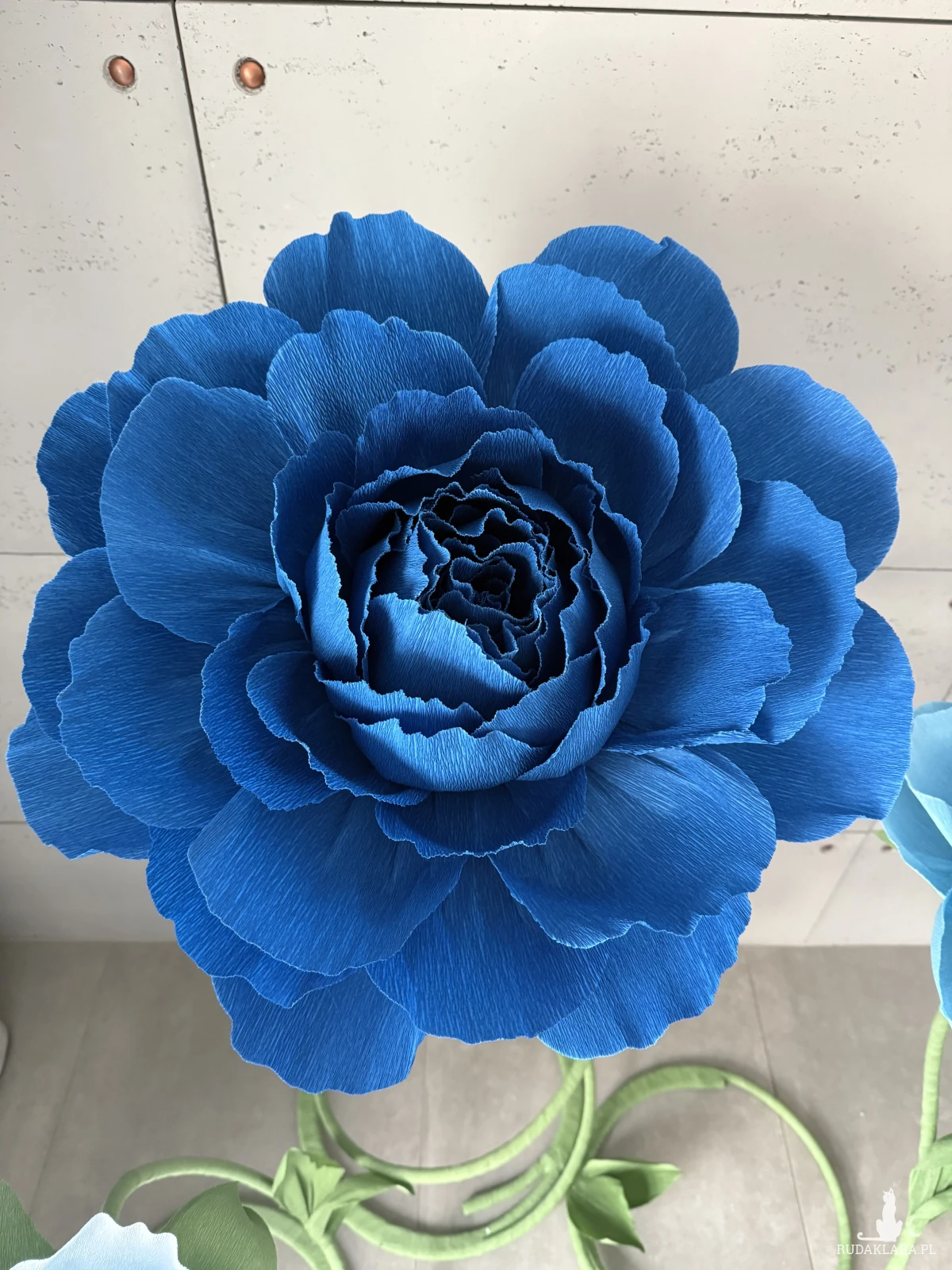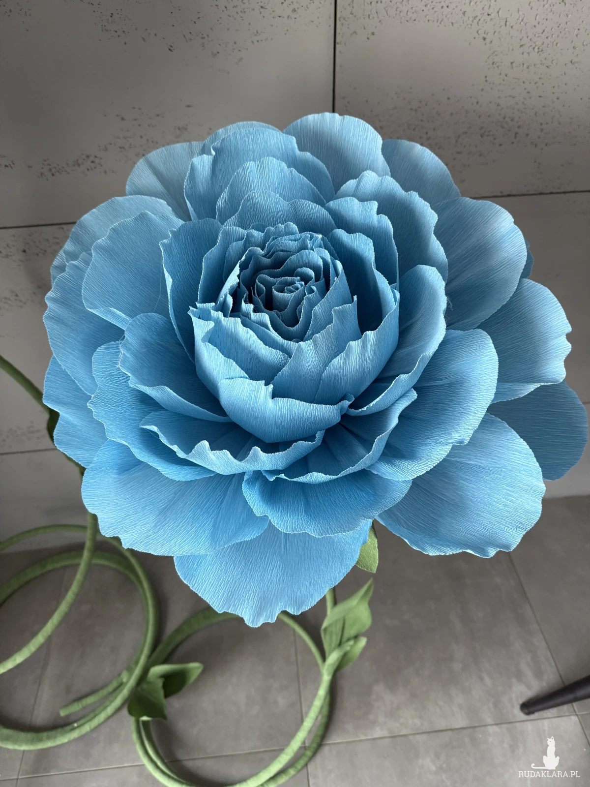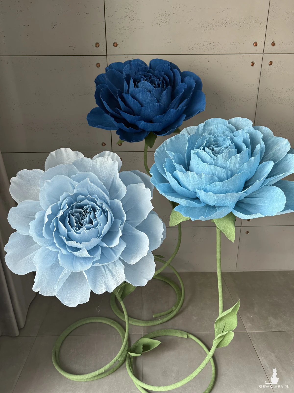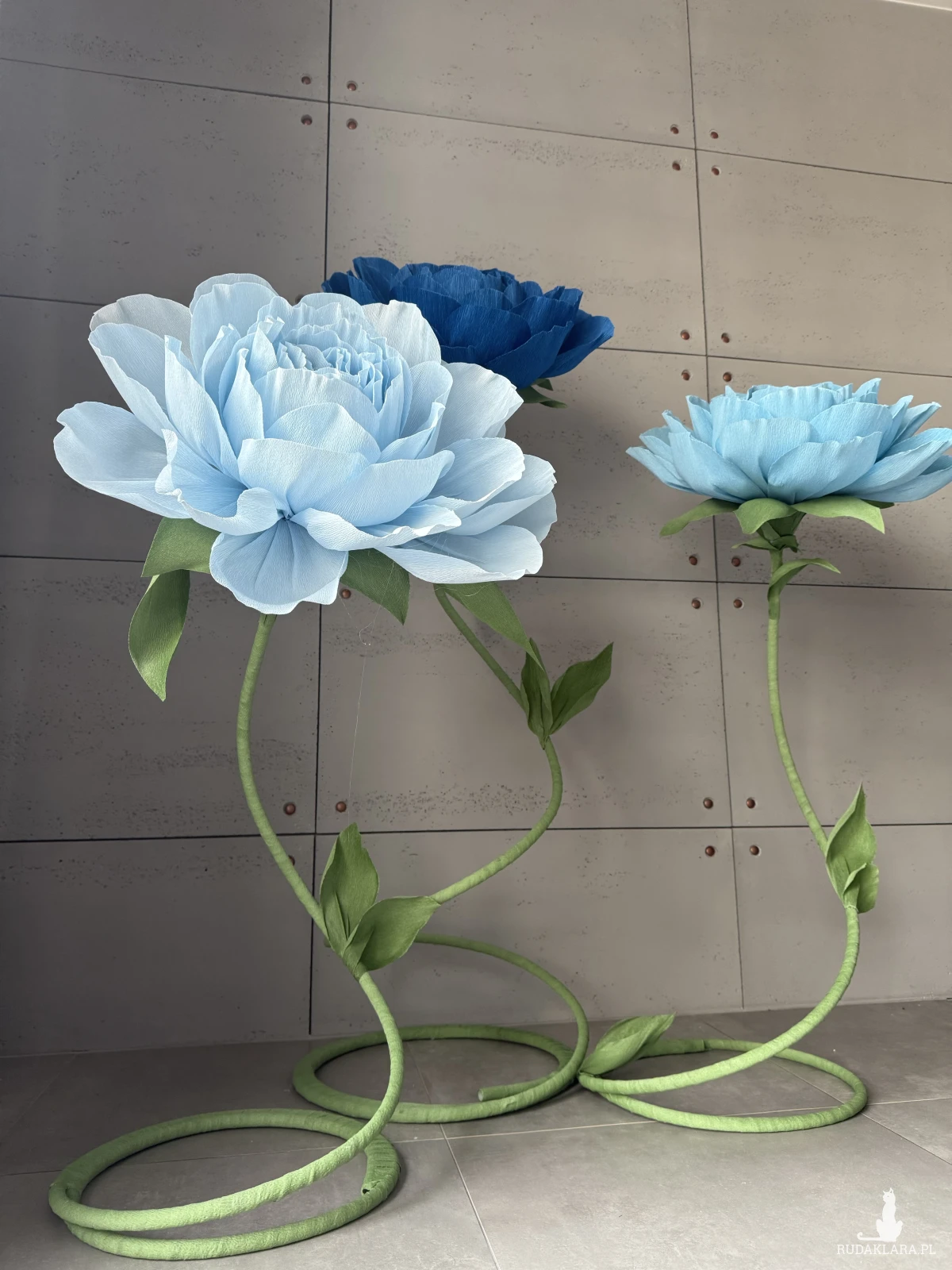 Piwonie z krepiny w kolorach błękitnych, łodygi zielone. Na życzenie możemy wykonać kwiaty również w innych kolorach. Kwiaty realizowane na zamówienie - termin do ustalenia. Średnica jednego kwiatka ok. 55 cm, wysokość ok. 130 cm (możliwość ustalenia innych wysokości). Idealne do dekoracji podczas komunii świętej, chrzcin, wesel czy urodzin.