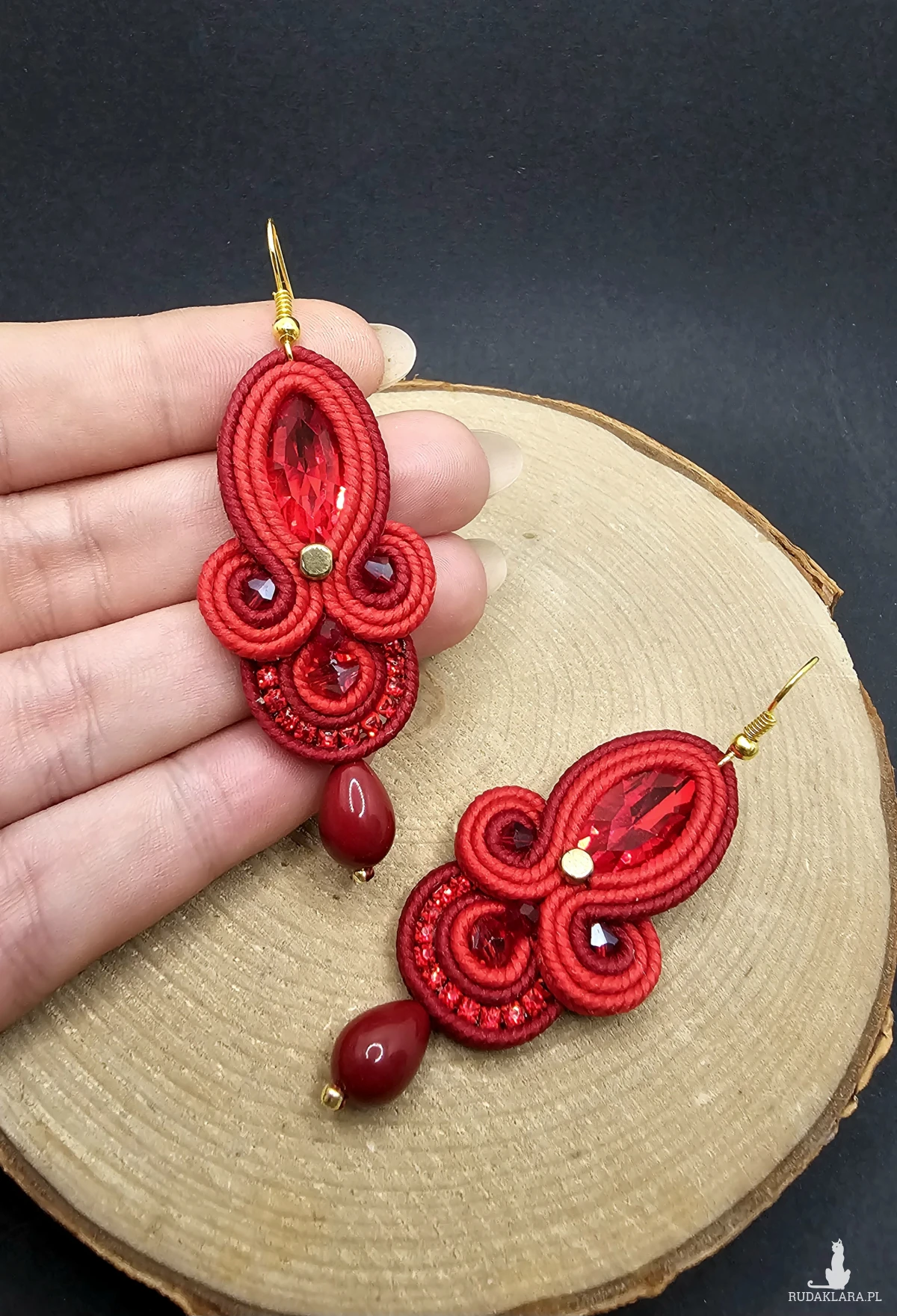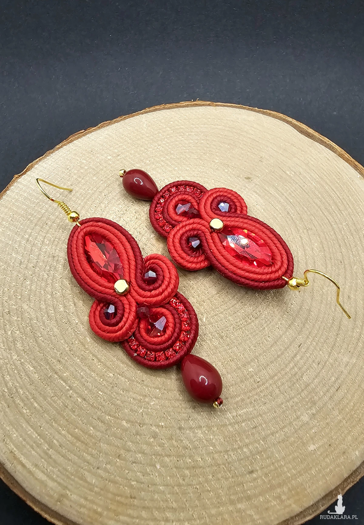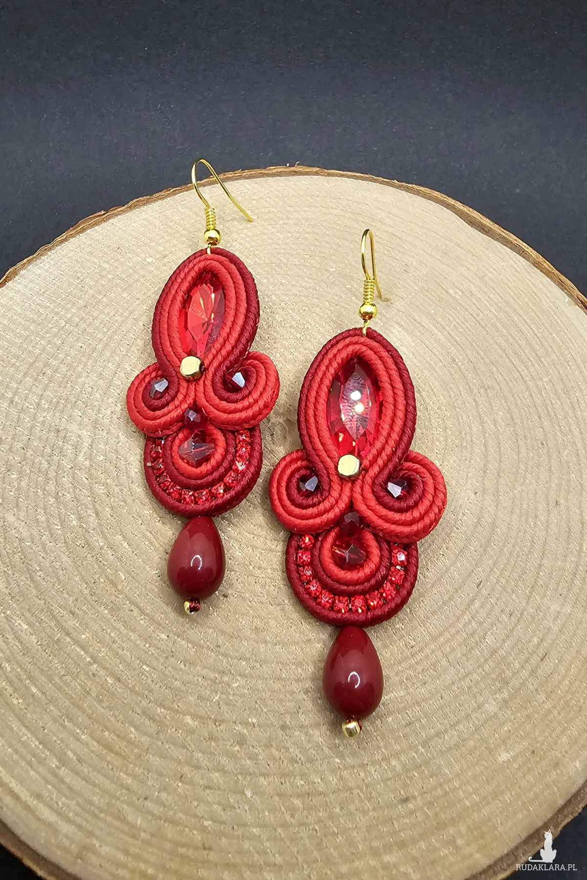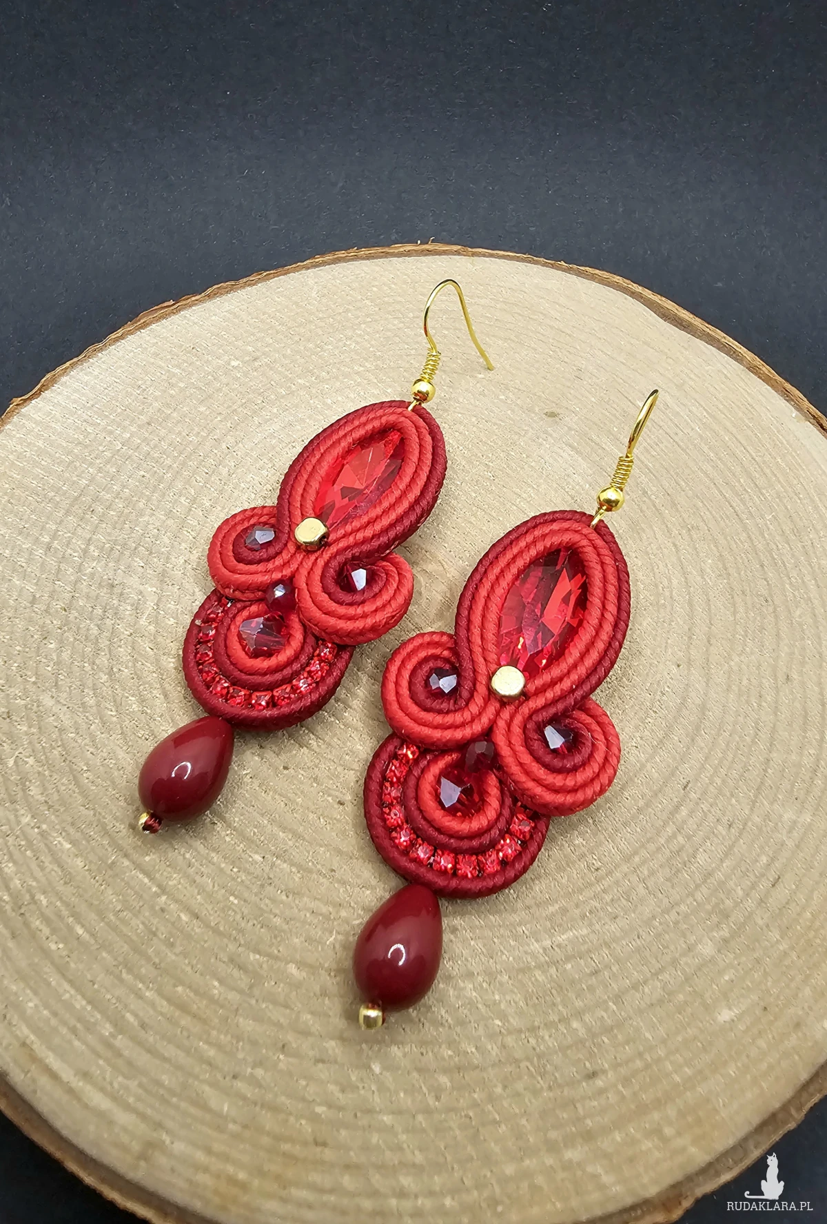 Czerwone fasetowane kryształki otoczone polskimi sznurkami sutasz, szklanymi koralikami w odcieniach bordo i czerwieni o różnych wielkościach. Dopełnieniem kolczyków jest pięknie błyszcząca taśma cyrkoniowa. Dół kolczyków zakończony szklanymi kroplami. Kolczyki zawieszone na klasycznych biglach w kolorze złota.