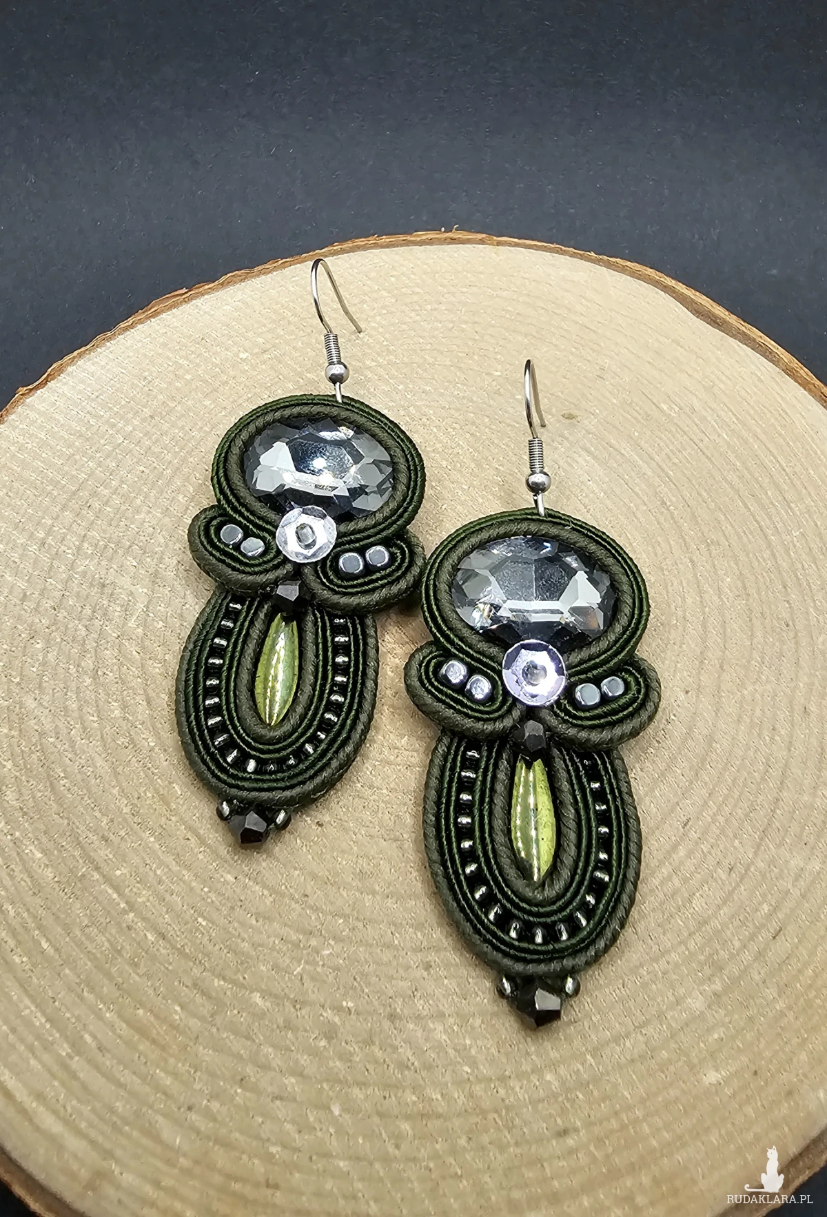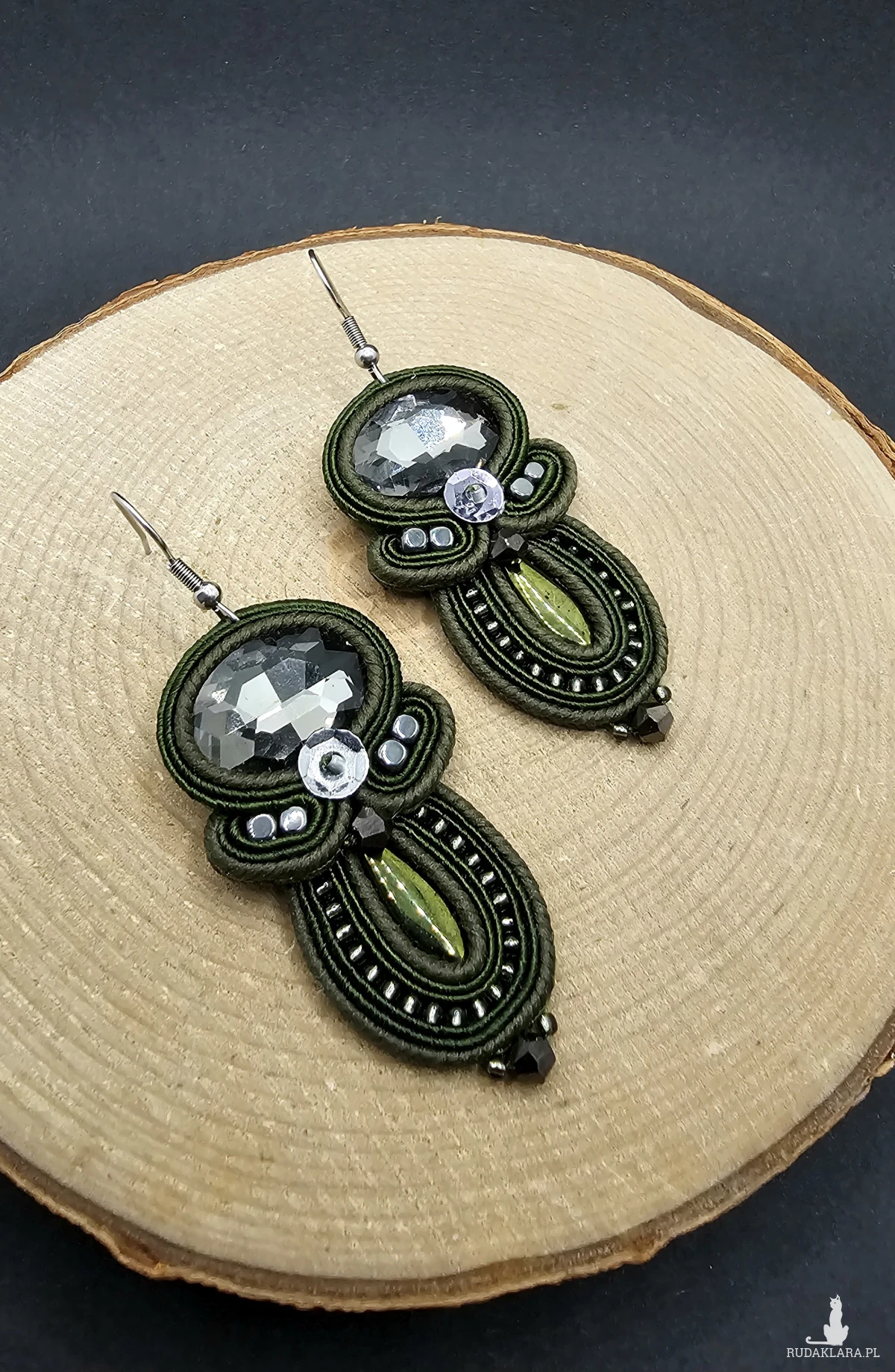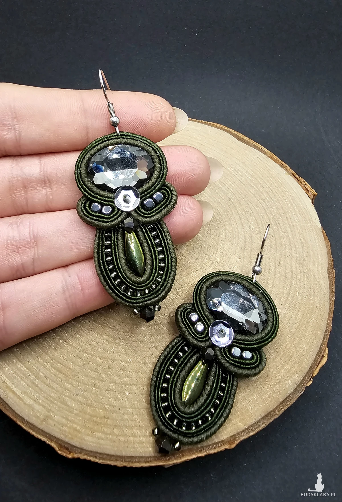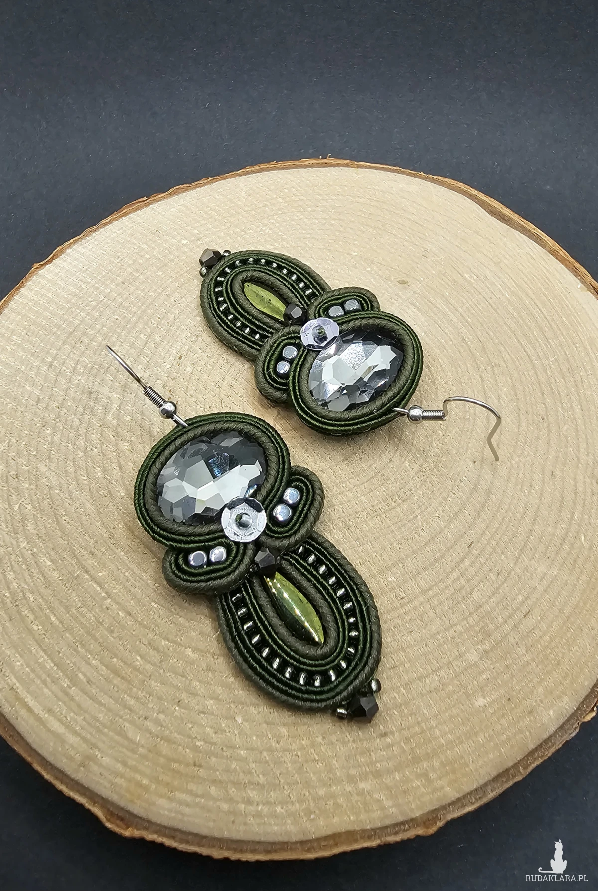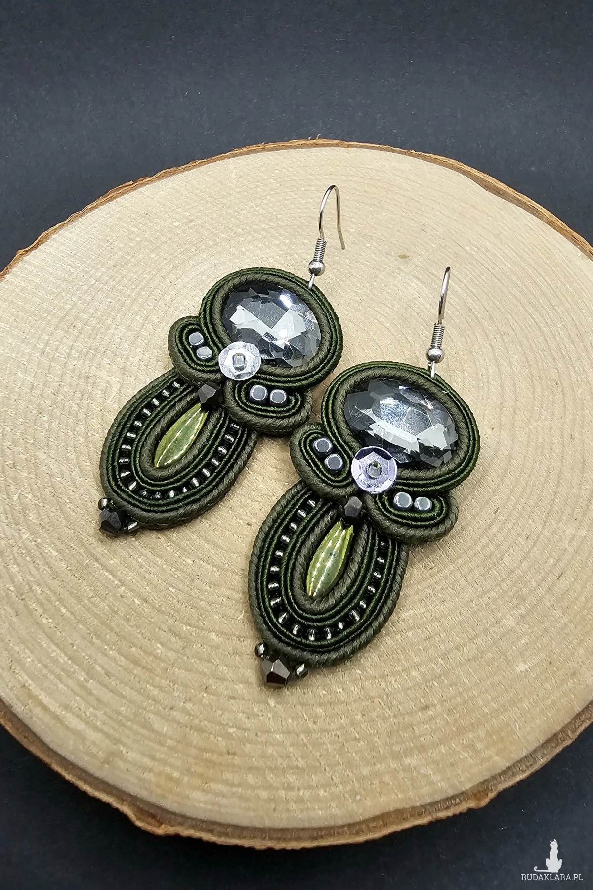 Szare fasetowane kryształki otoczone polskimi i czeskimi sznurkami sutasz, szklanymi koralikami w odcieniach zieleni i oliwki o różnych wielkościach. oraz kostkami hematytu Dopełnieniem kryształków są mieniąca się cekiny, która nadaje kolczykom blasku. Dół kolczyków zakończony niewielkimi szklanymi kryształkami. Kolczyki zawieszone na klasycznych biglach w kolorze ciemnego srebra.