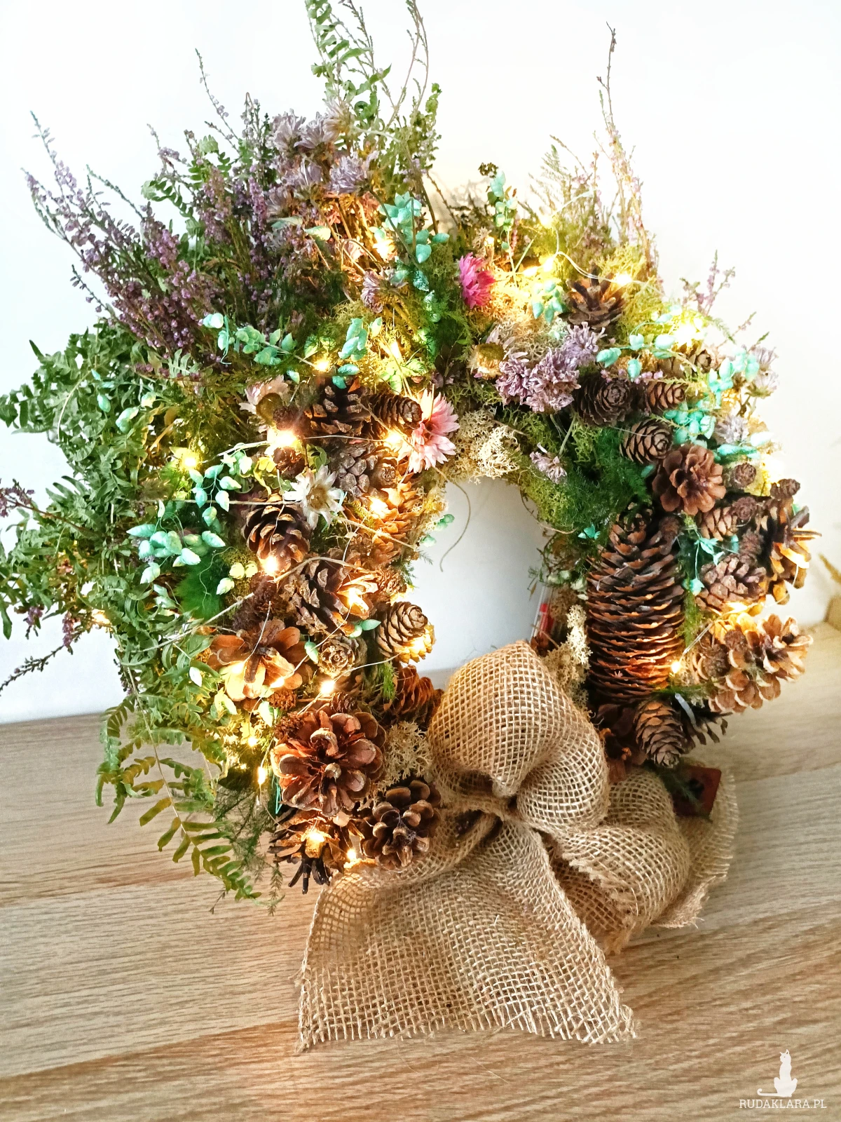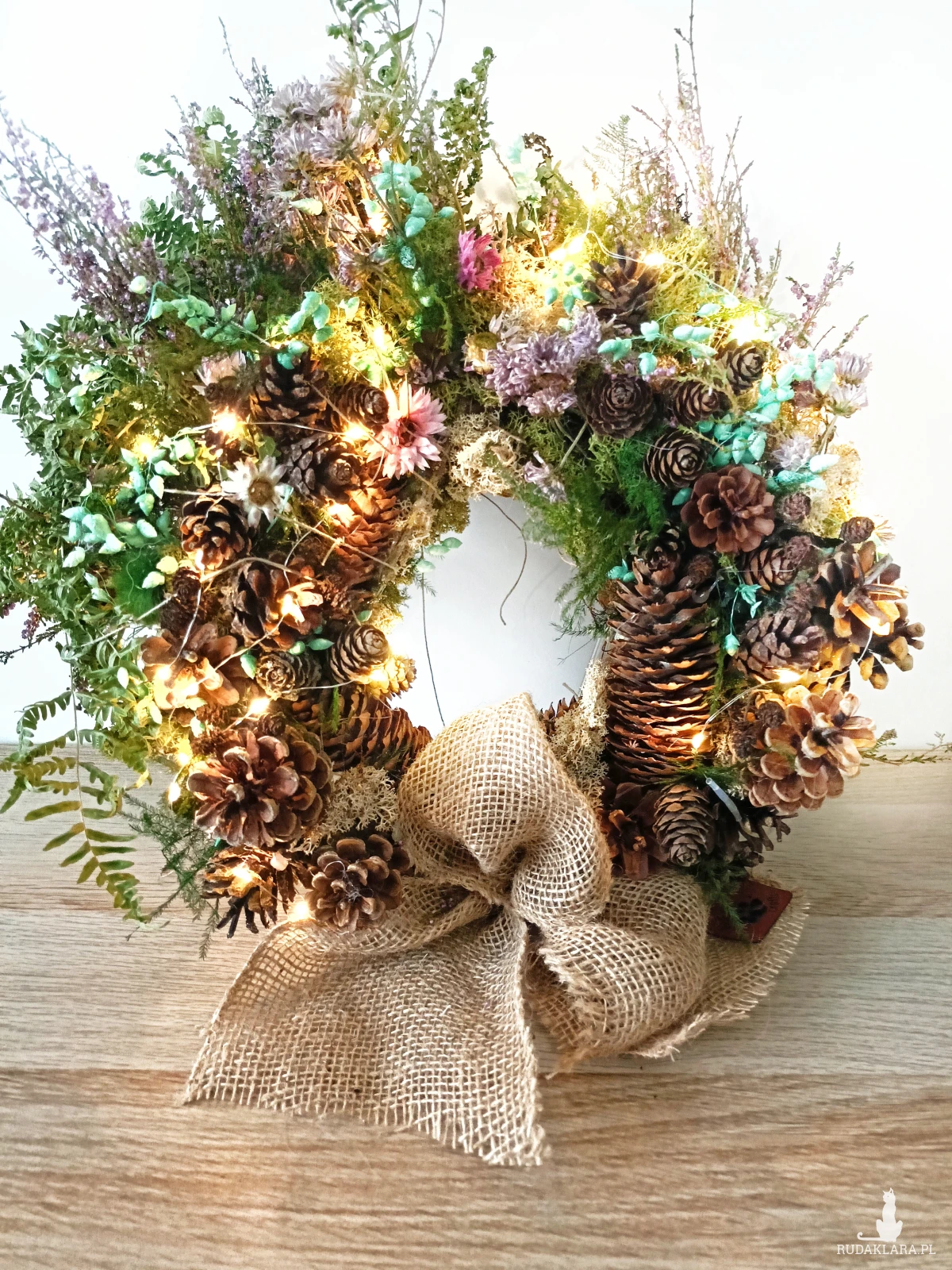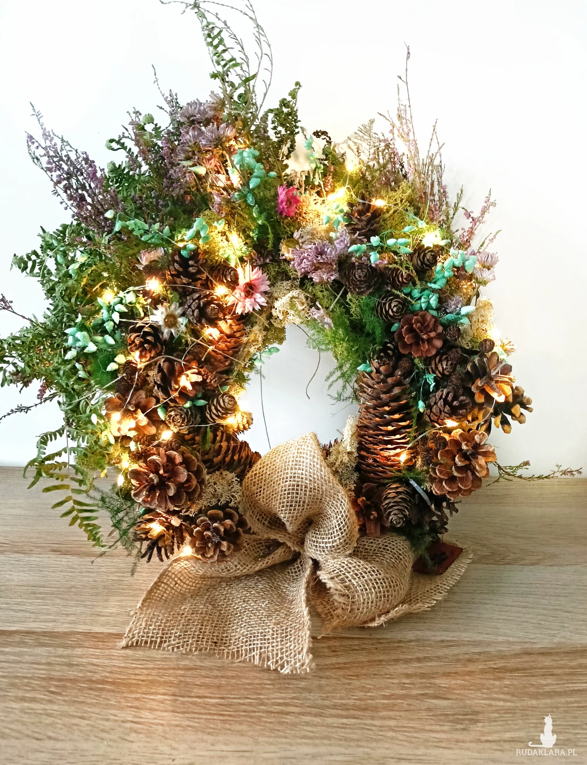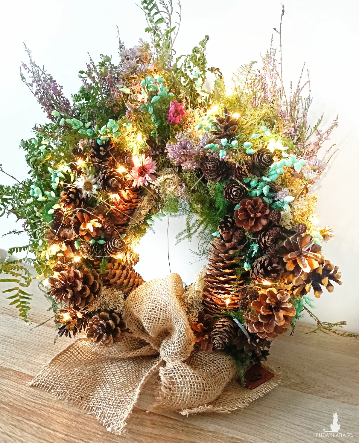 wianek leśny handmade • wianek podświetlany LED • dekoracja leśna • wianek z suszonych roślin • wianek na drzwi z oświetleniem • wianek rustykalny • ozdoba boho • wianek naturalny • dekoracja jesienna handmade • wianek ze świetlikami • stroik z paproci i szyszek