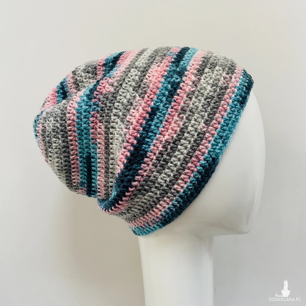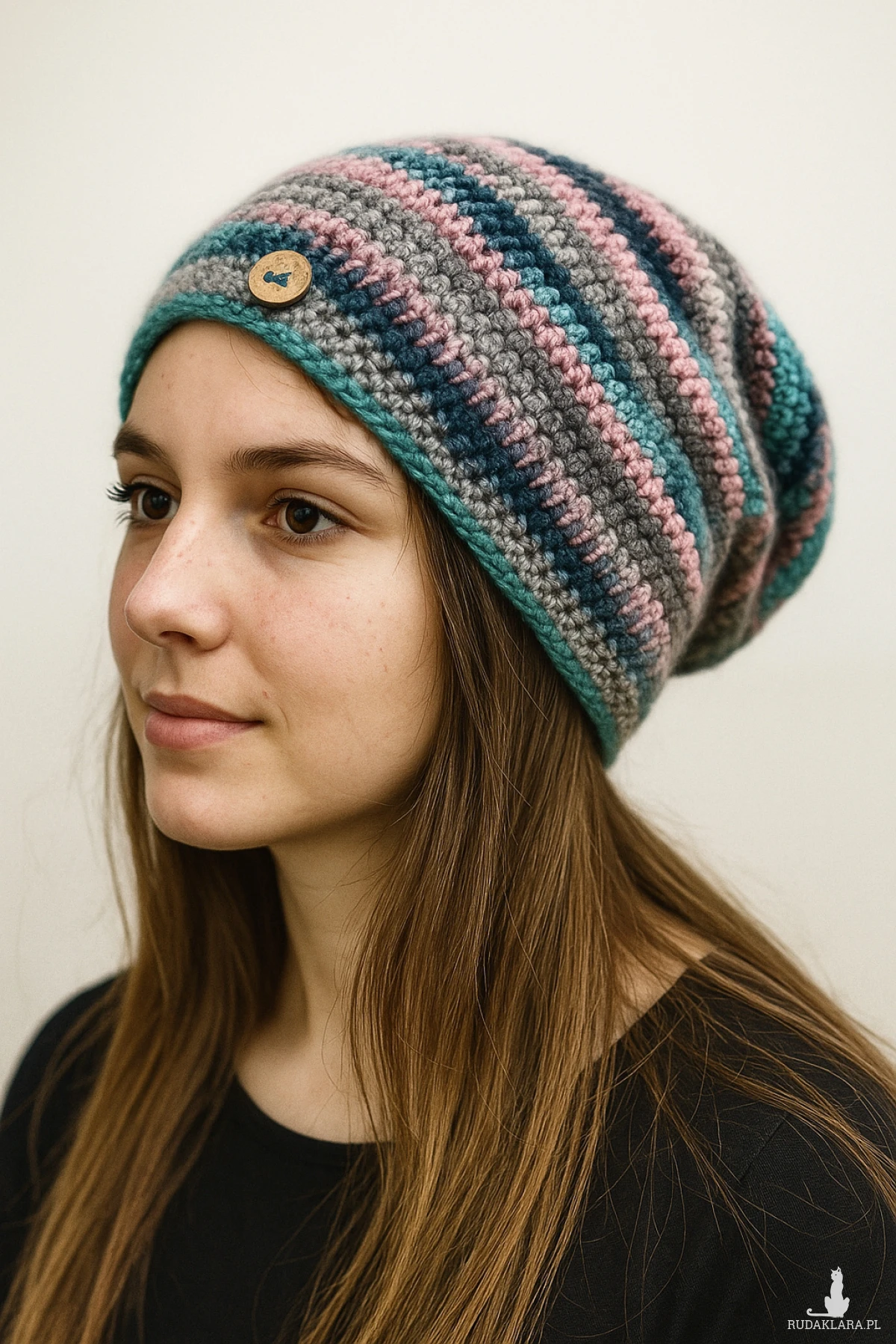 Czapkę wykonałam na szydełku z wysokiej jakości kolorowej włóczki akrylowej, z certyfikatem OEKO-TEX® Standard 100, który potwierdza, że jest bezpieczna dla zdrowia i nie zawiera niebezpiecznych substancji.