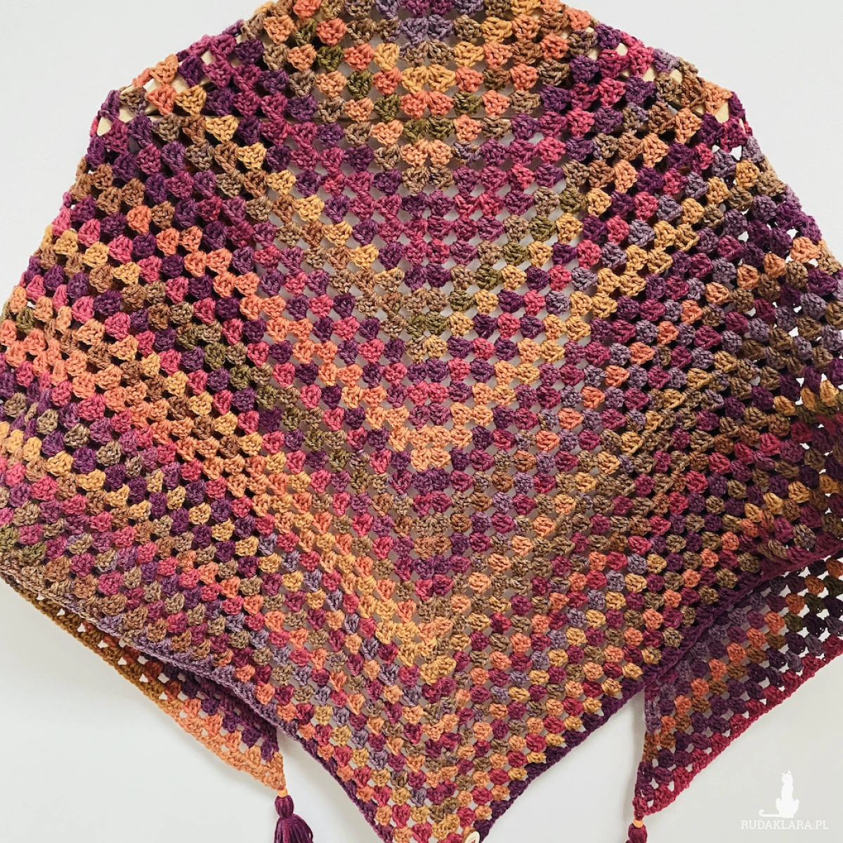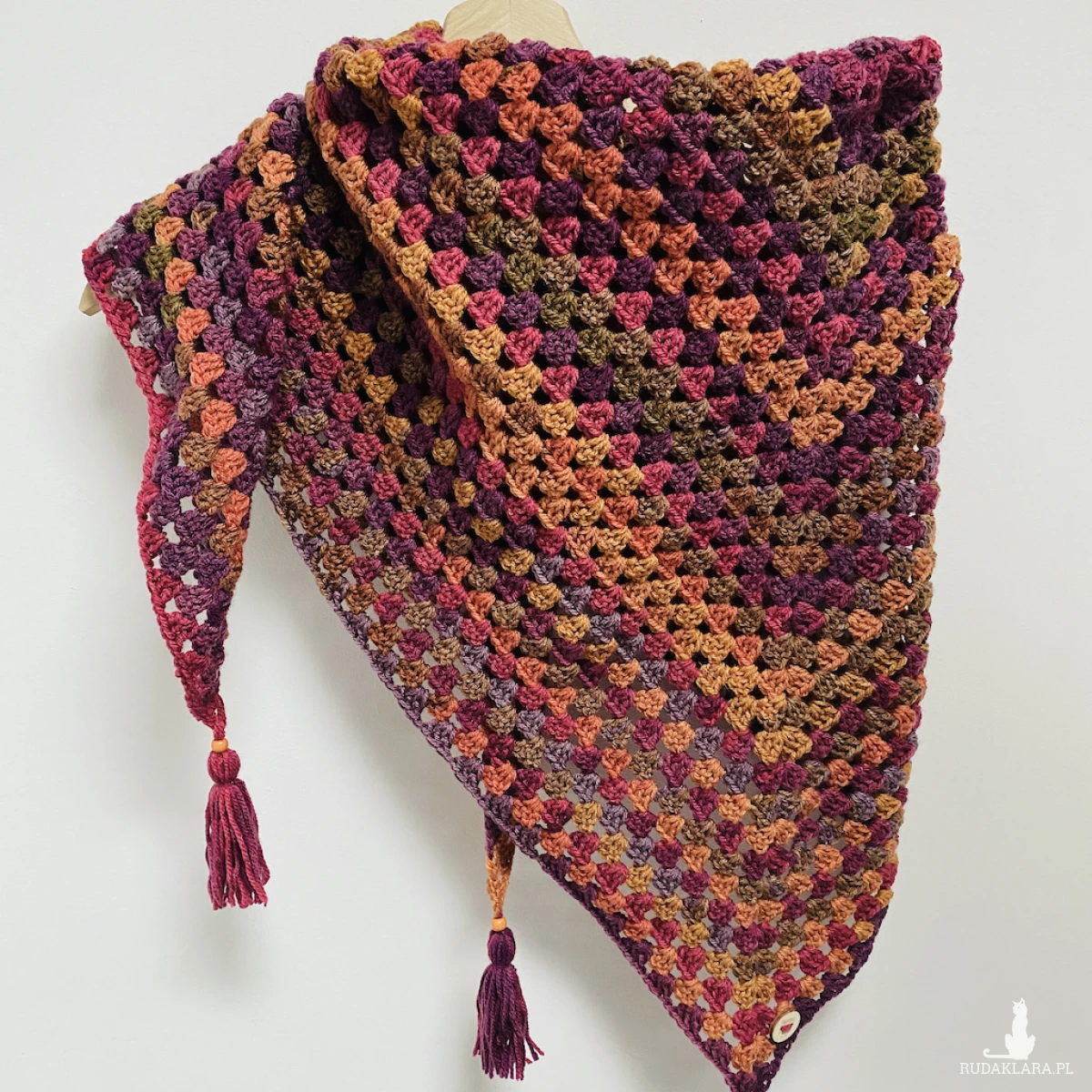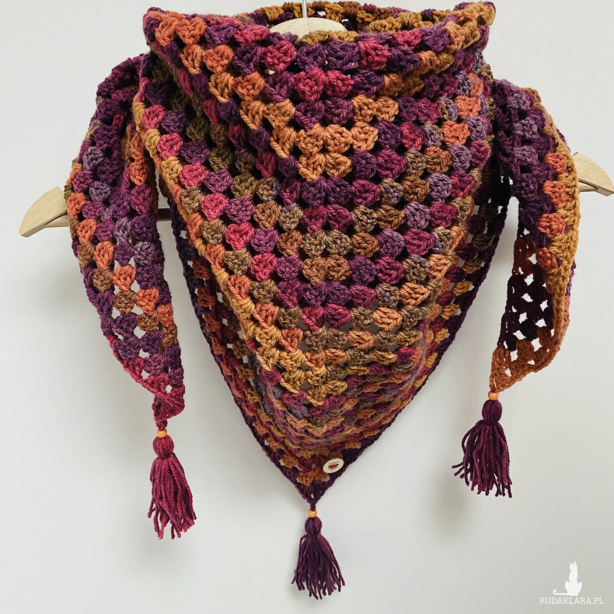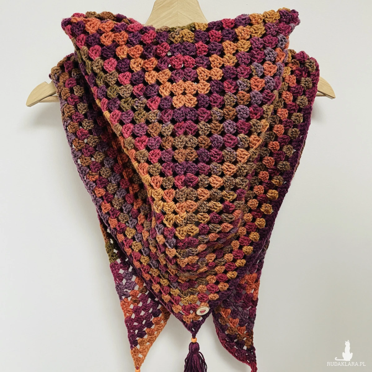Chustę wykonałam na szydełku z miękkiej włóczki akrylowej, która zachwyca intensywnością koloru i delikatnością. Certyfikat OEKO-TEX® Standard 100 potwierdza, że jest bezpieczna dla a zdrowia materiały użyte do jej produkcji są wolne od szkodliwych substancji chemicznych.