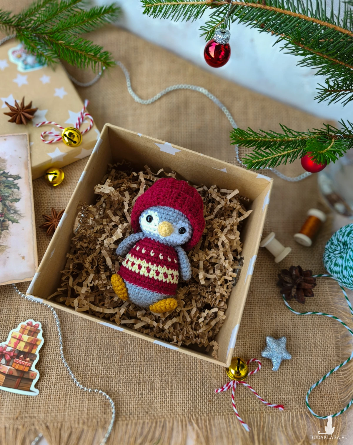 Mały zabawny pingwinek będzie uroczym upominkiem na Święta Bożego Narodzenia lub przytulnym prezentem dla maluszków na wiele różnych okazji.