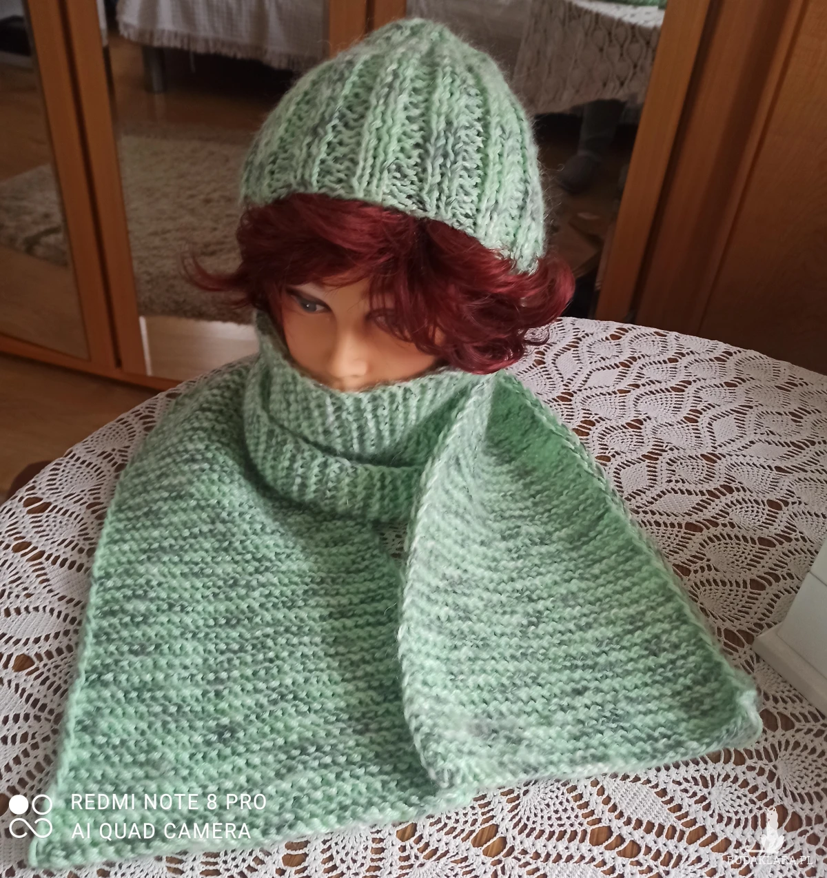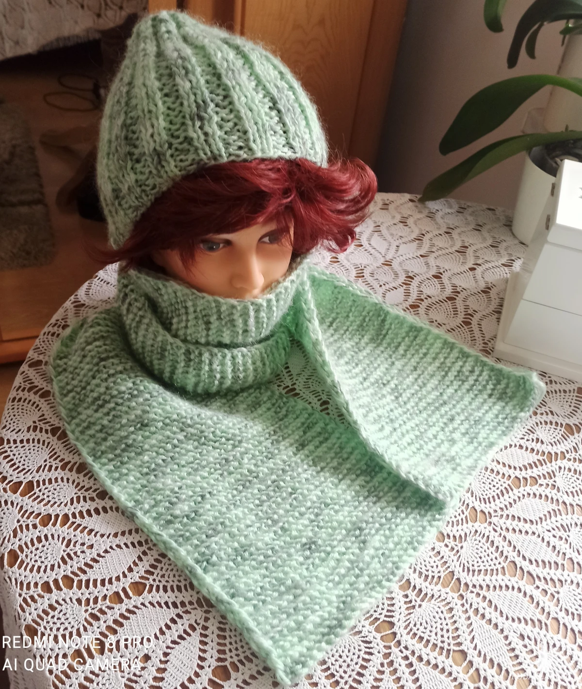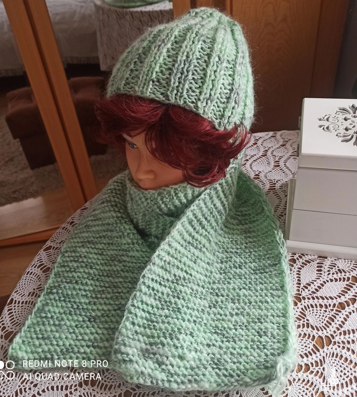 Czapka /wysokość 24 cm, obwód do 60 cm/ oraz długi szalik na 154 cm, szerokość 22,5 cm. Komplet w kolorze jasnej zieleni z centkami szarości i białego . Wykonany na drutach z wełny moherowo-akrylowej Flauschgarn mit mohair . Wyrób bardzo delikatny, mięciutki i bardzo przyjemny w dotyku. Nie rozciąga się, jest sprężysty i łatwo dopasowuje się ciała. Przy różnej pogodzie istnieje możliwość wykorzystania szalika /jest dosyć obszerny jako chustę bezpośrednio na głowę lub na czapkę z daszkiem oraz na odzież wierzchnią lub na bluzkę/ jako ozdoby. Doskonały komplet na chłodniejszą lub nawet zimną pogodę. Kolor bardzo modny i intrygujący, nieszablonowy. Wykonany na drutach ściegiem francuskim. Czapka wykonana wzorem ściągaczowym 2 lewe, dwa prawe oczka. Doradzam wyłącznie pranie ręczne, w temperaturze do 30 stopni. Gorąco polecam, niska cena.