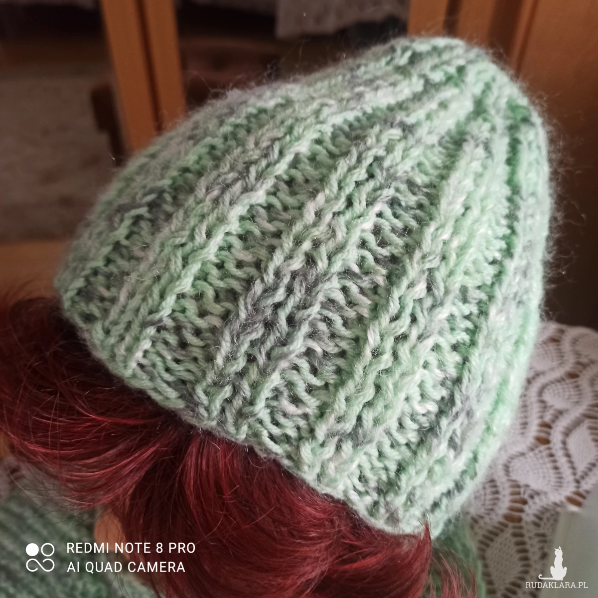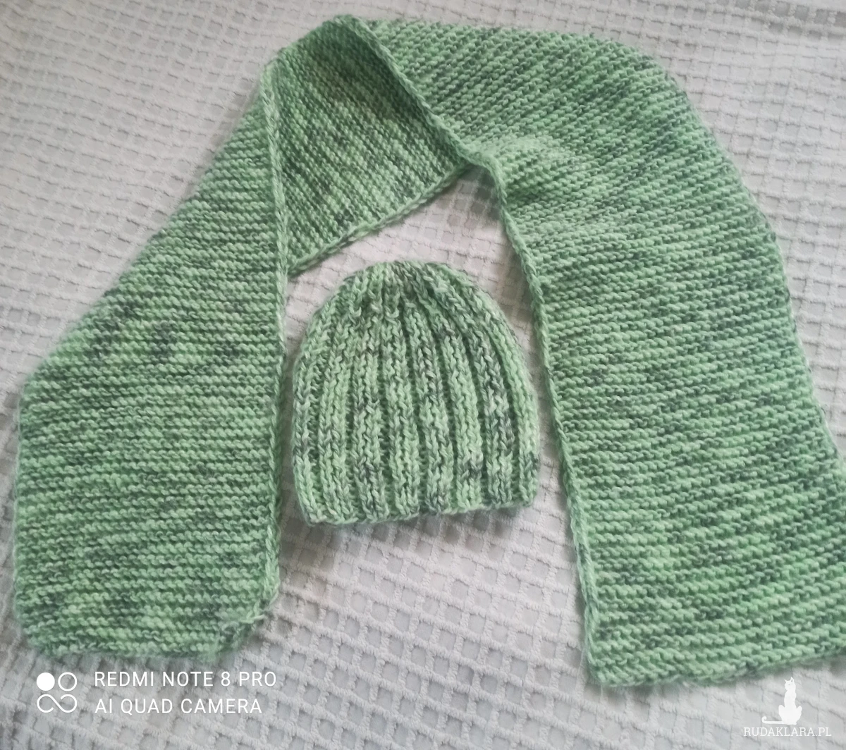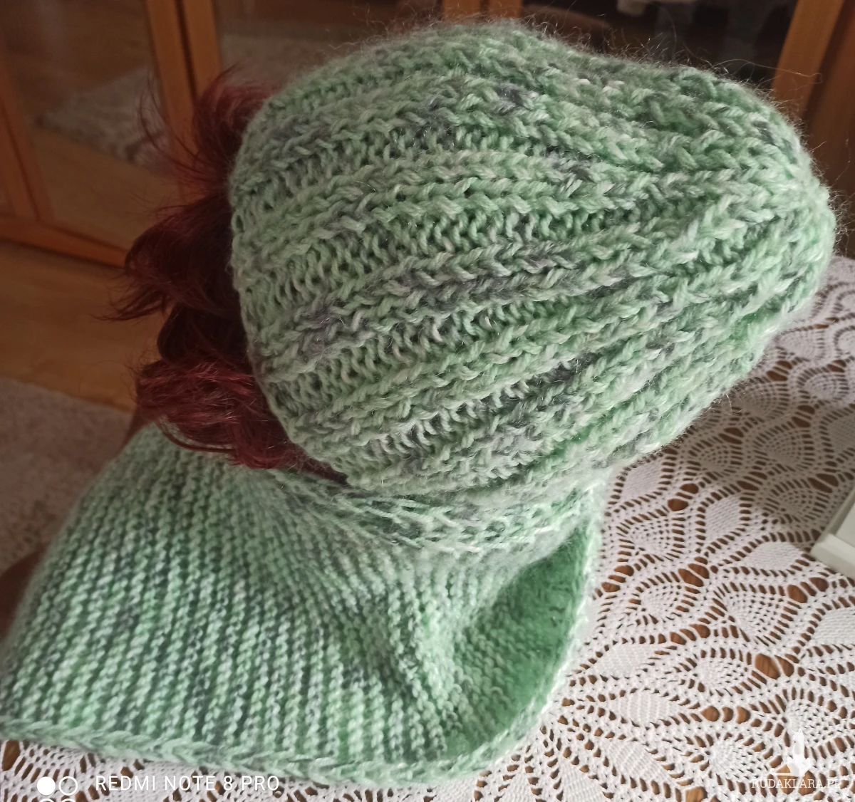 Czapka /wysokość 24 cm, obwód do 60 cm/ oraz długi szalik na 154 cm, szerokość 22,5 cm. Komplet w kolorze jasnej zieleni z centkami szarości i białego . Wykonany na drutach z wełny moherowo-akrylowej Flauschgarn mit mohair . Wyrób bardzo delikatny, mięciutki i bardzo przyjemny w dotyku. Nie rozciąga się, jest sprężysty i łatwo dopasowuje się ciała. Przy różnej pogodzie istnieje możliwość wykorzystania szalika /jest dosyć obszerny jako chustę bezpośrednio na głowę lub na czapkę z daszkiem oraz na odzież wierzchnią lub na bluzkę/ jako ozdoby. Doskonały komplet na chłodniejszą lub nawet zimną pogodę. Kolor bardzo modny i intrygujący, nieszablonowy. Wykonany na drutach ściegiem francuskim. Czapka wykonana wzorem ściągaczowym 2 lewe, dwa prawe oczka. Doradzam wyłącznie pranie ręczne, w temperaturze do 30 stopni. Gorąco polecam, niska cena.