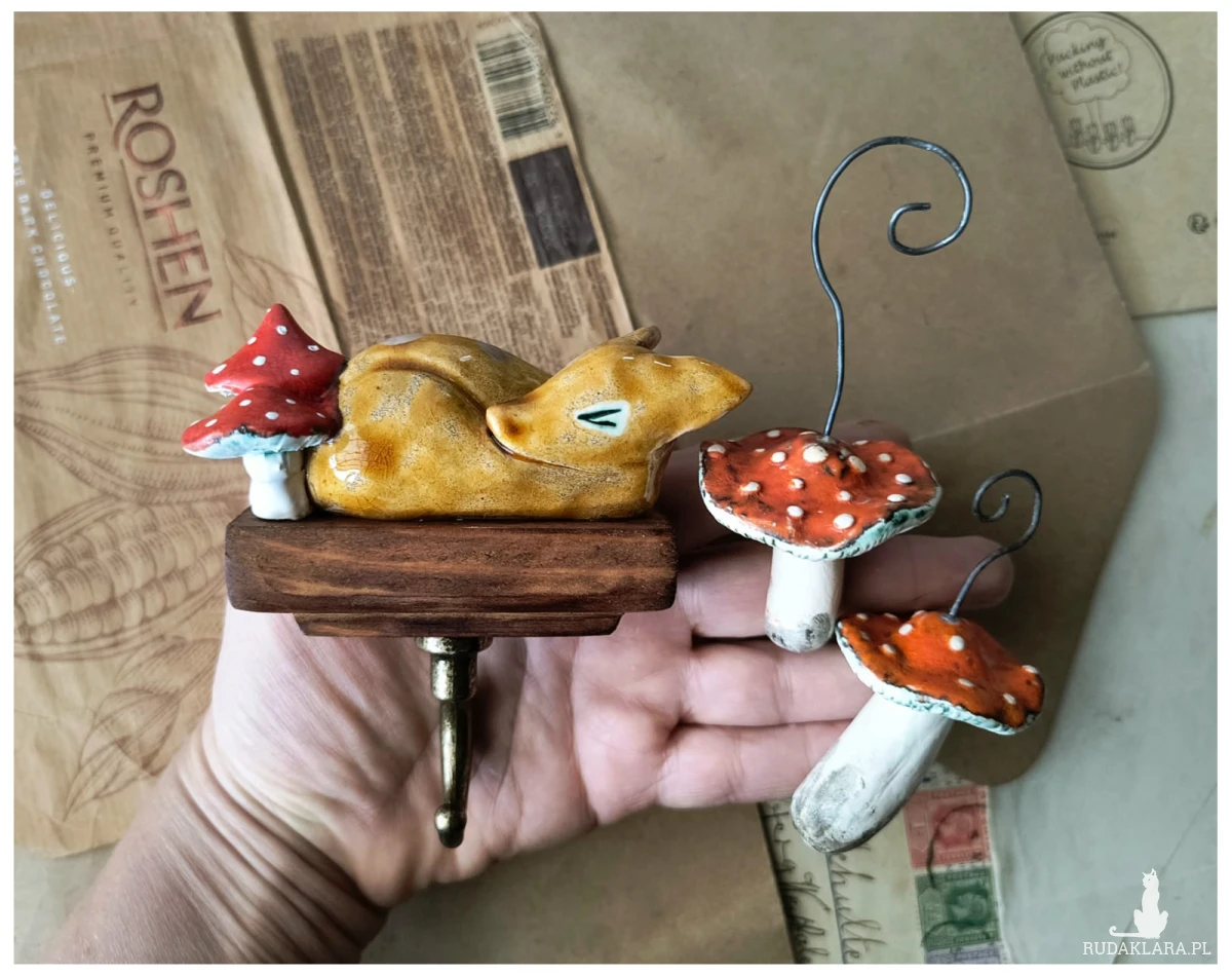 Zestaw złożony z wieszaczka o dł. 7 cm z motywem leśnym - śpiącej sarenki oraz 2 muchomorków zawieszek wielkości ok 3,5 cm x 5 cm bez zaczepu. Polecam serdecznie jako ozdoby do pokoju dziecięcego.