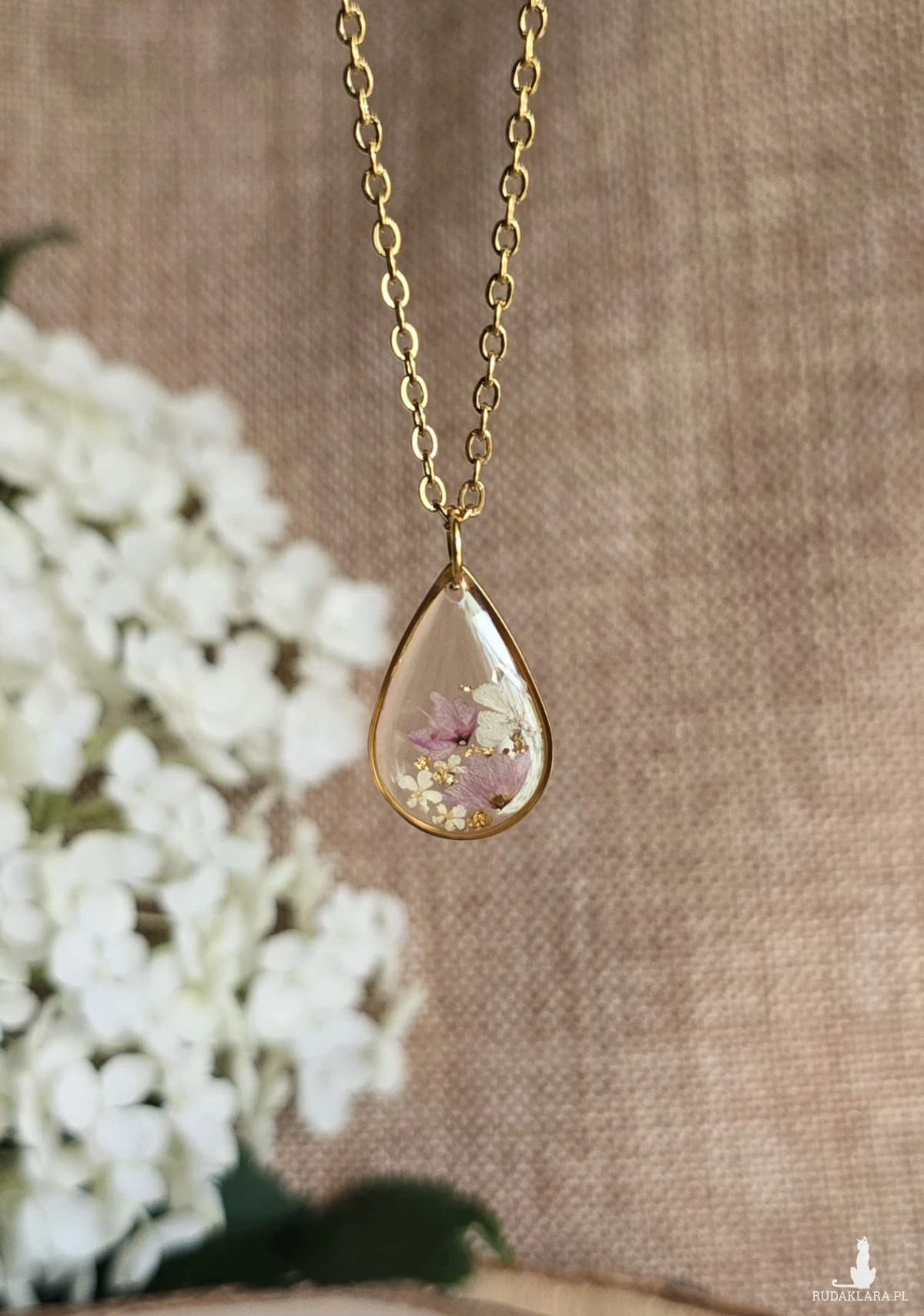 Oferuję Państwu unikalną biżuterię. Zawieszka jest wykonana z suszonych kwiatów i żywicy epoksydowej. Biżuteria jest wspaniałym i oryginalnym prezentem na lata.