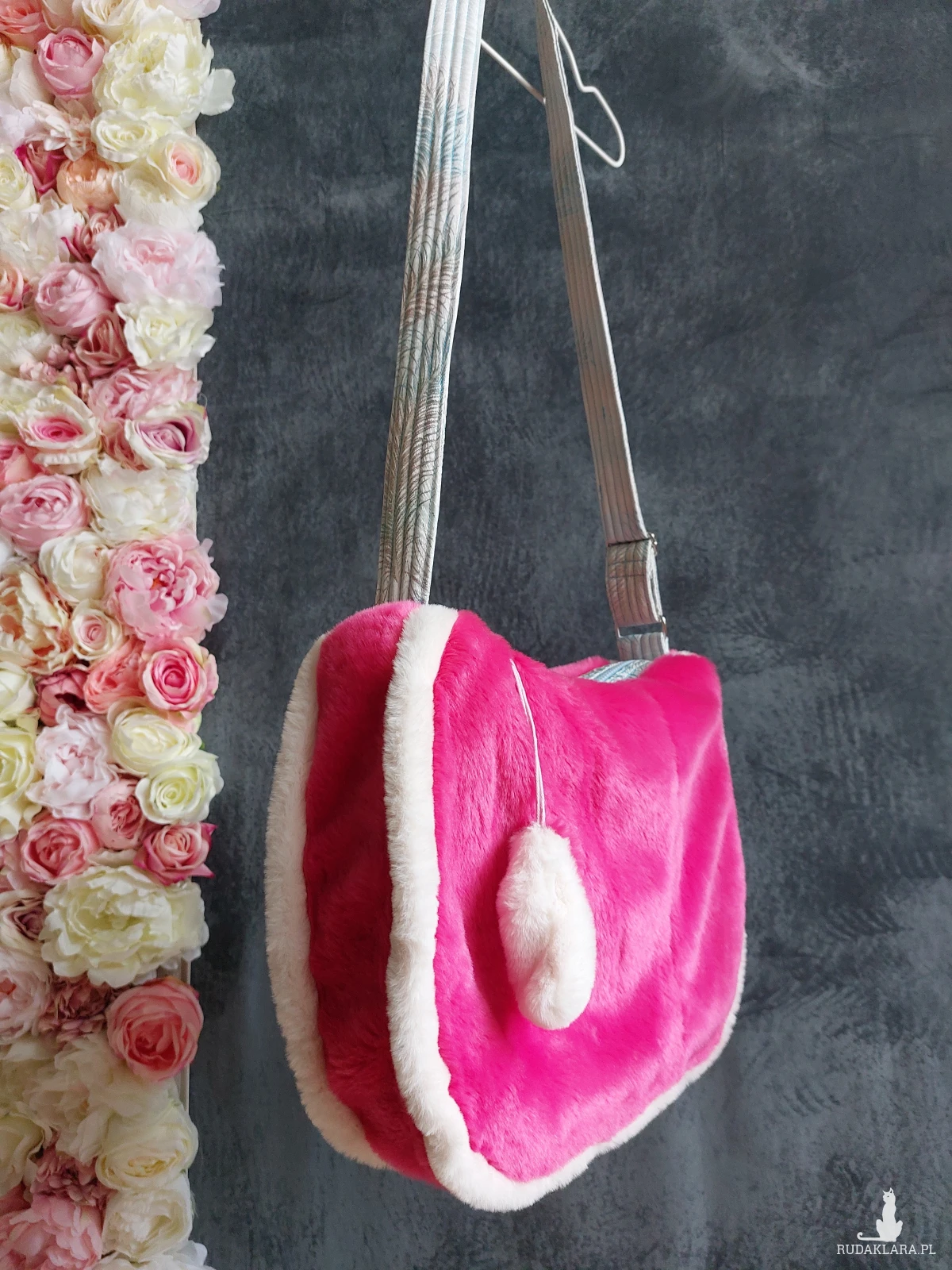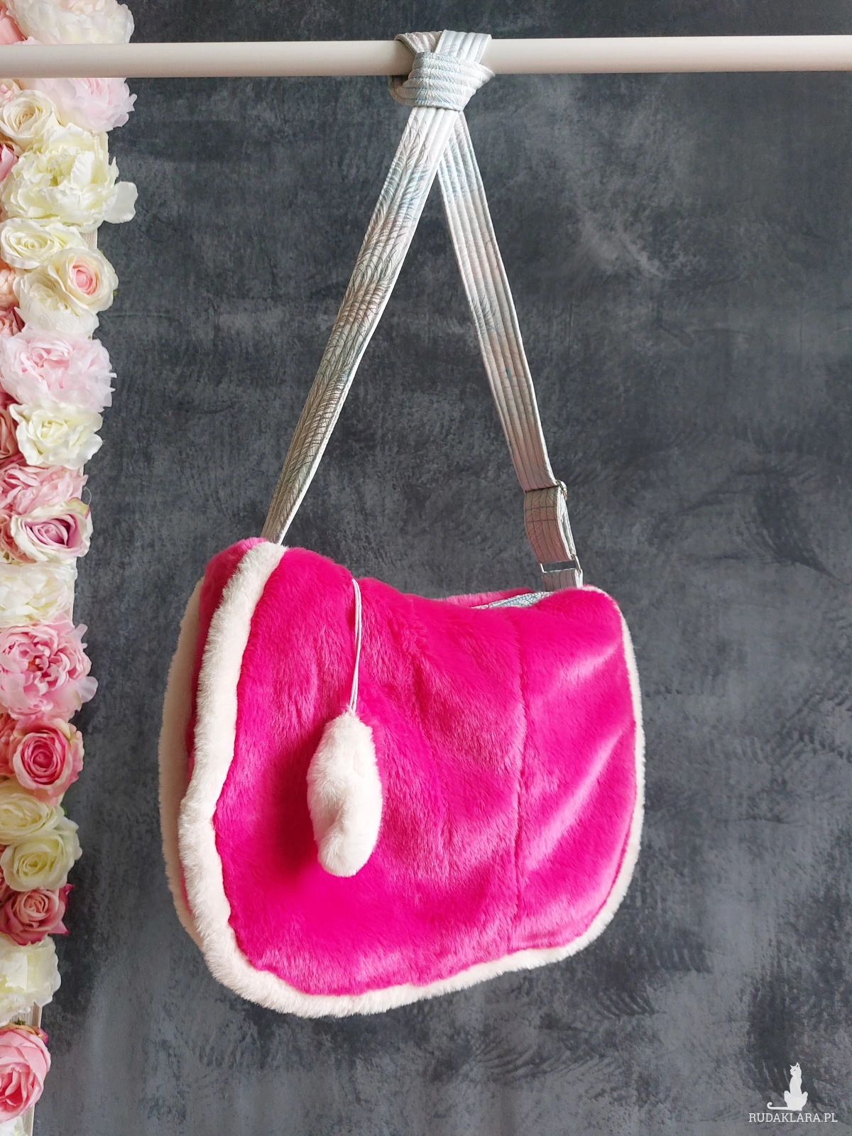 Spora torba na ramię, w intensywnie różowym kolorze, wykonana z pluszowego futerka. Jest niesamowicie miękka i miła w dotyku. Niebieski środek wykonany z pikowanej satyny. W środku kieszonka zamykana na magnes. Tkaniny 100% poliester. Torebka pomieści format A4. Jej wymiary to: 39/ 28/ 8 cm. Długość zamka 29 cm. Regulowany pasek o maksymalnej długości 128 cm