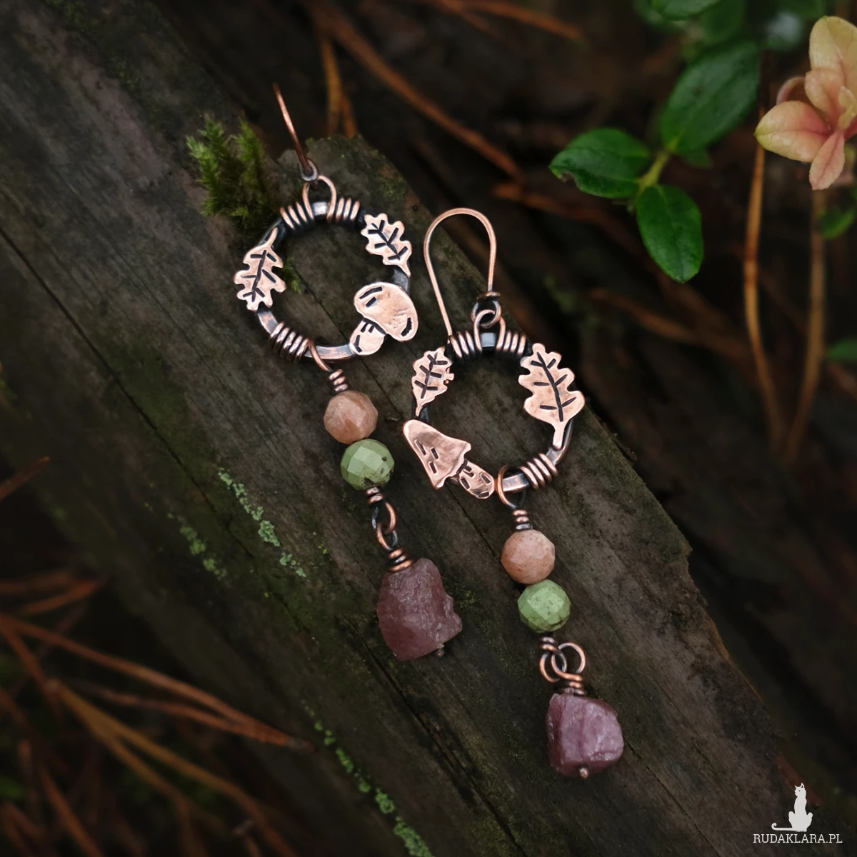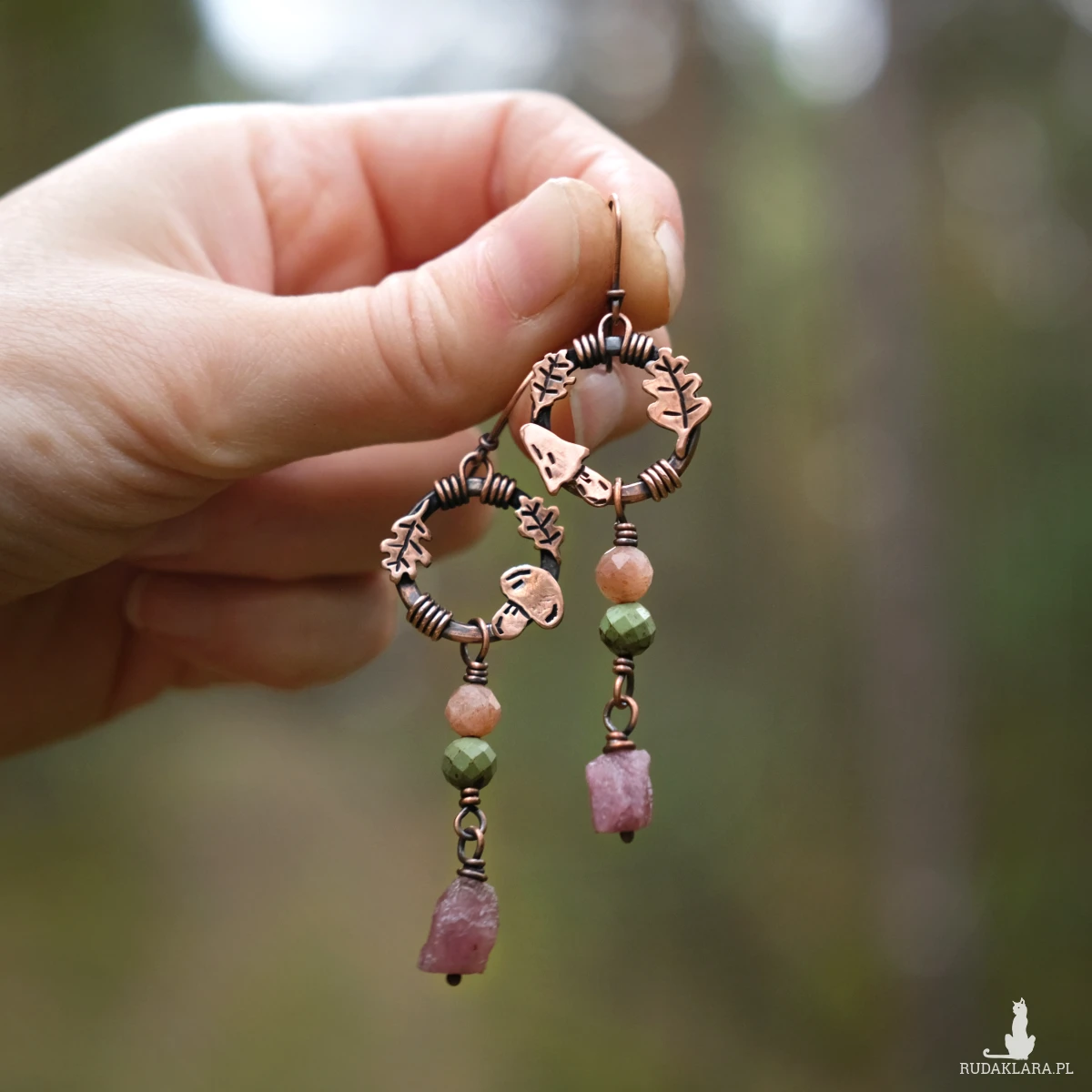Miedziane unikatowe kolczyki kółka z grzybkami i liśćmi. Urocze i delikatne w bajkowym leśnym klimacie, posiadają kamienie słoneczne, turkus oraz różowe bryłki turmalinu. Sprawdzą się na co dzień jak i na większe okazje. Idealna propozycja dla fanek przyrody, grzybobrania i leśnych wojaży :-)
