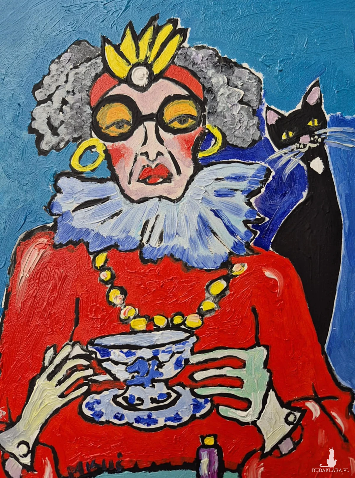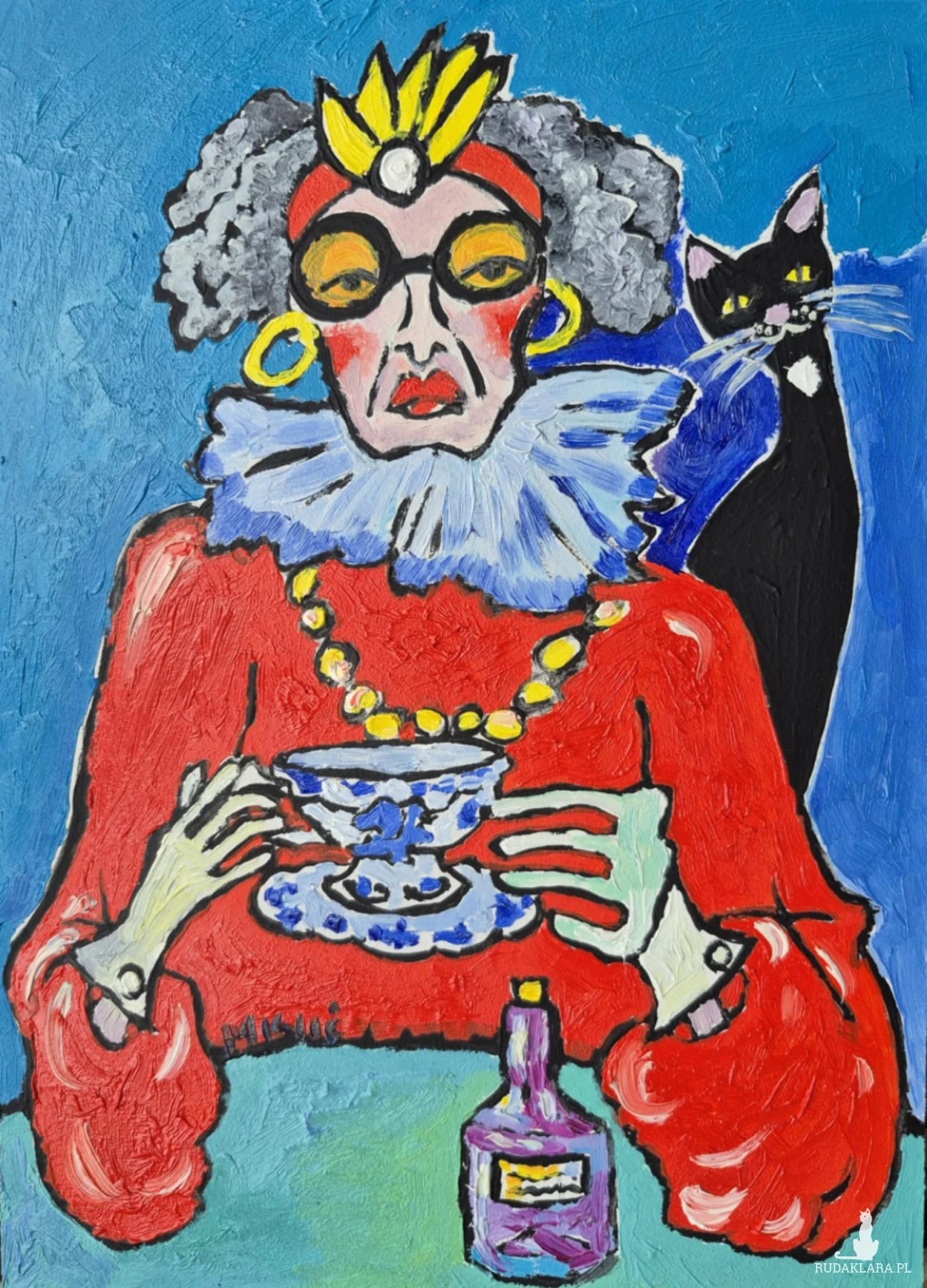 Na obrazie widzimy postać starszej damy – być może ekscentrycznej arystokratki lub emerytowanej divy teatru – zasiadającej do popołudniowej herbaty. Jej przesadny strój, teatralny makijaż i korona sugerują, że świat codzienności miesza się tu z fantazją. Wyraz twarzy – chłodny, nieco zniecierpliwiony – kontrastuje z jaskrawymi kolorami i dekoracyjnością postaci. W tle czai się czarny kot, który może być symbolem tajemnicy, niezależności lub… cichego współuczestnika jej rytuałów.