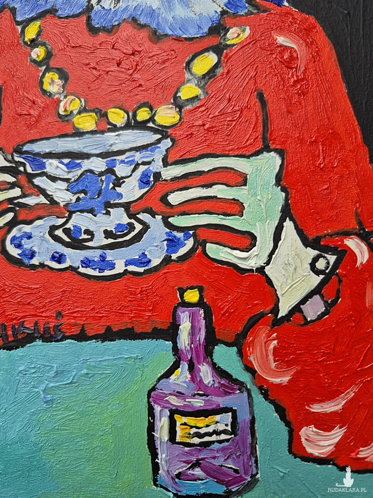 Fioletowa butelka na stole – z eliksirem, perfumami albo alkoholem – dodaje scenie nuty surrealizmu, a może nawet humorystycznej krytyki społecznych rytuałów i snobizmu. To obraz, który balansuje między groteską a baśnią, codziennością a przedstawieniem.