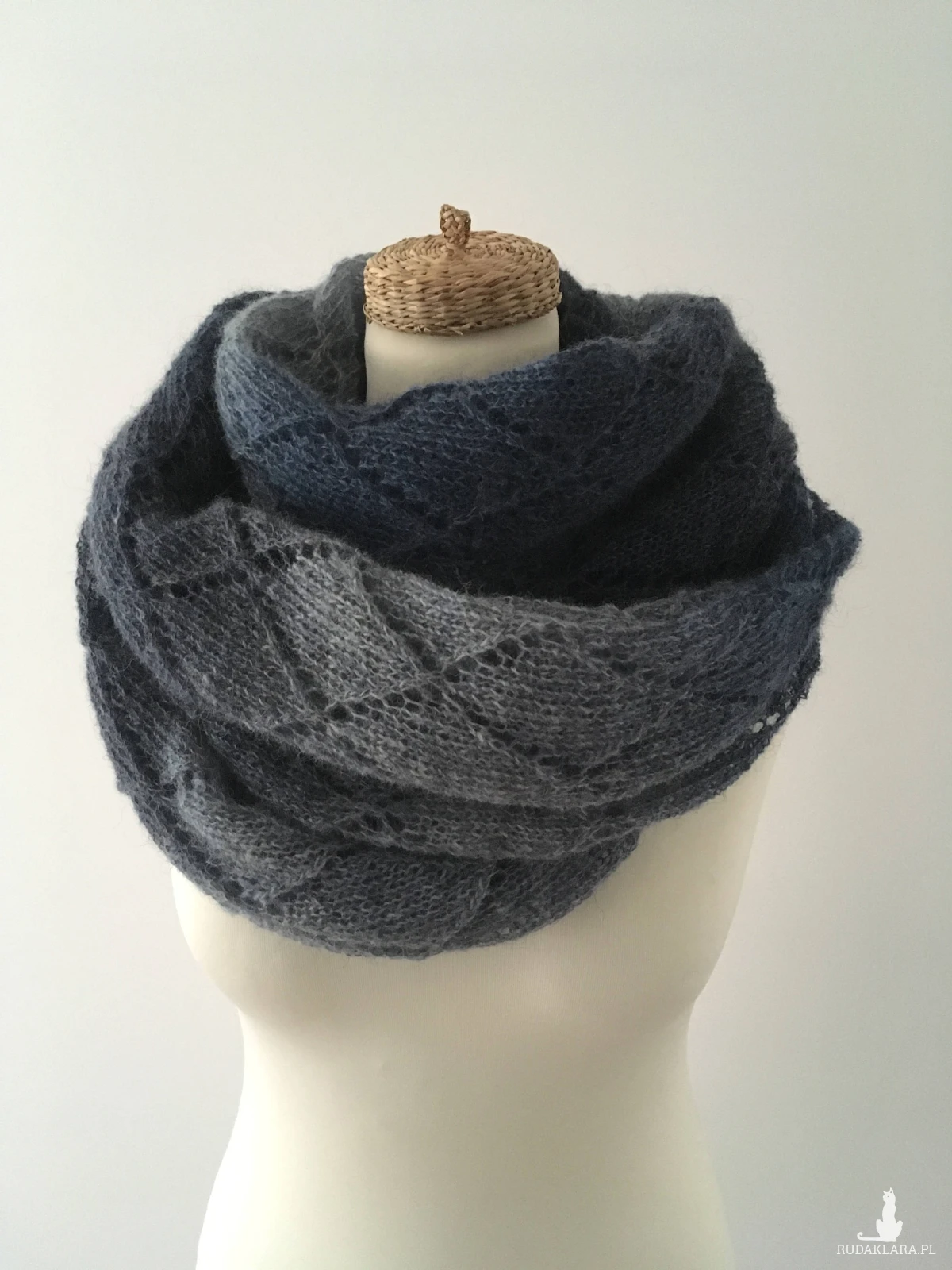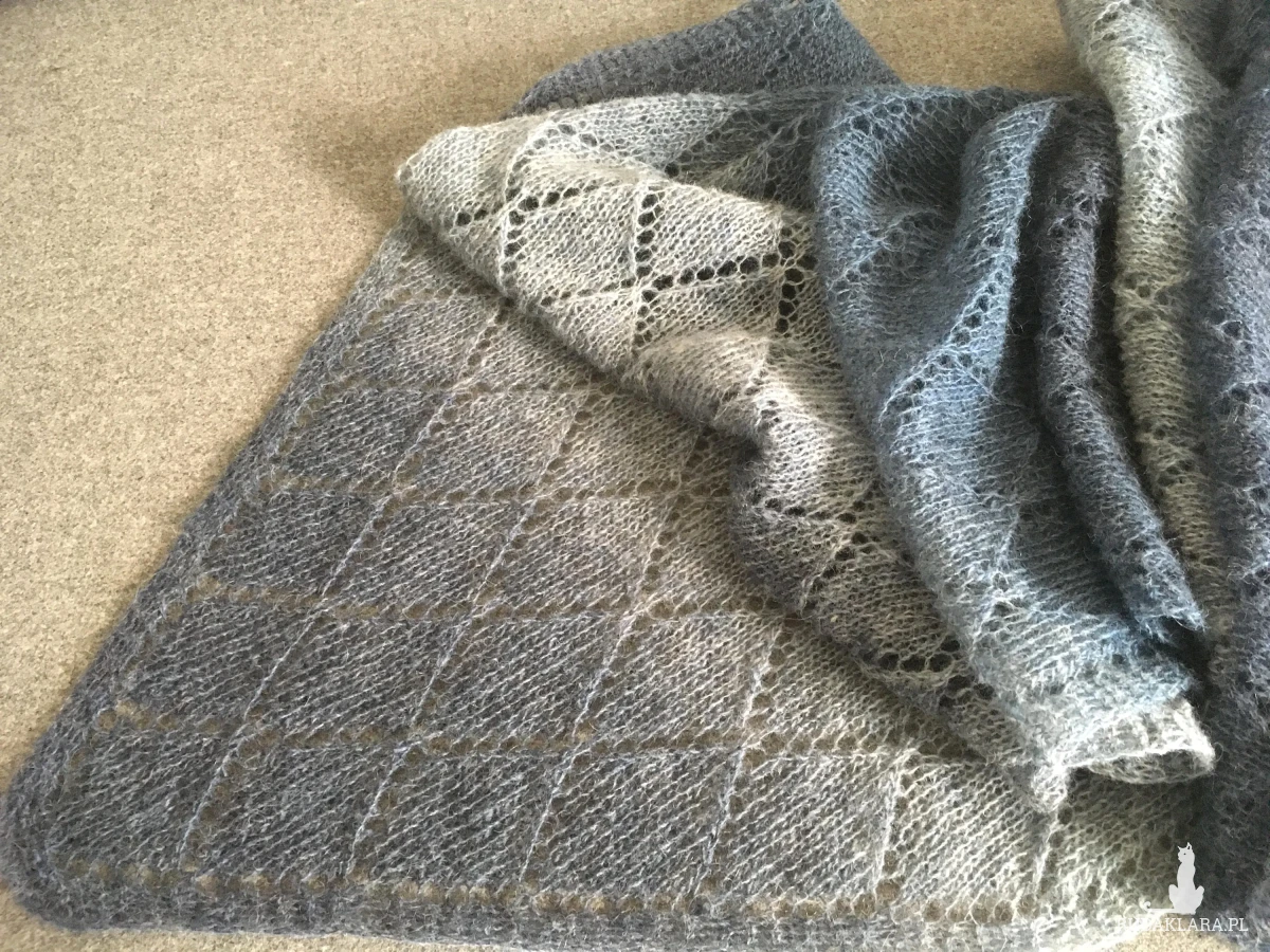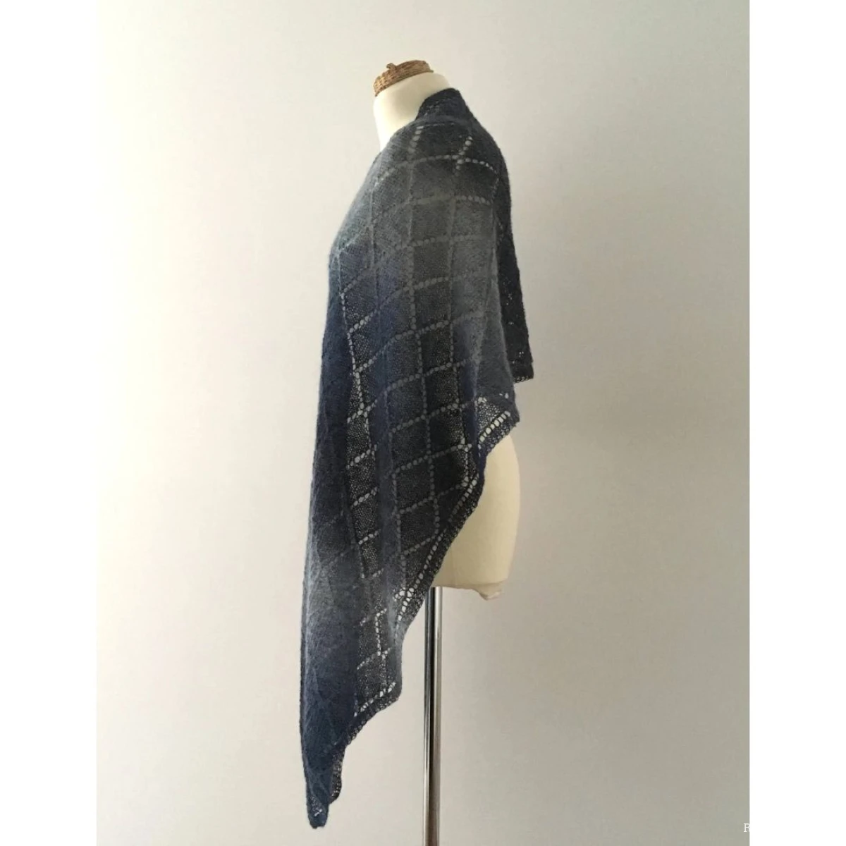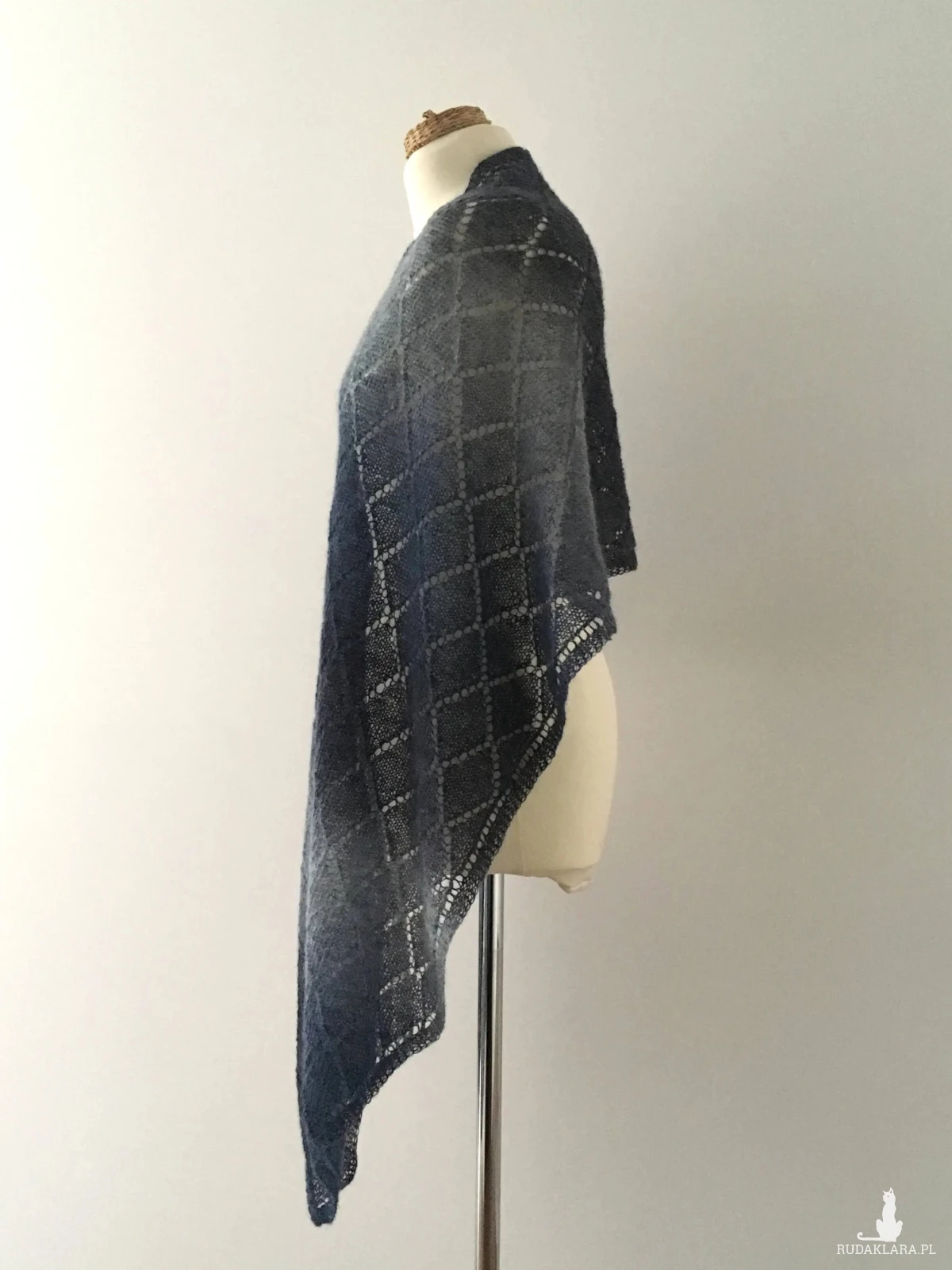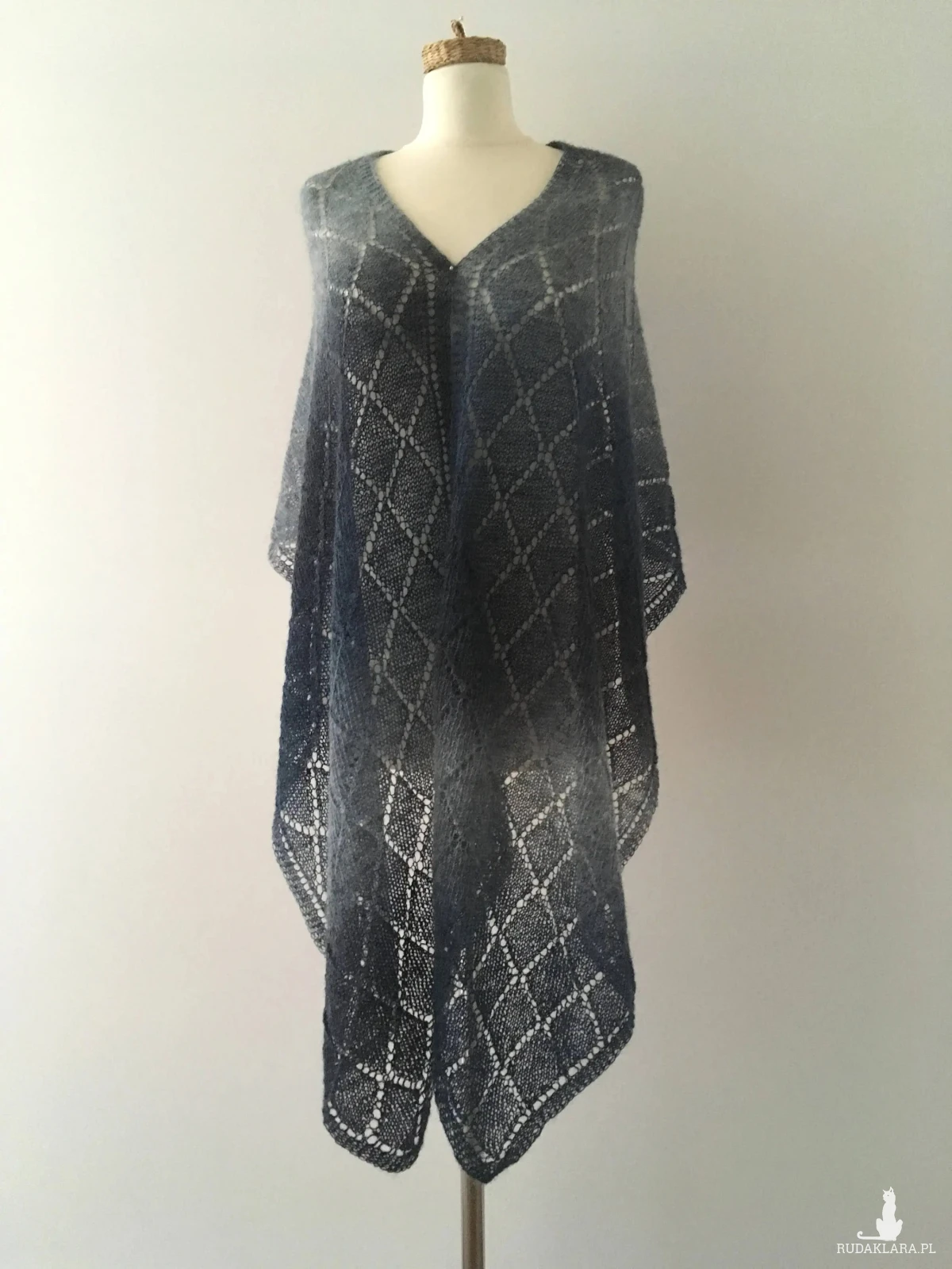 Ten długi wełniany szal został wykonany ręcznie przeze mnie tradycyjnym wzorem koronkowym w romby. Bardzo delikatny, miękki i ciepły szal w kolorze granatowym, szaroniebieskim i denim. Kolory cieniowane, przenikają jeden przez drugi. Szal jest w kształcie wydłużonego rombu, Końce trójkątne.