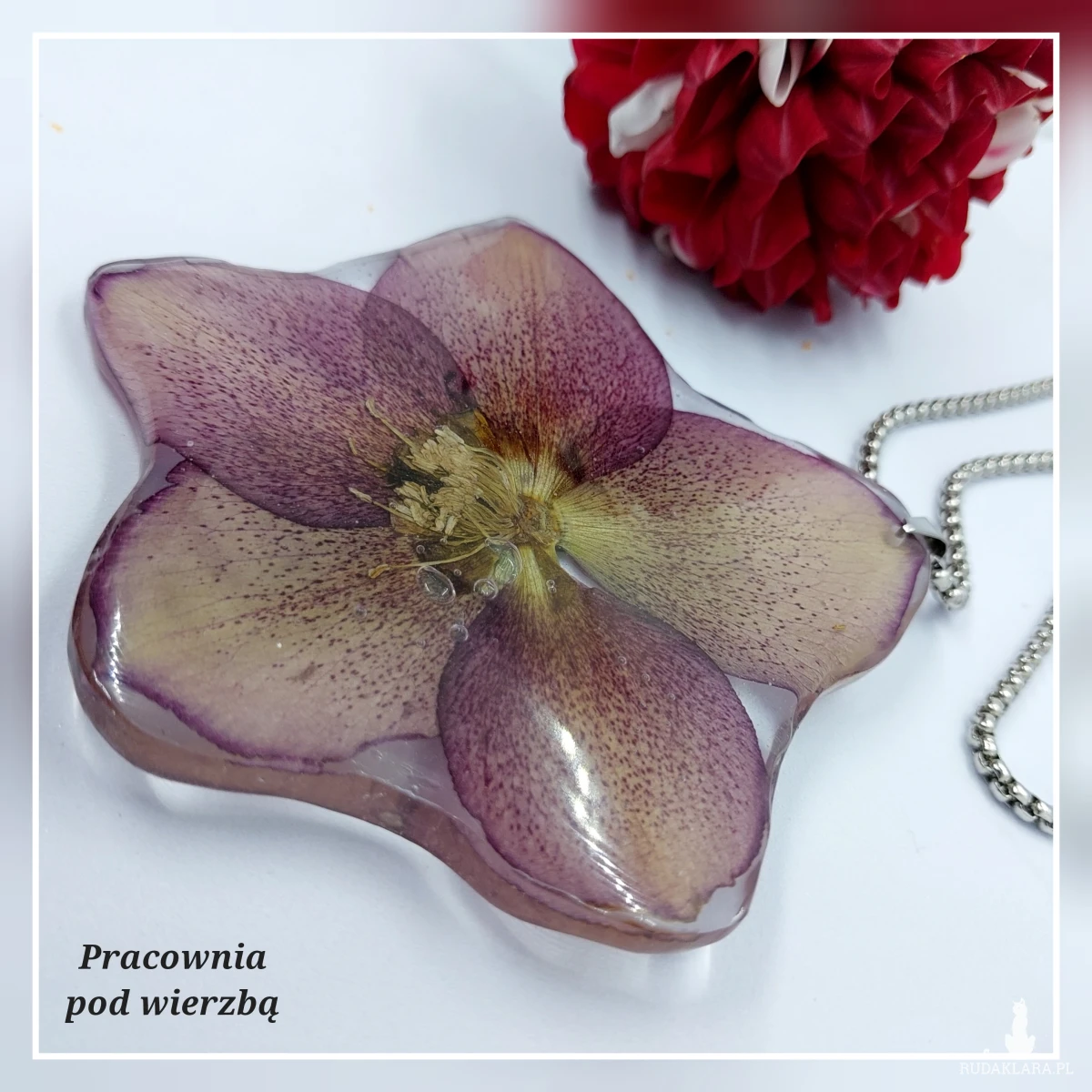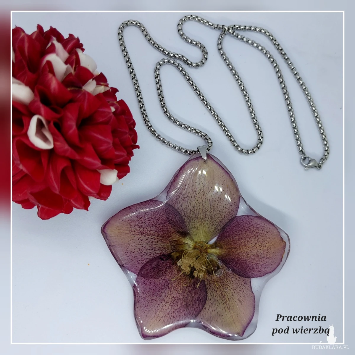 Wyjątkowy duży naszyjnik z prawdziwym kwiatem ciemiernika.