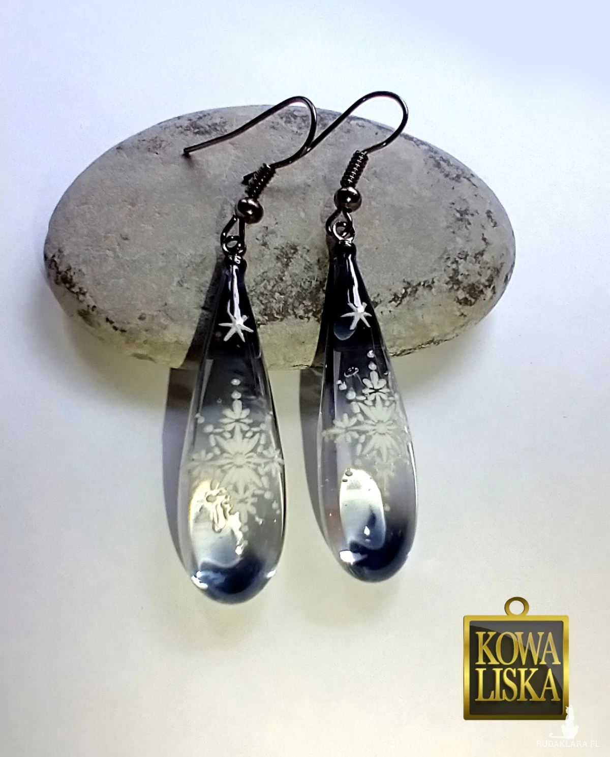 Wąskie, żywiczne sople w krystalicznym, grafitowym kolorze, zostały ozdobione białymi śnieżynkami, co dało mroźny, zimowy klimat.