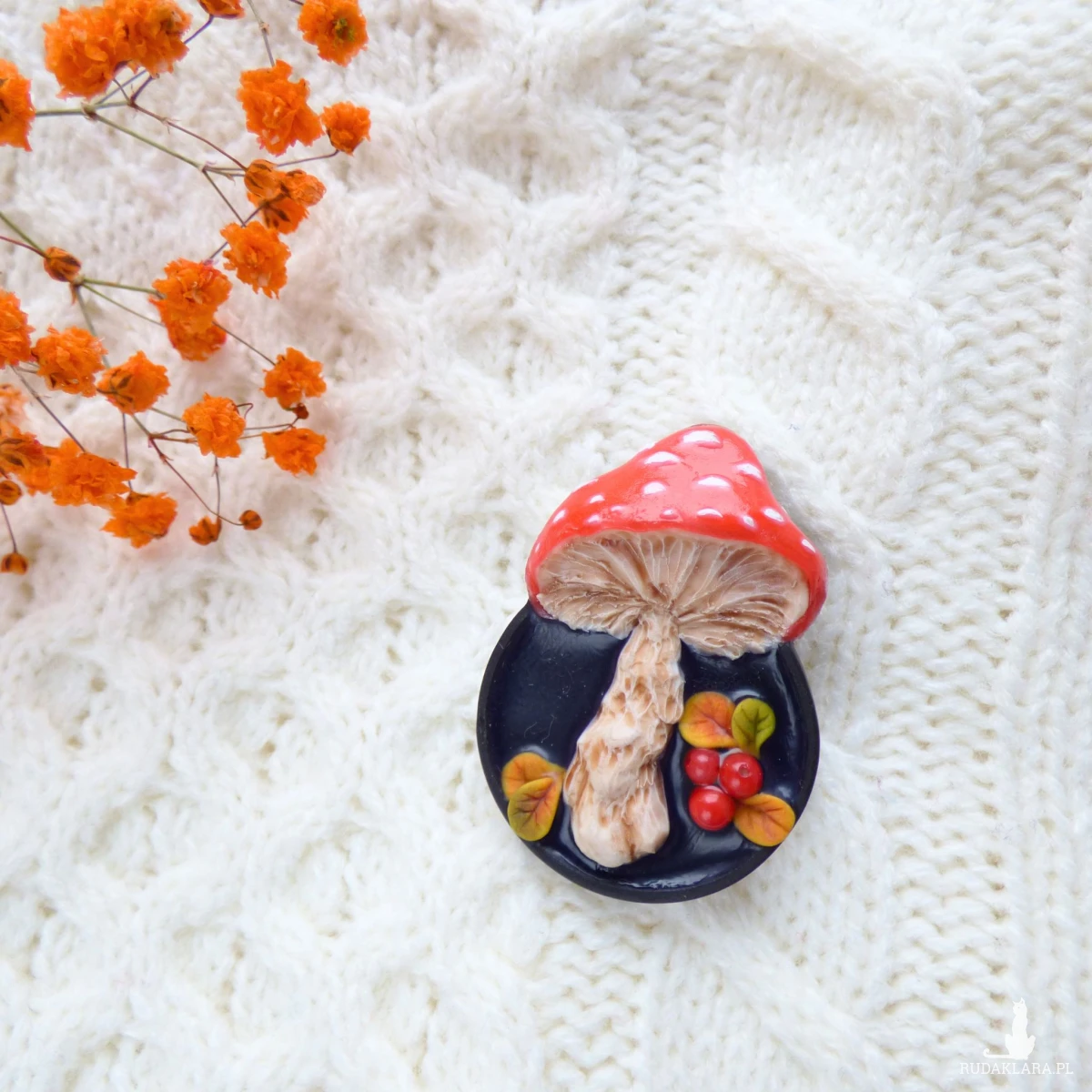 Autorska trójwymiarowa broszka modelowana ręcznie z glinki polimerowej techniką mikrorzeźby. Przedstawia ona muchomora oglądanego „od spodu” – z misternie wyrzeźbionymi blaszkami, mięsistym trzonem i kapeluszem w kolorze jasnej czerwieni z białymi kropkami. Na czarnym, połyskującym tle umieściłam miniaturowe jesienne listki i kulki czerwonego korala naturalnego w roli czerwonych jagód.