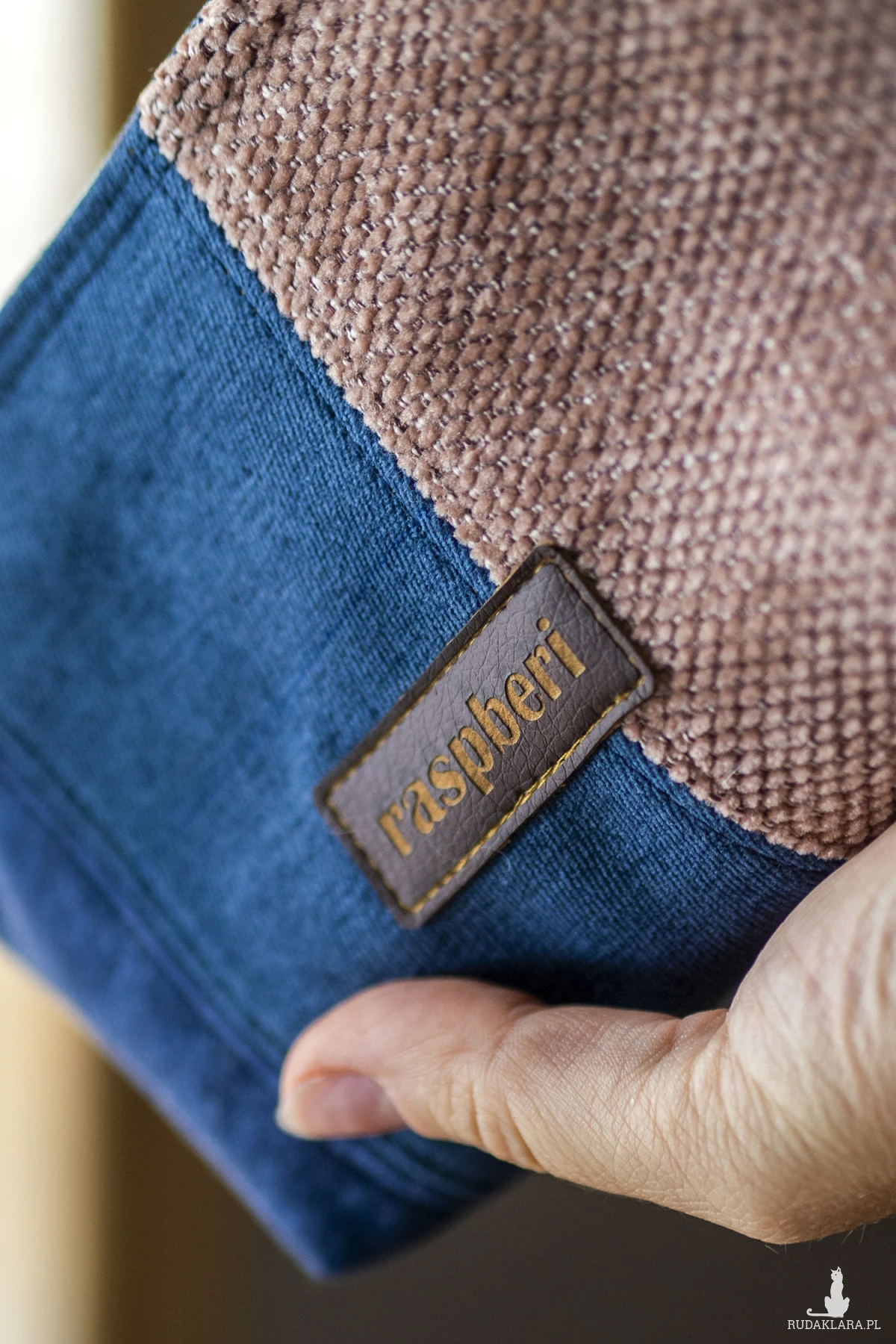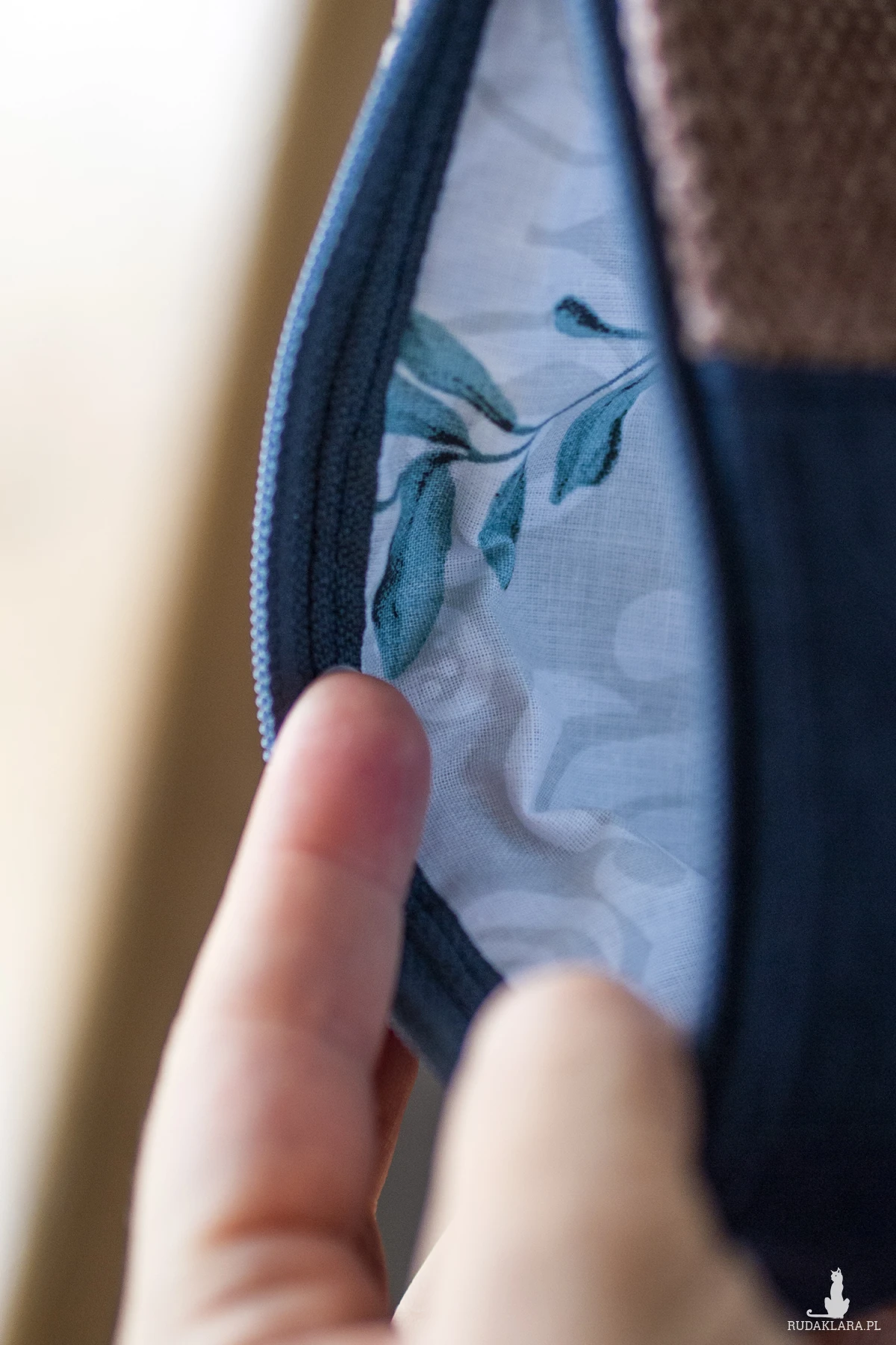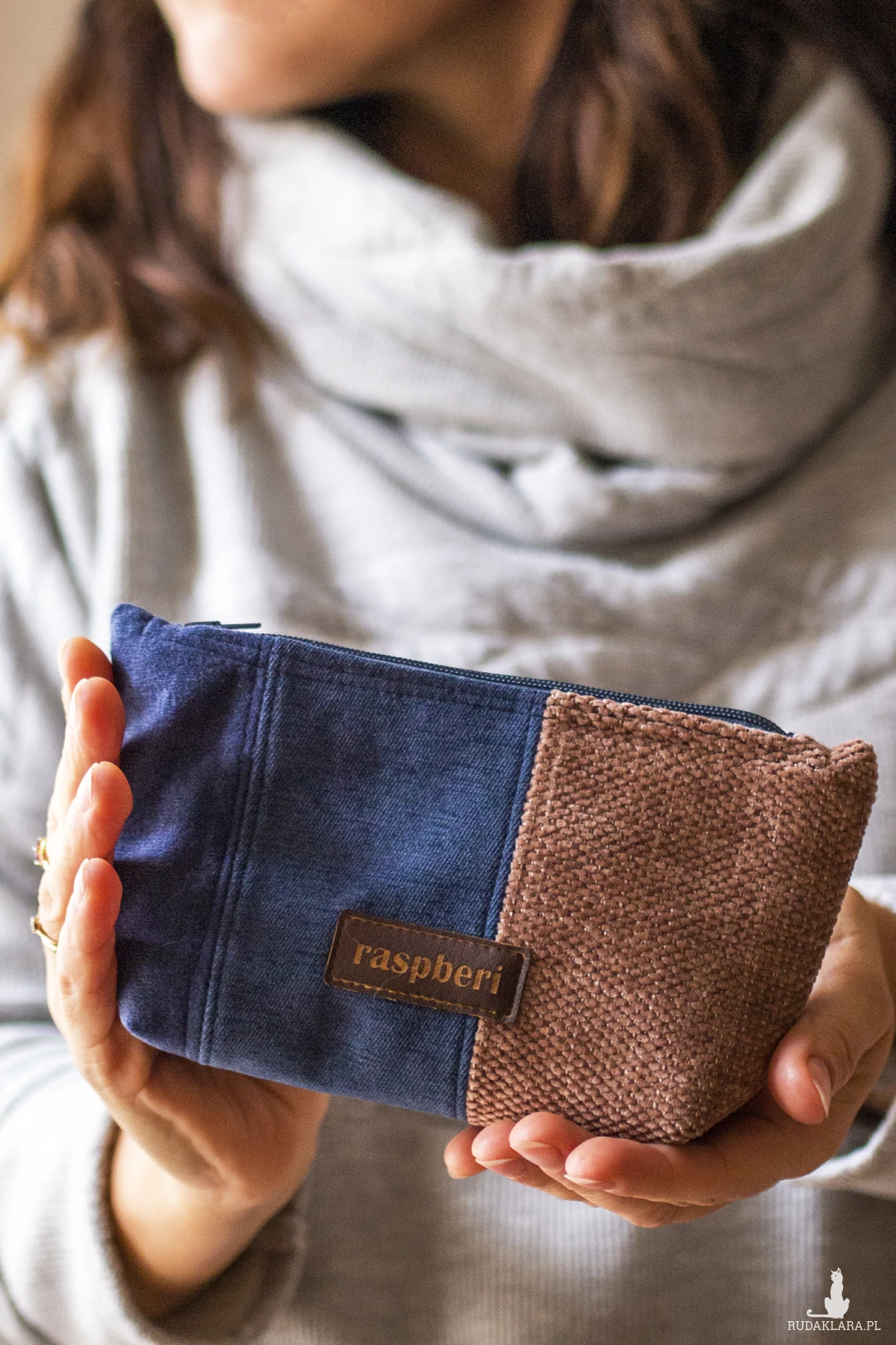 Średniej wielkości kosmetyczka wykonana z kilku rodzajów tkanin w kolorze różowym oraz granatowym.