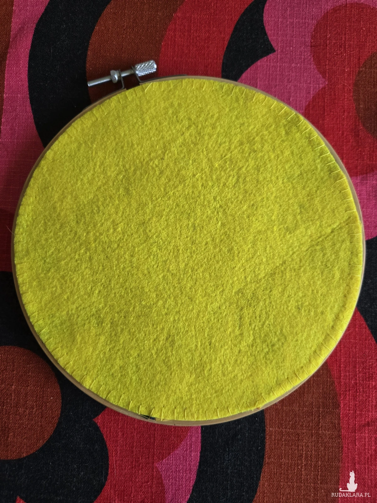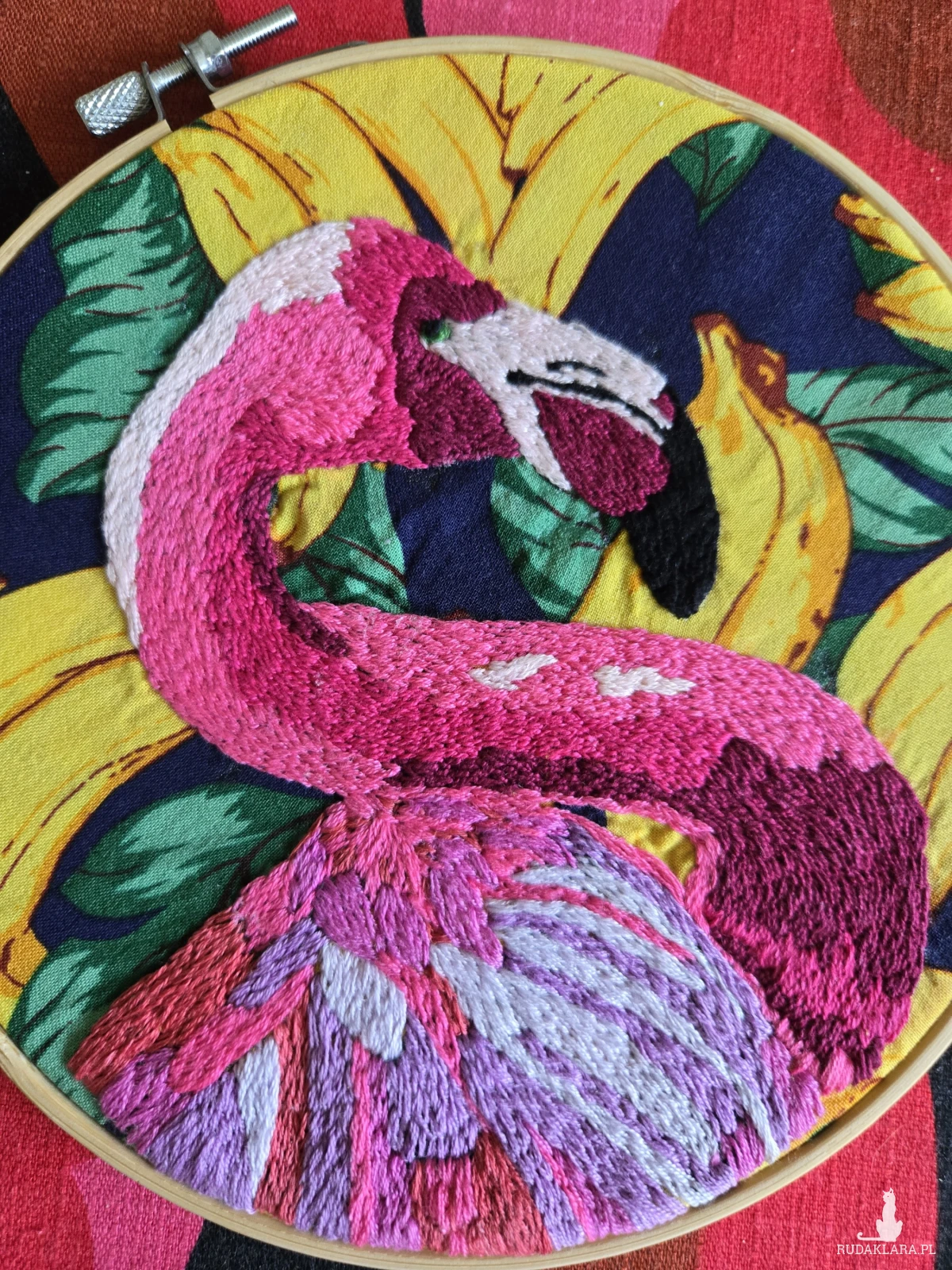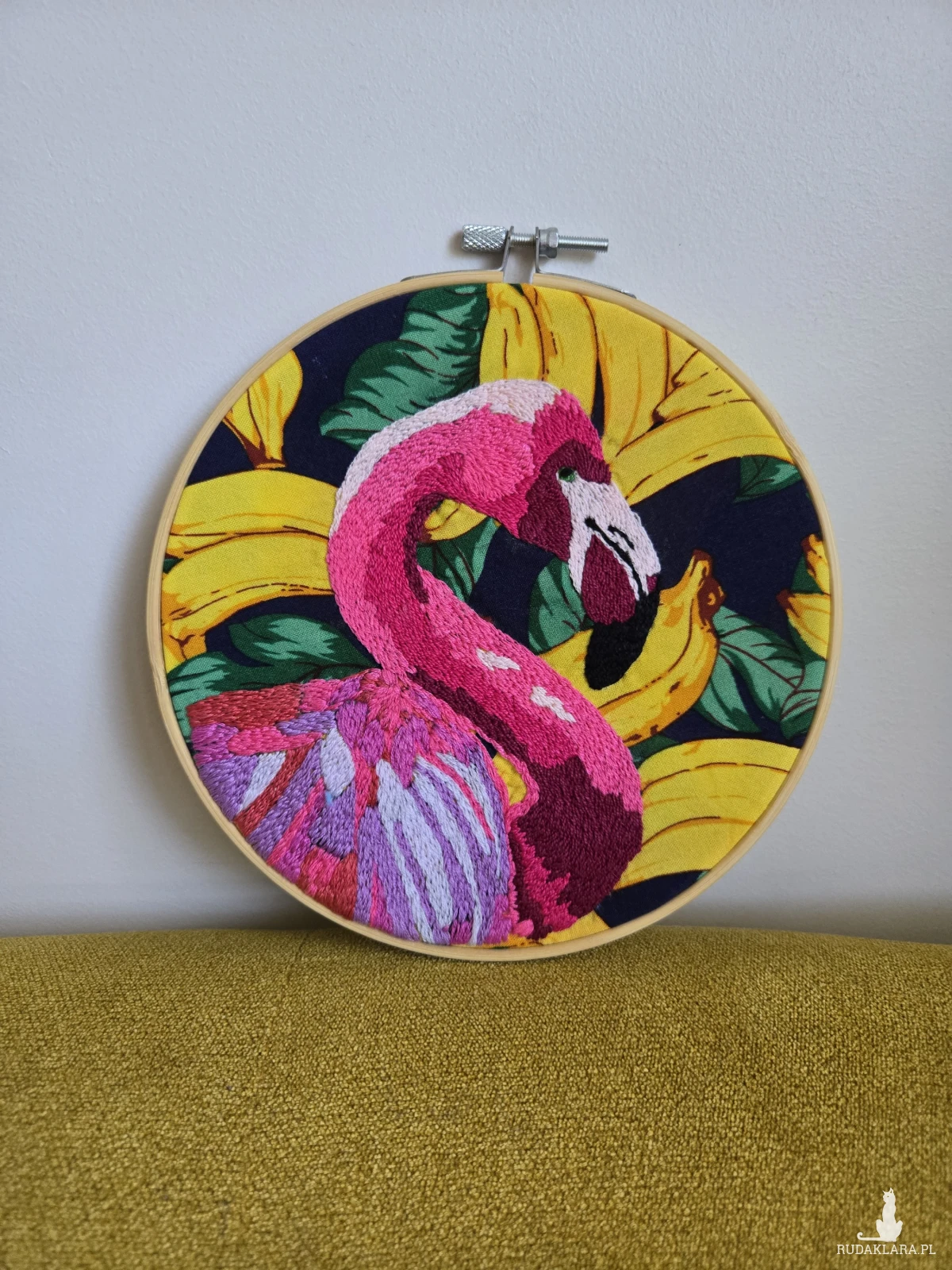 Flaming wyszyty na tkaninie w banany. Umieszczony na tamborku, który służy jako ramka. Podszyty żółtym filcem. Średnica 18cm