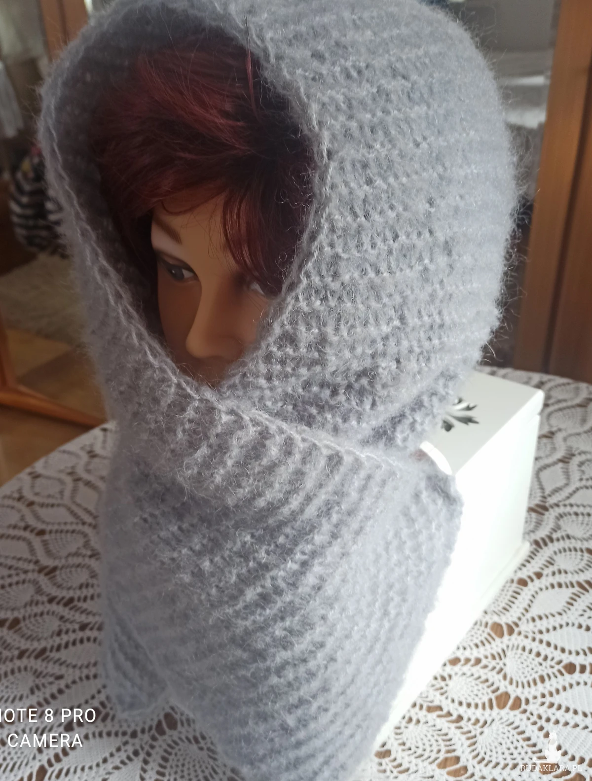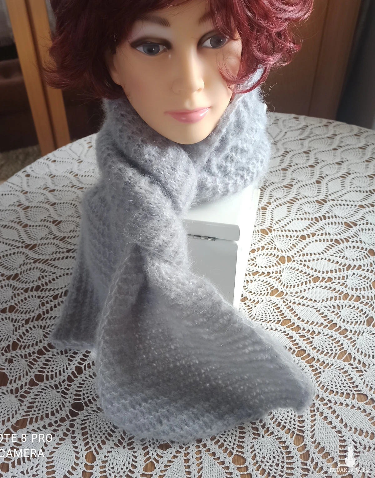 Szal w jasnoszarym kolorze wykonany na drutach z moheru. Wyrób bardzo delikatny, mięciutki i bardzo przyjemny w dotyku. Szal można używać dwojako na głowę i szyję jednocześnie lub tylko na szyję. Całkowita długość 114 cm, szerokość 23,5 cm. Nie rozciąga się ale jest podatny na wydłużenie. Wykonany ściegiem francuskim. Przy różnej pogodzie można wykorzystać wyrób jako tradycyjny szalik, chusta na bluzkę lub bezpośrednio na głowę lub na czapkę z daszkiem. Doskonały dodatek na chłodniejszą lub nawet zimną pogodę. Kolor bardzo modny. Pranie wyłącznie ręczne , w temperaturze do 30 stopni. Gorąco polecam, niska cena.