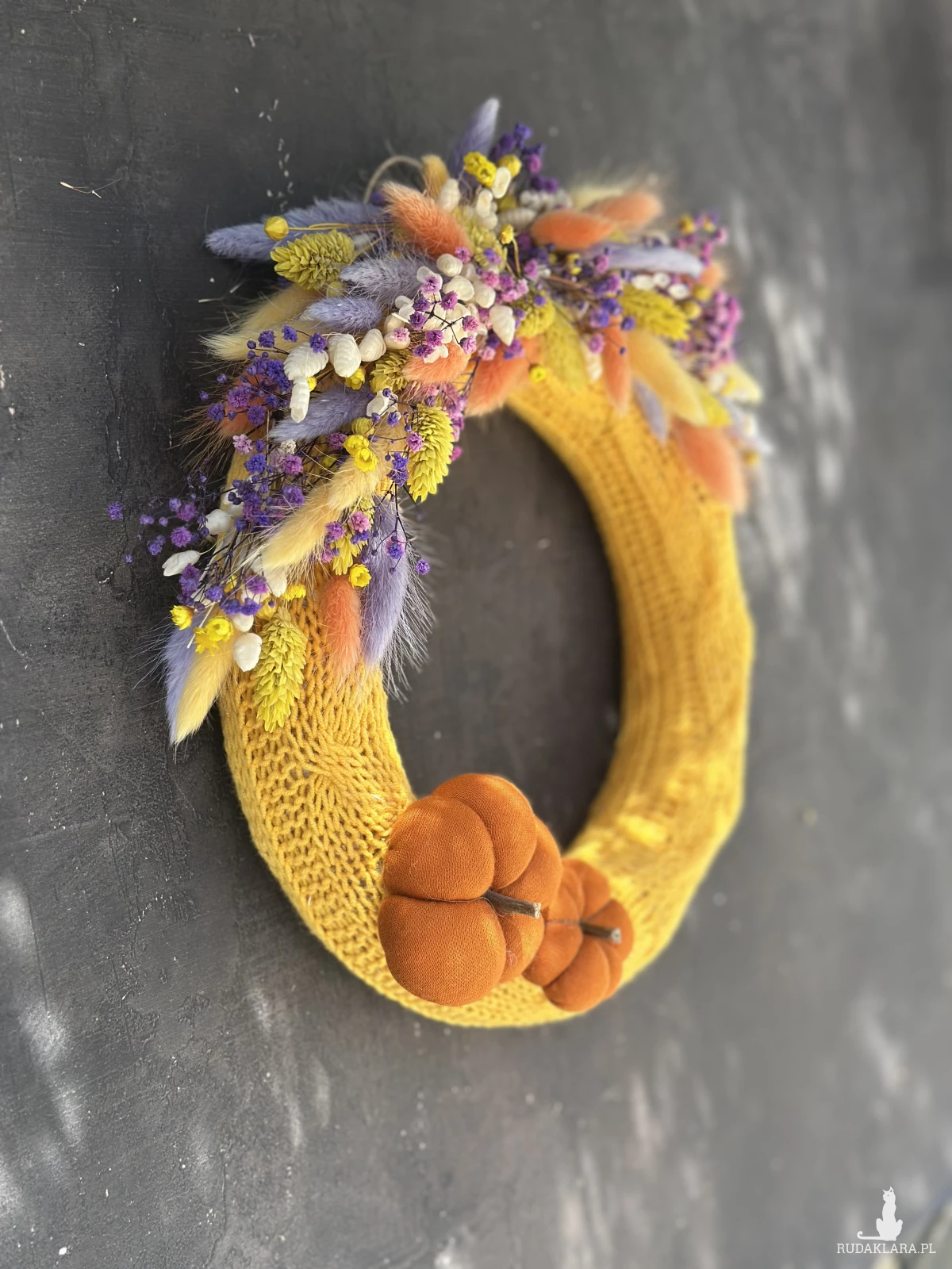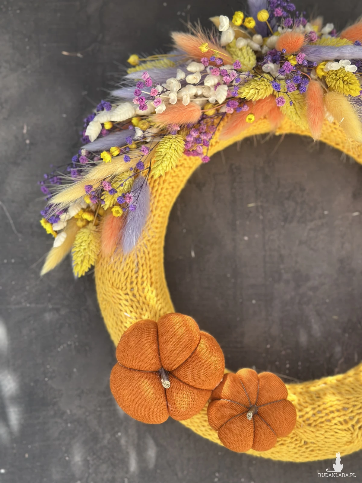 Wianek w ręcznie robionym, żółtym sweterku z włóczki, ozdobiony naturalnymi, suszonymi kwiatami.