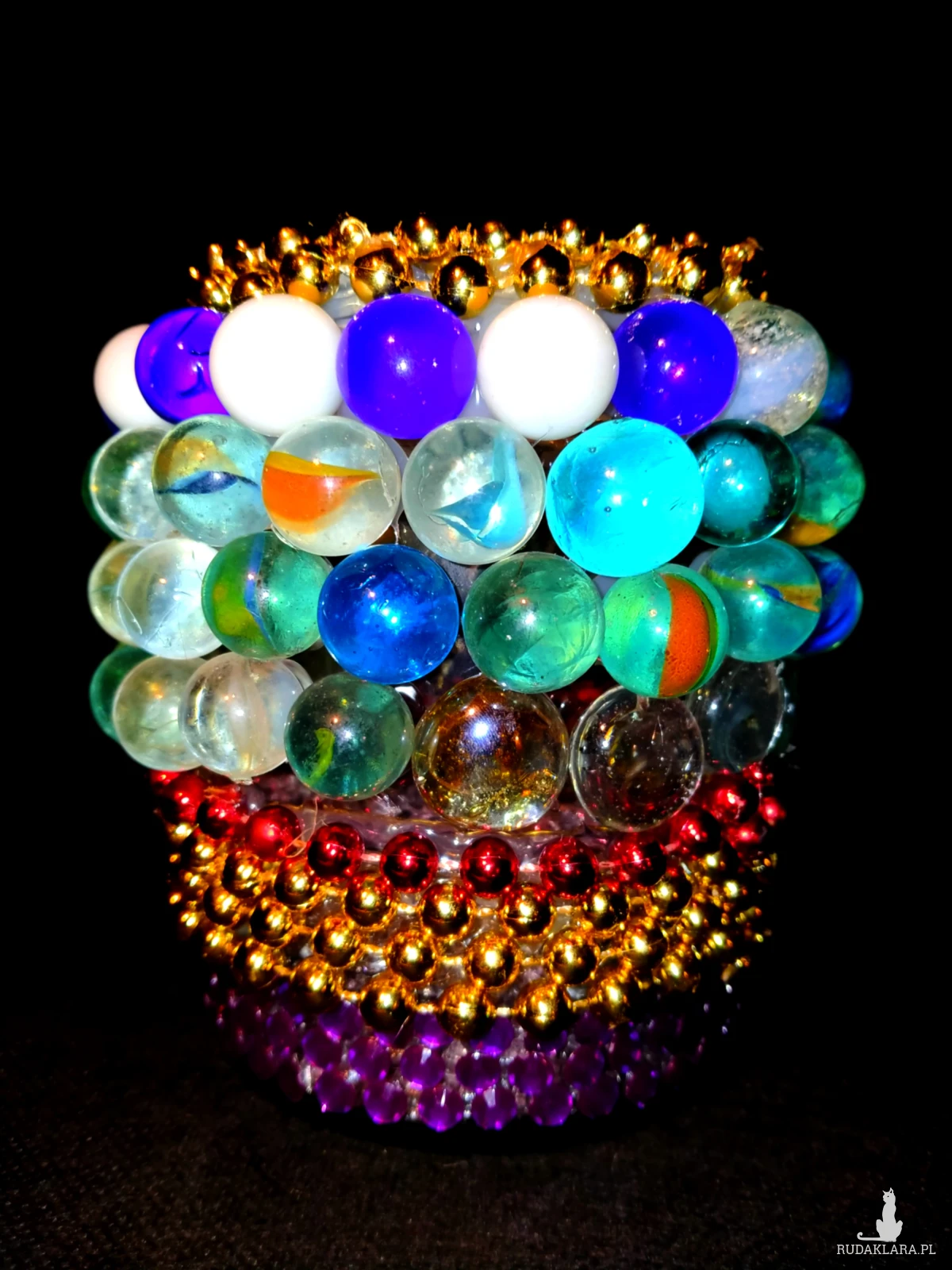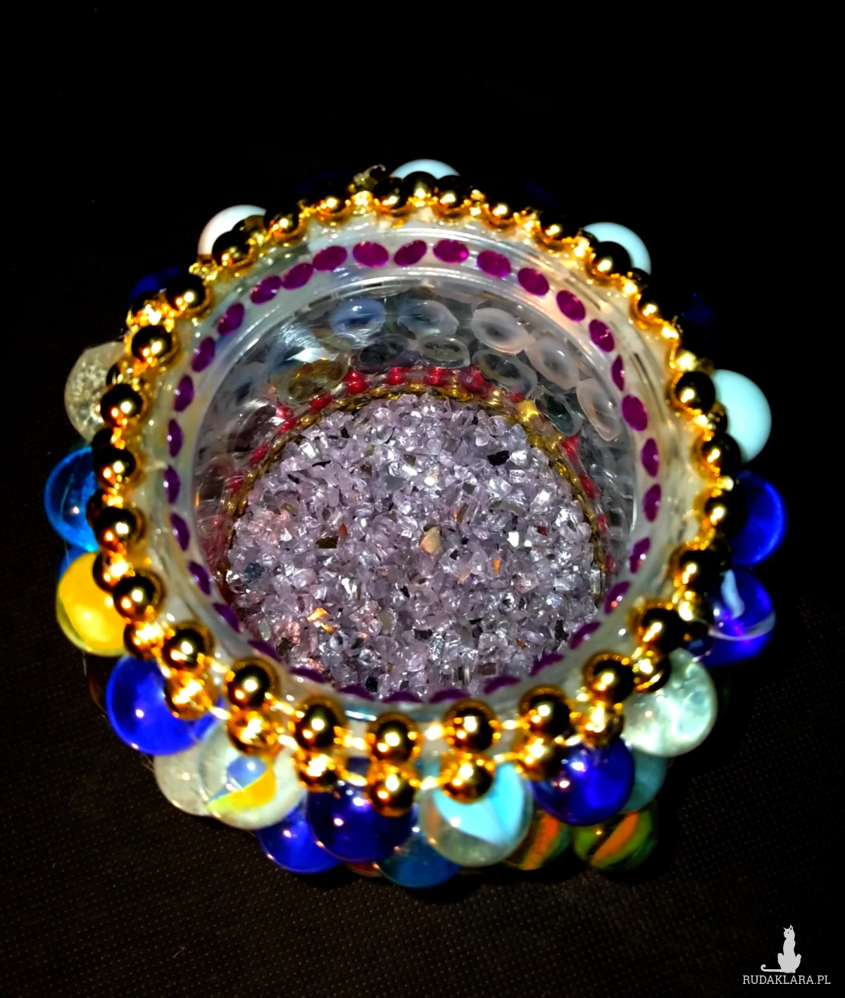 kolorowych kulek i błyszczących dżecików dekoracyjnych, do środka wspypane jest tzw. piasek szklany dekoracyjny.